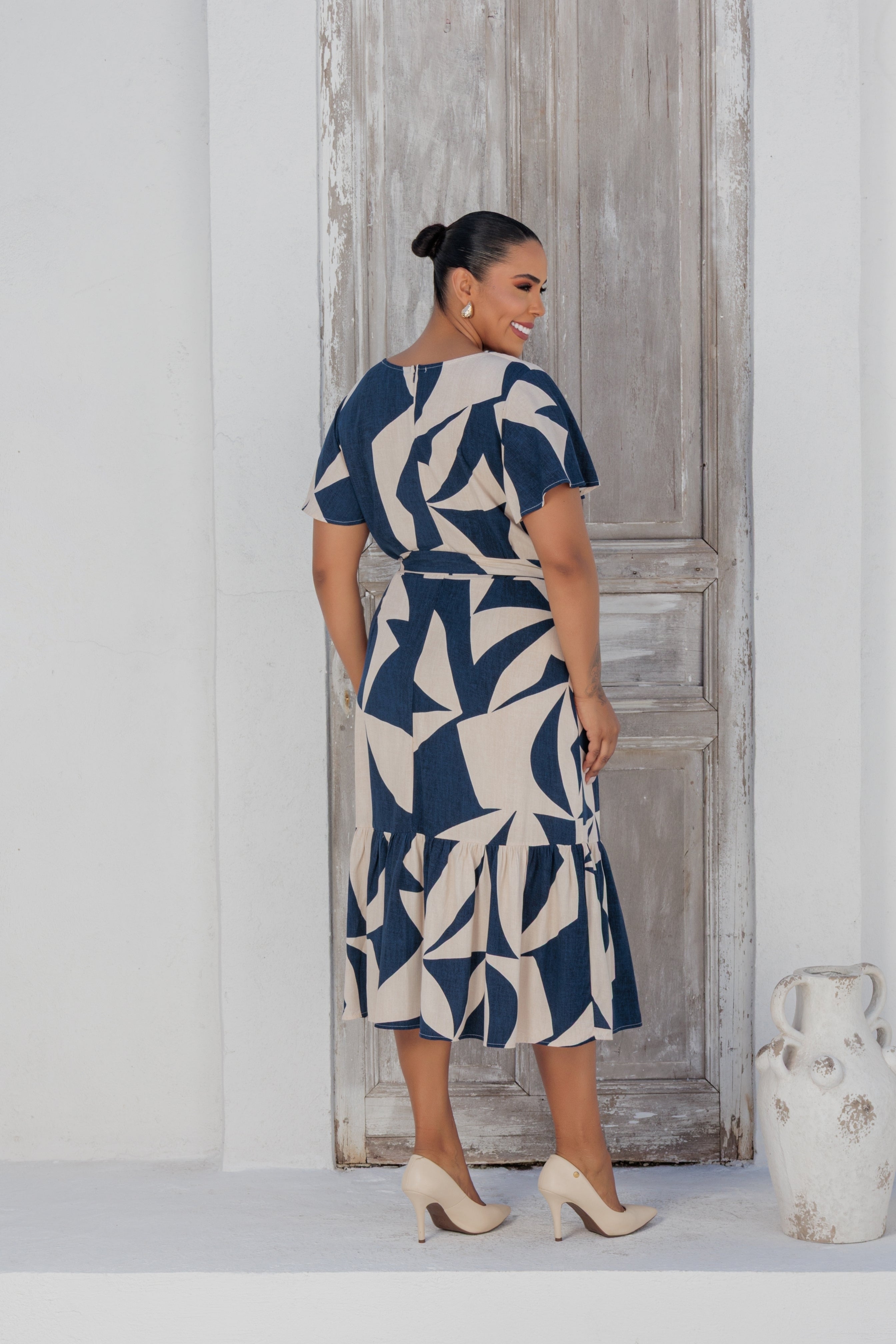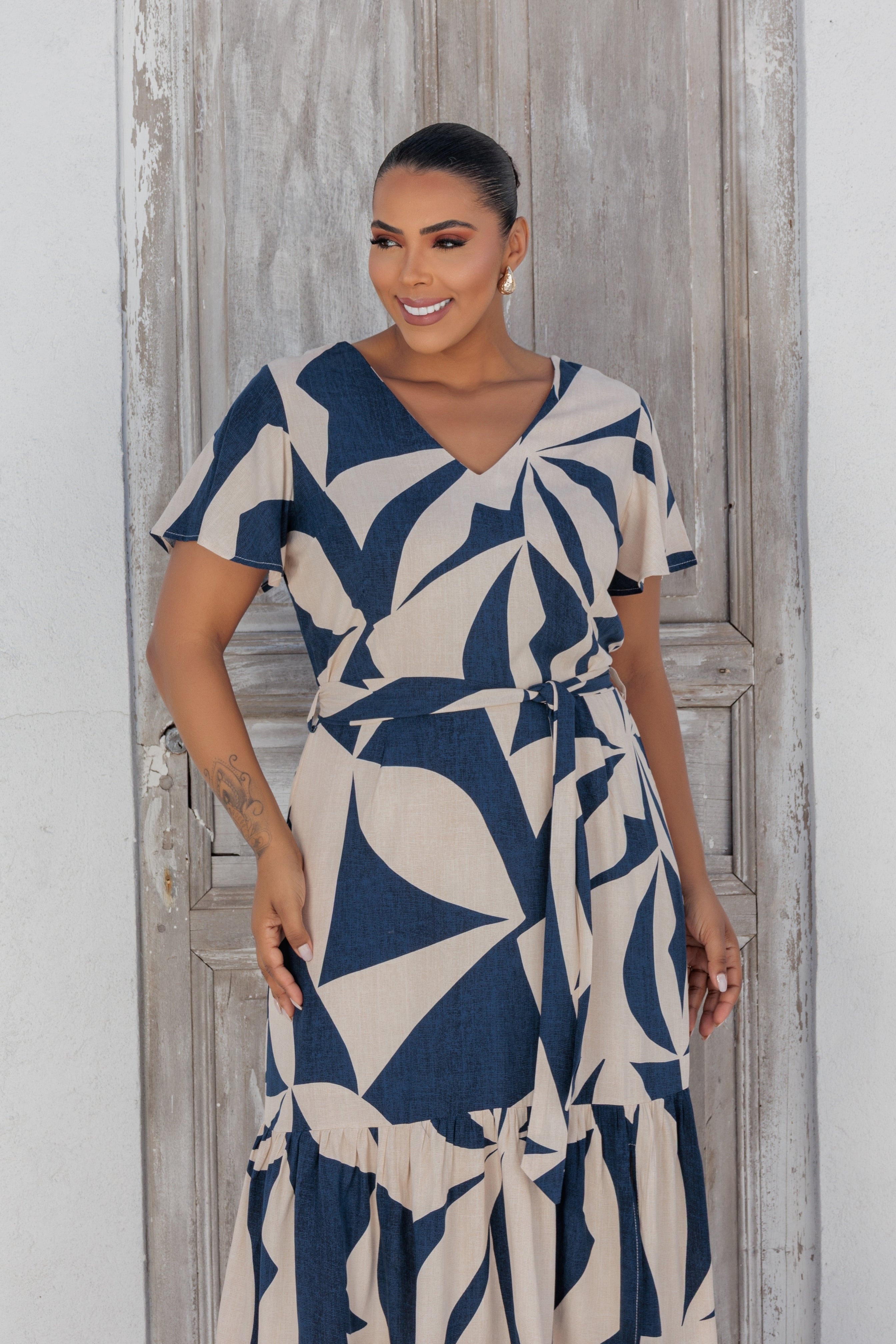 Vestido Plus estampado, comprimento longo com decote quadrado. Tem detalhes de babados na manga e na barra. É uma peça acinturada tendo elástico na cintura e faixa do mesmo tecido para amarração. Confeccionada no Viscose, possui forro