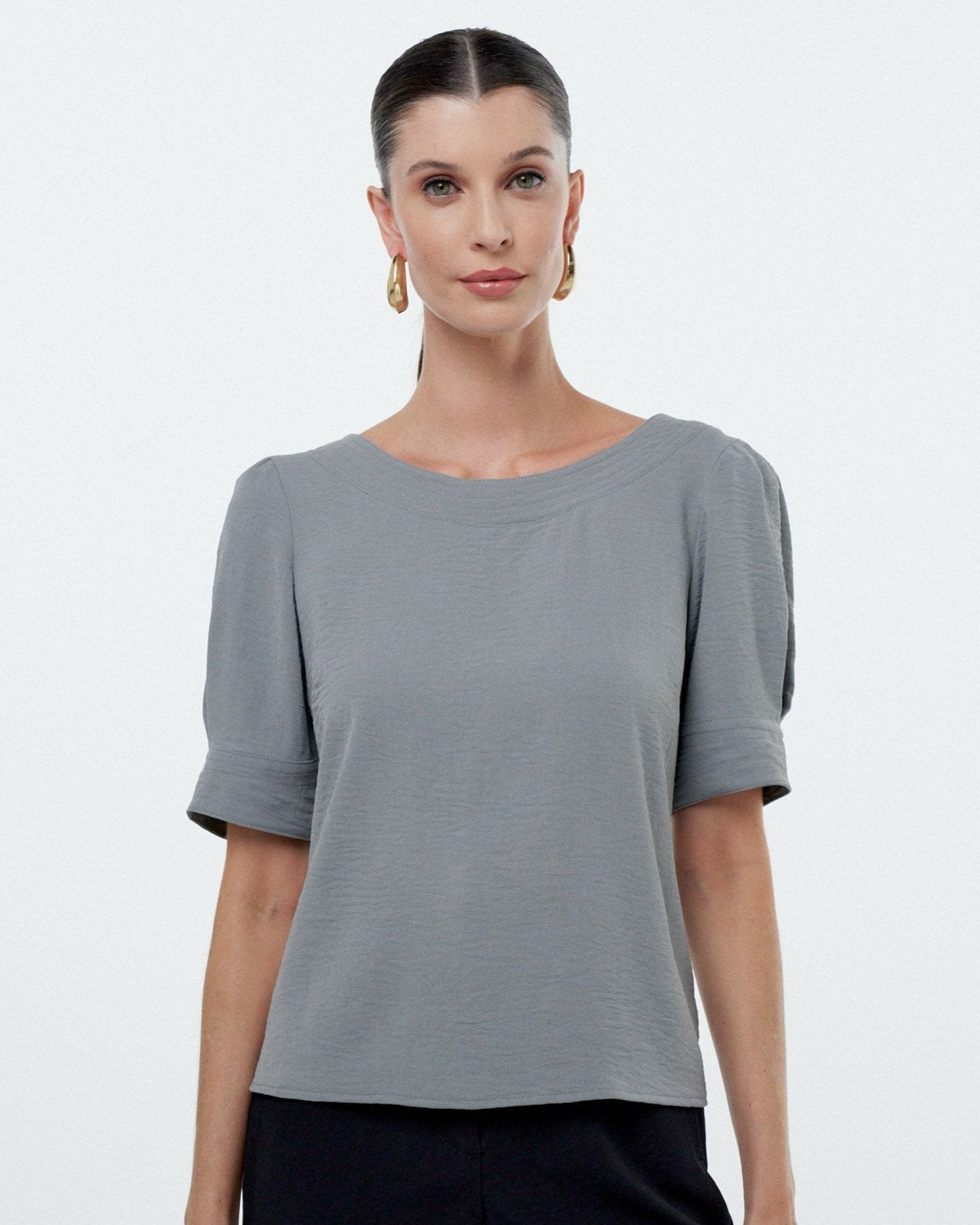 A blusa é básica conferindo um visual elegante e charmoso. As mangas bufantes são um destaque da blusa, adicionando volume e um toque romântico ao visual. A peça é versátil e pode ser usada em várias ocasiões, seja para o dia a dia ou eventos casuais.