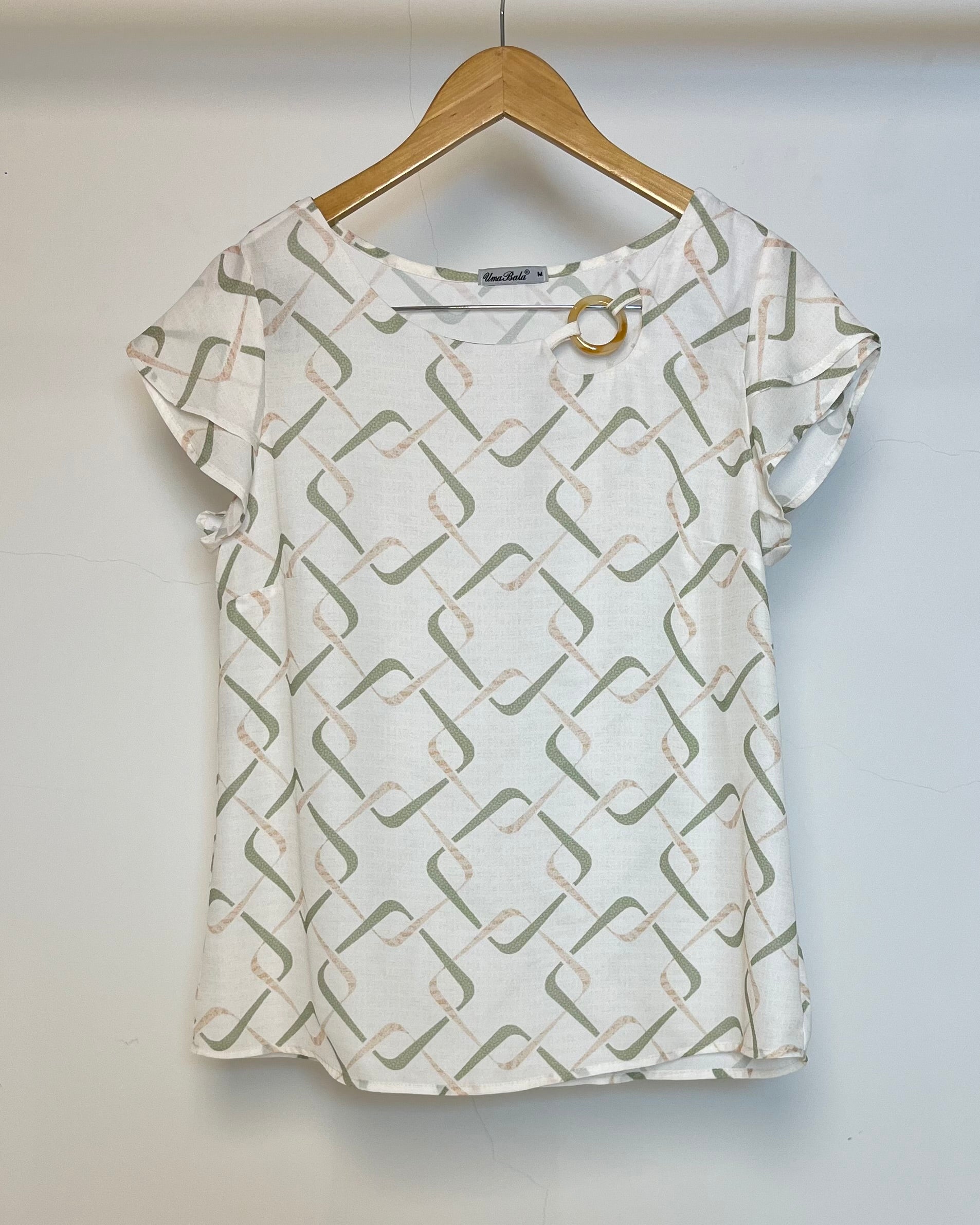 Blusa estampada solta, com decote redondo e detalhe de argola. Uma peça chic e sofisticada.