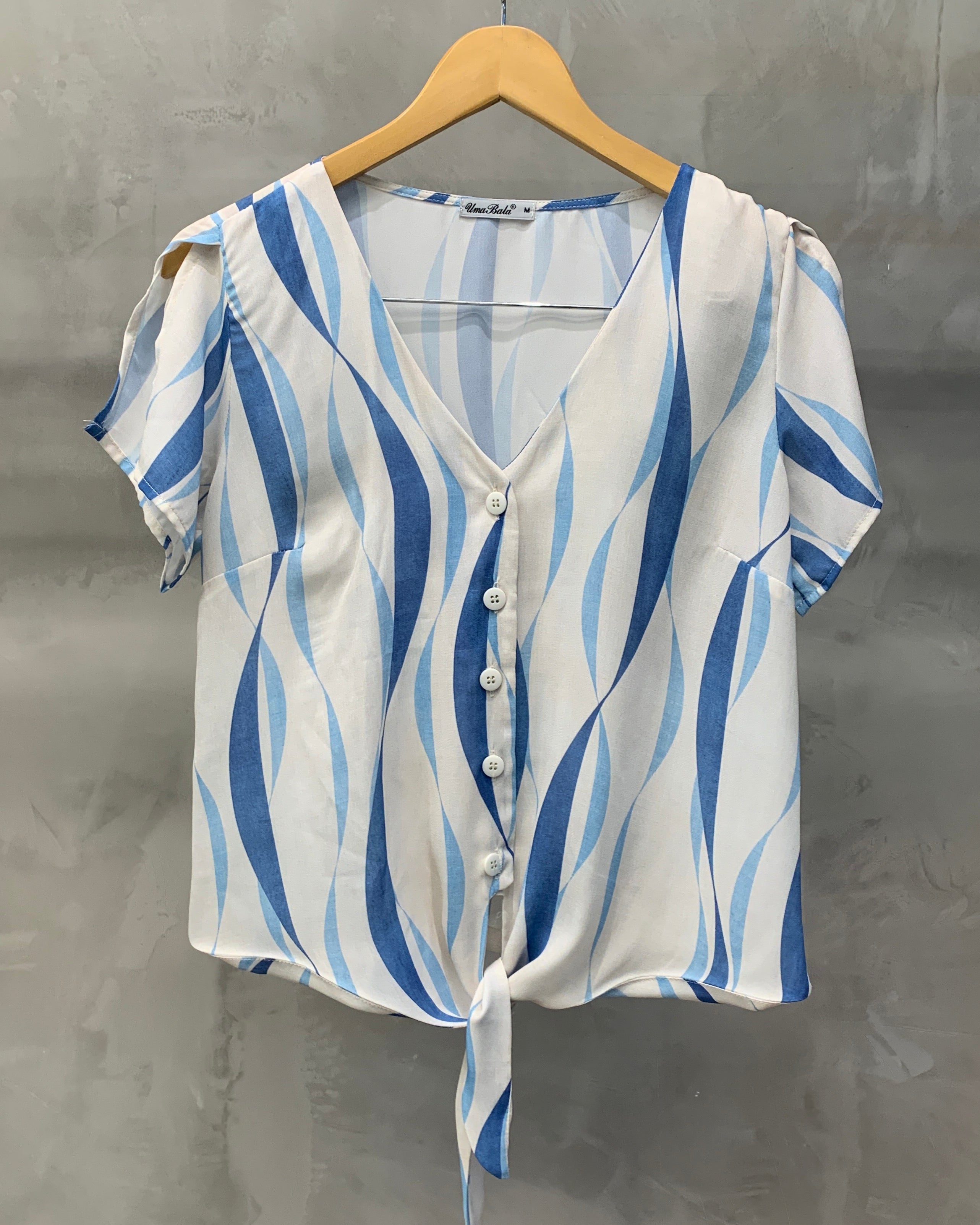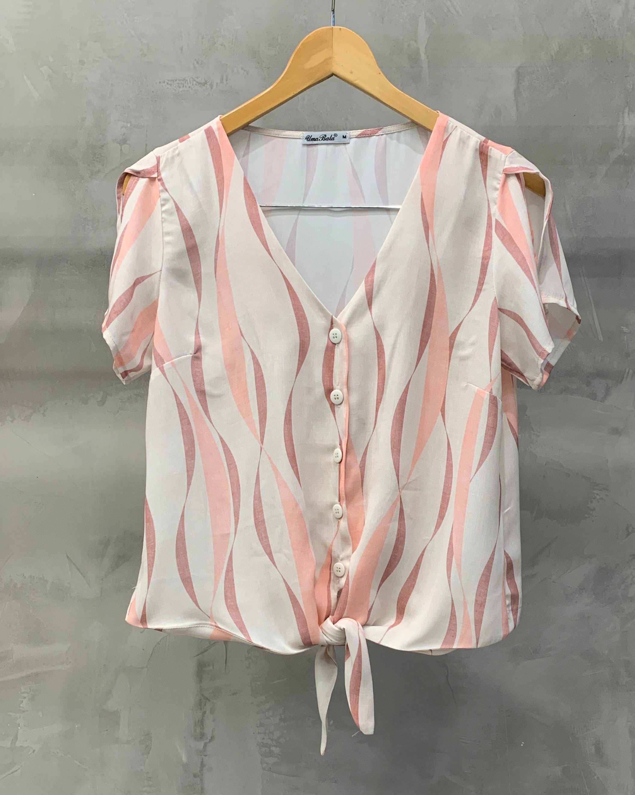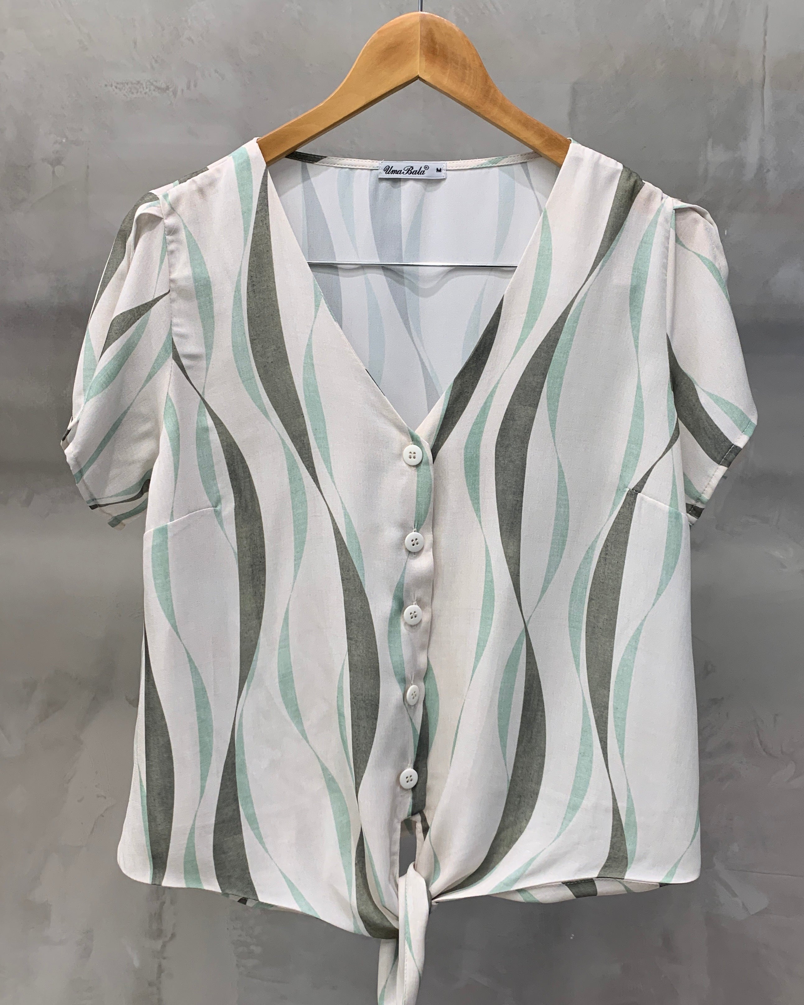 Blusa estampada de manga curta com recortes, decote V, botões e amarração frontal. Uma peça para você se sentir chic sem sair do conforto! Confeccionado no crepe estampado.