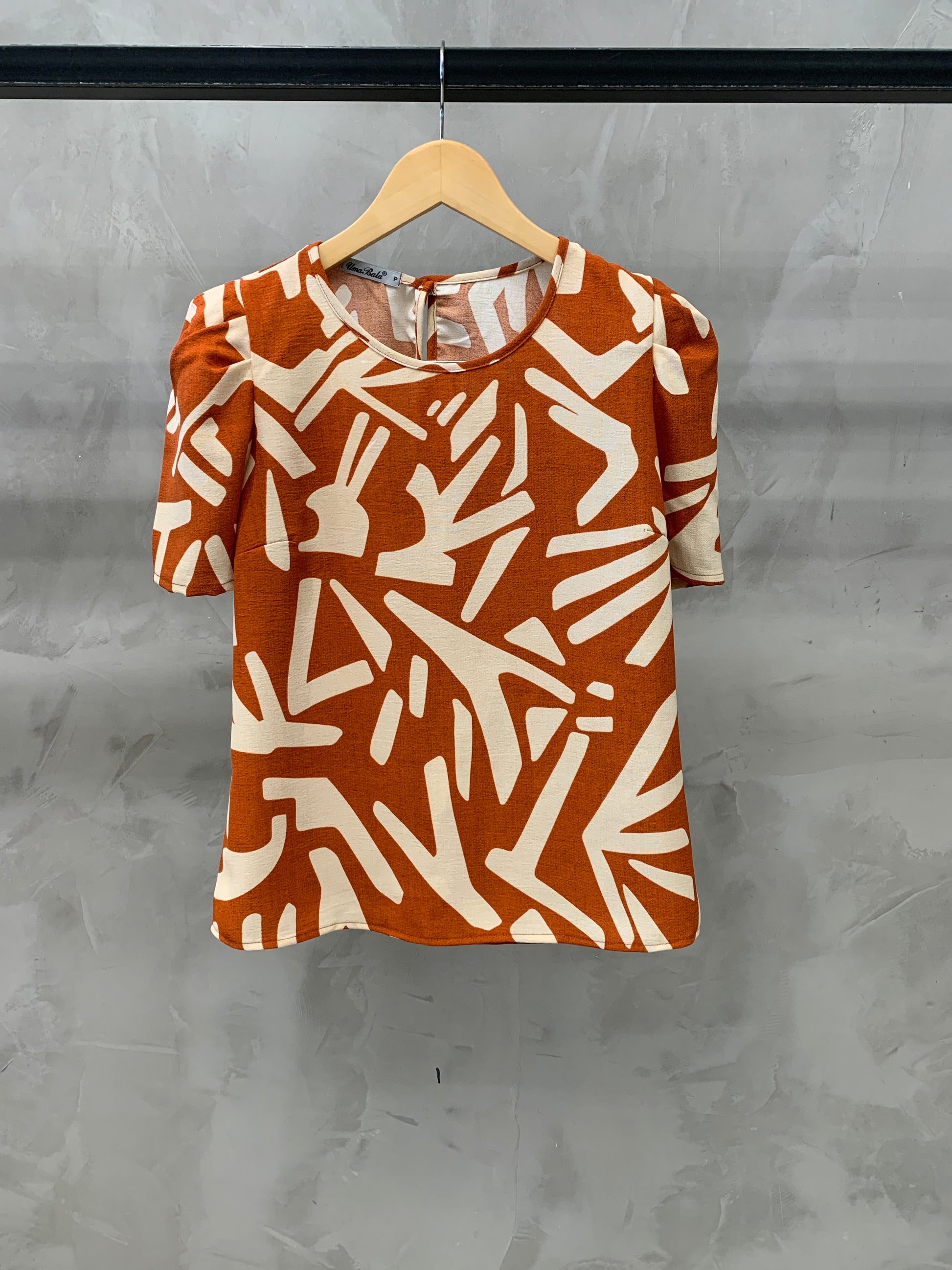 Blusa estampada, com ombreiras estruturadas que valorizam a silhueta. Possui decote redondo, mangas curtas e modelagem reta, unindo estilo e elegância em uma peça versátil.
