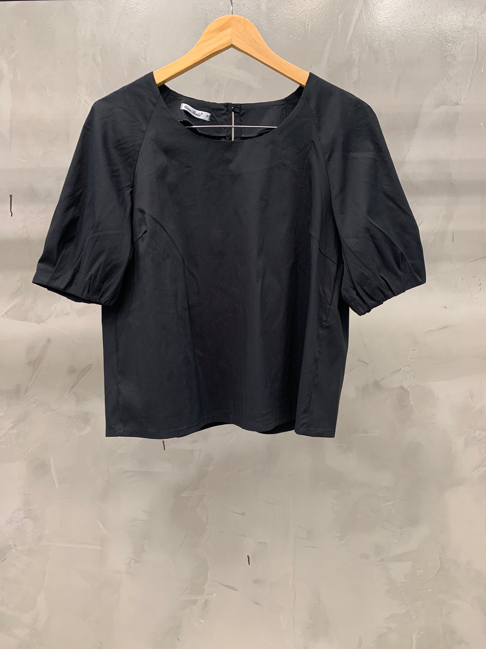 Blusa lisa, manga curta bufante com decote redondo e comprimento médio. É confeccionado no tecido de Tricoline, aquele tecido chic que deixa a peça básica mais arrumada.