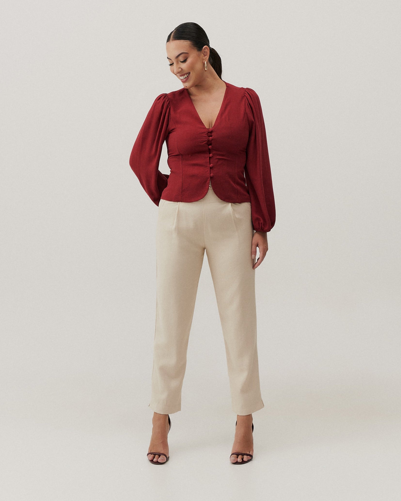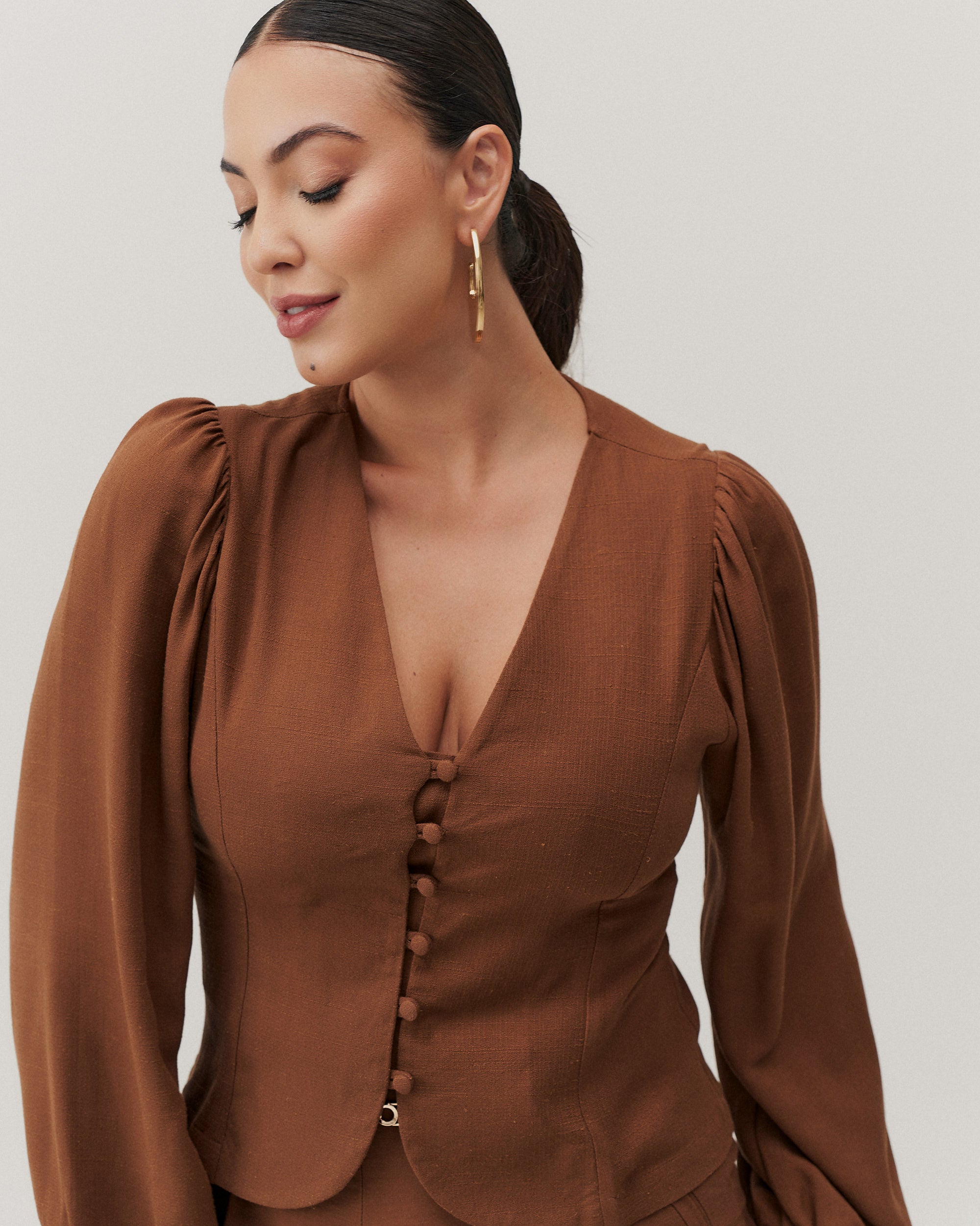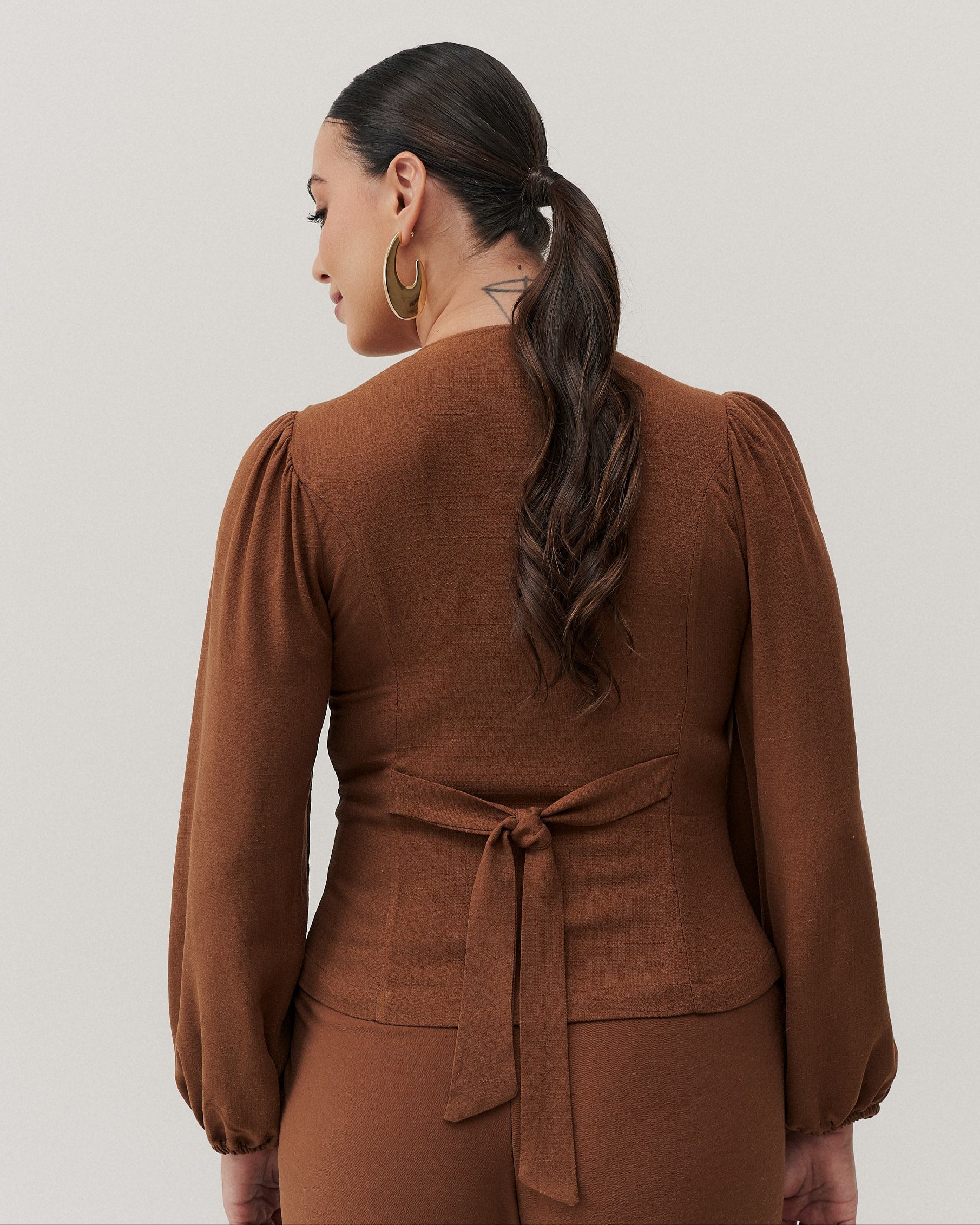 Blusa lisa acinturada com manga bufante e detalhe de botões forrados. É uma peça clássica e romântica, podendo dar um toque feminino no look.