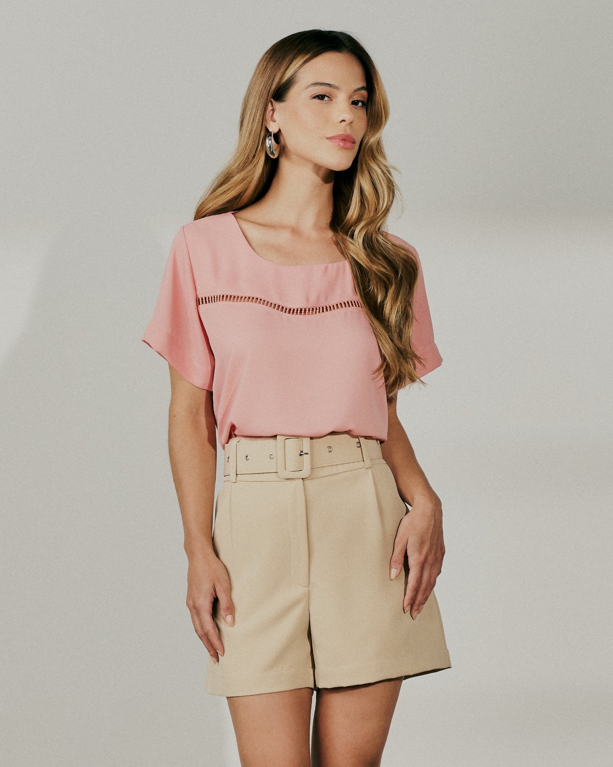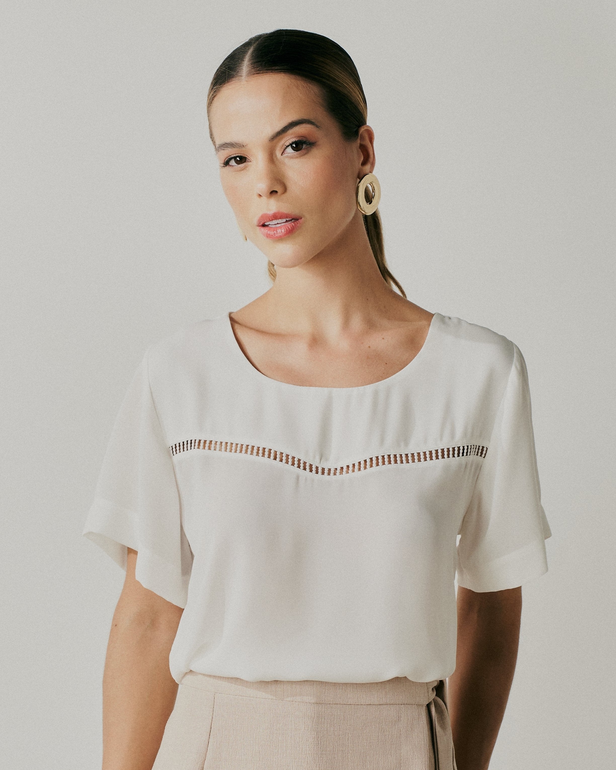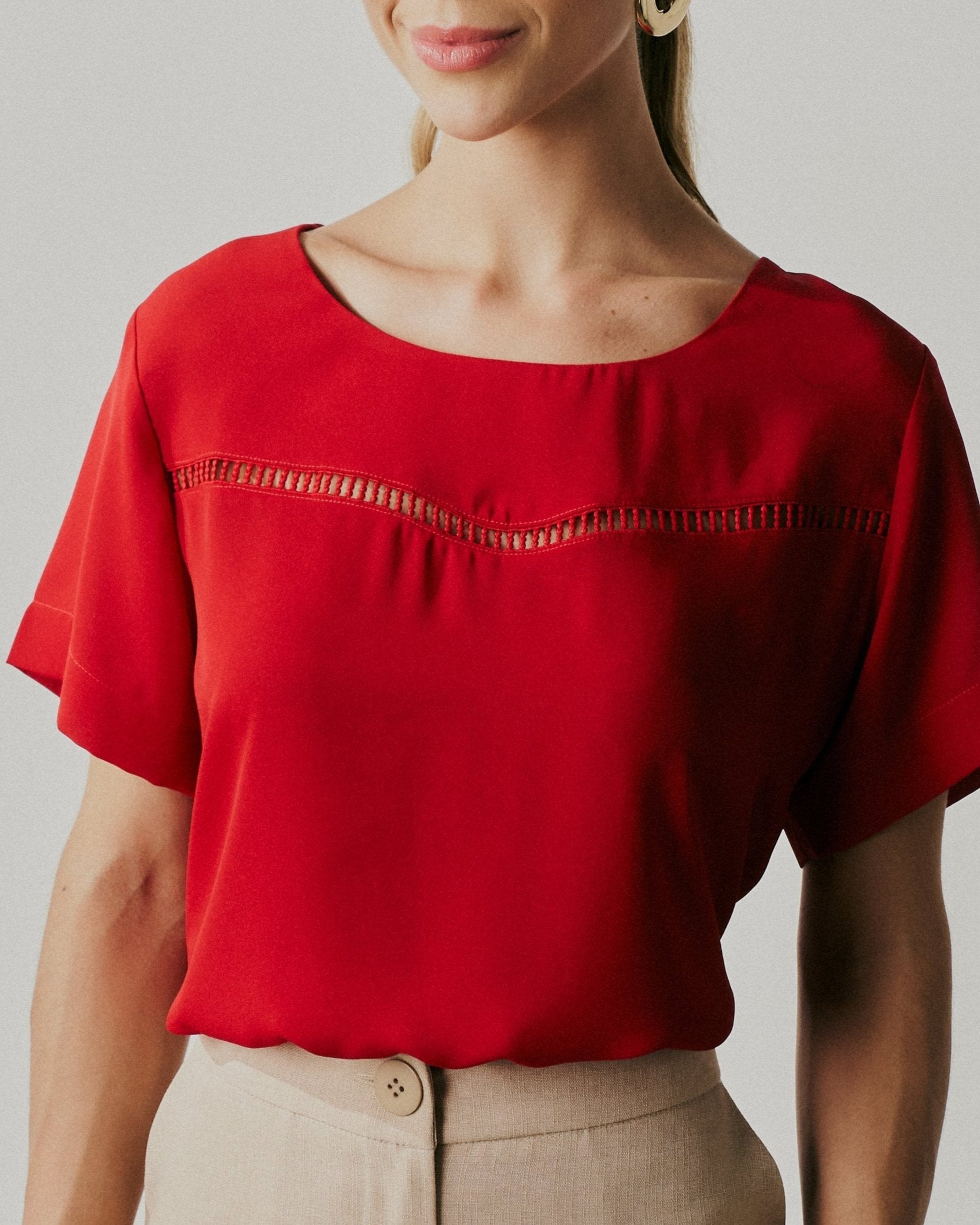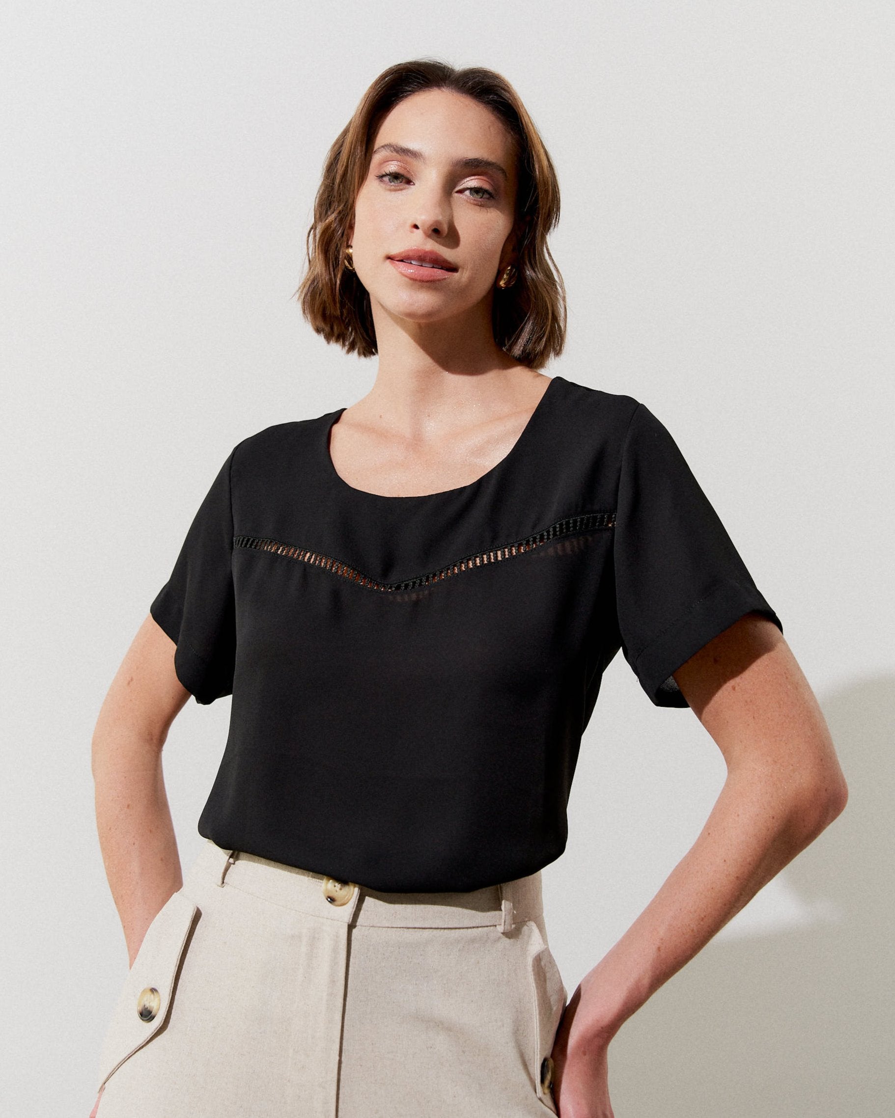 Blusa Manga Curta Com Detalhe de Renda Na Frente.