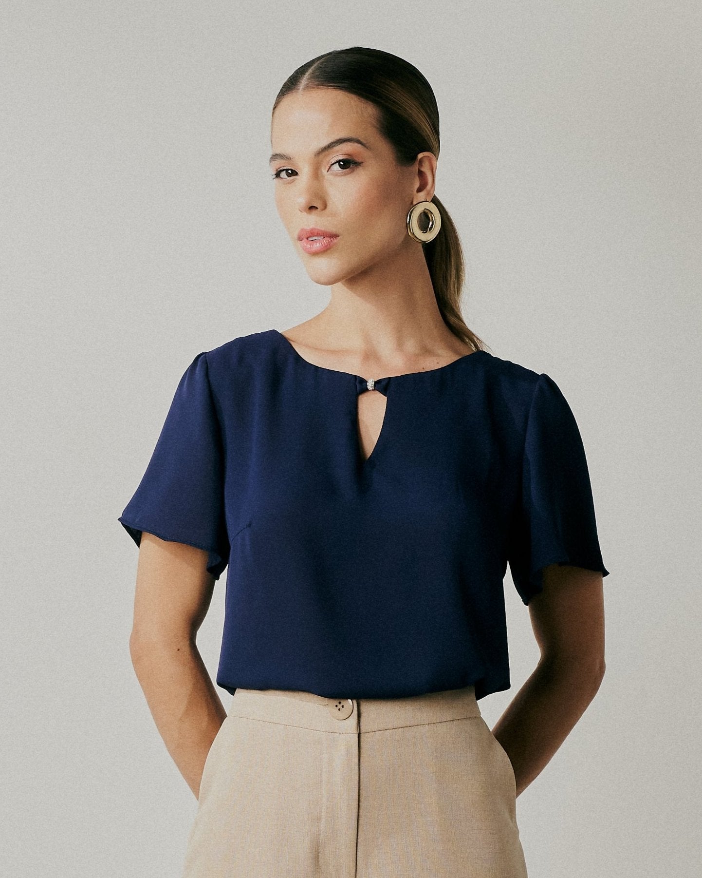 Blusa lisa de manga curta com decote vazado e detalhe de pingente que dá um toque de sofisticação para peça ! É a elegância em peça!