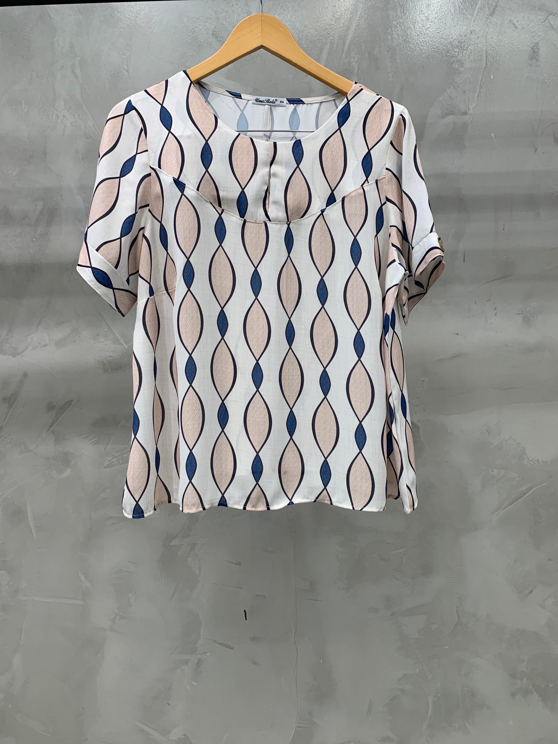 Blusa Plus estampada de manga curta, decote redondo com detalhe levemente vazado no busto e botões na manga. Uma peça casual e versátil.