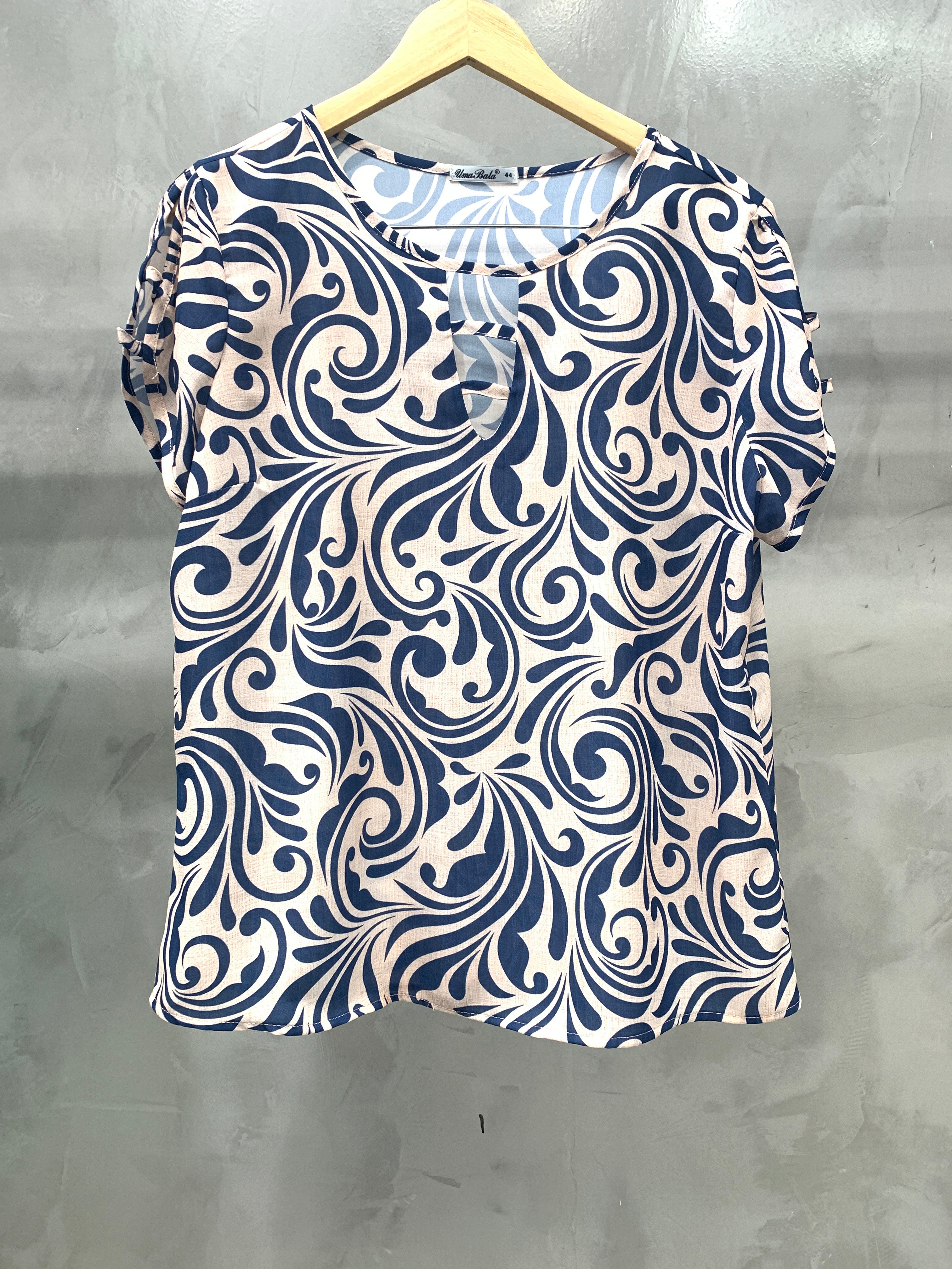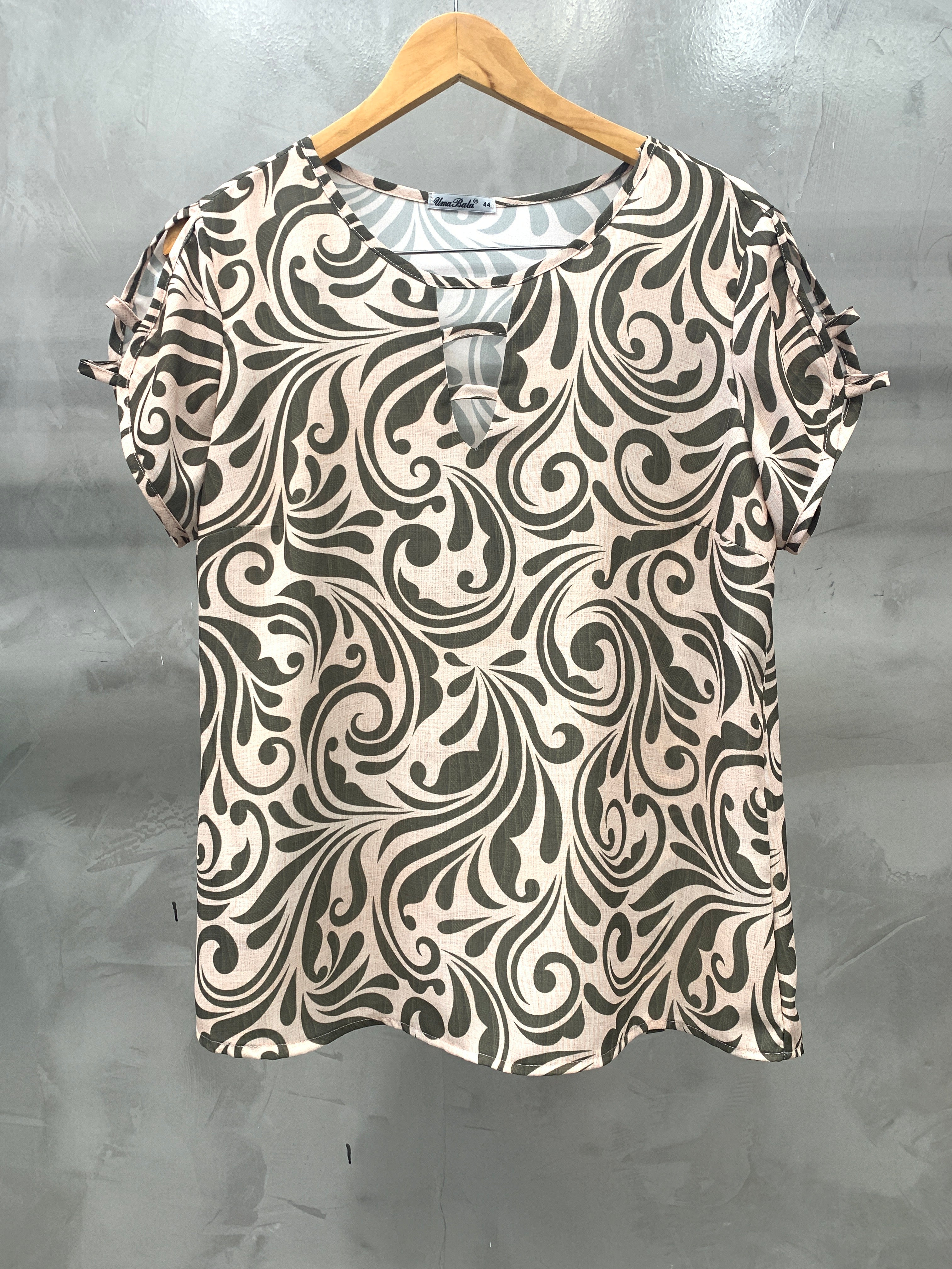 Blusa plus manga curta com detalhe vazado na bola e nas mangas, dando um charme maior a peça.