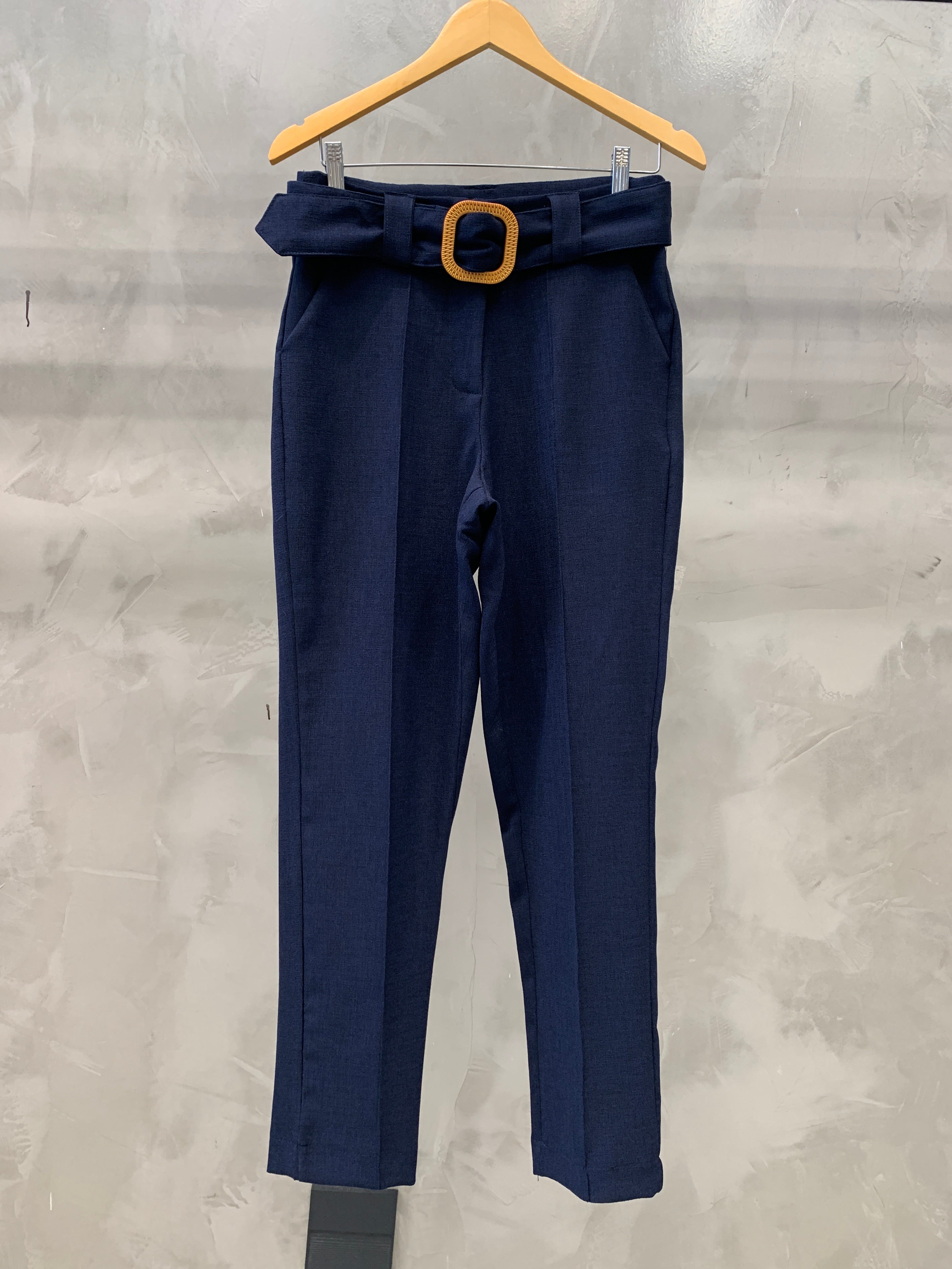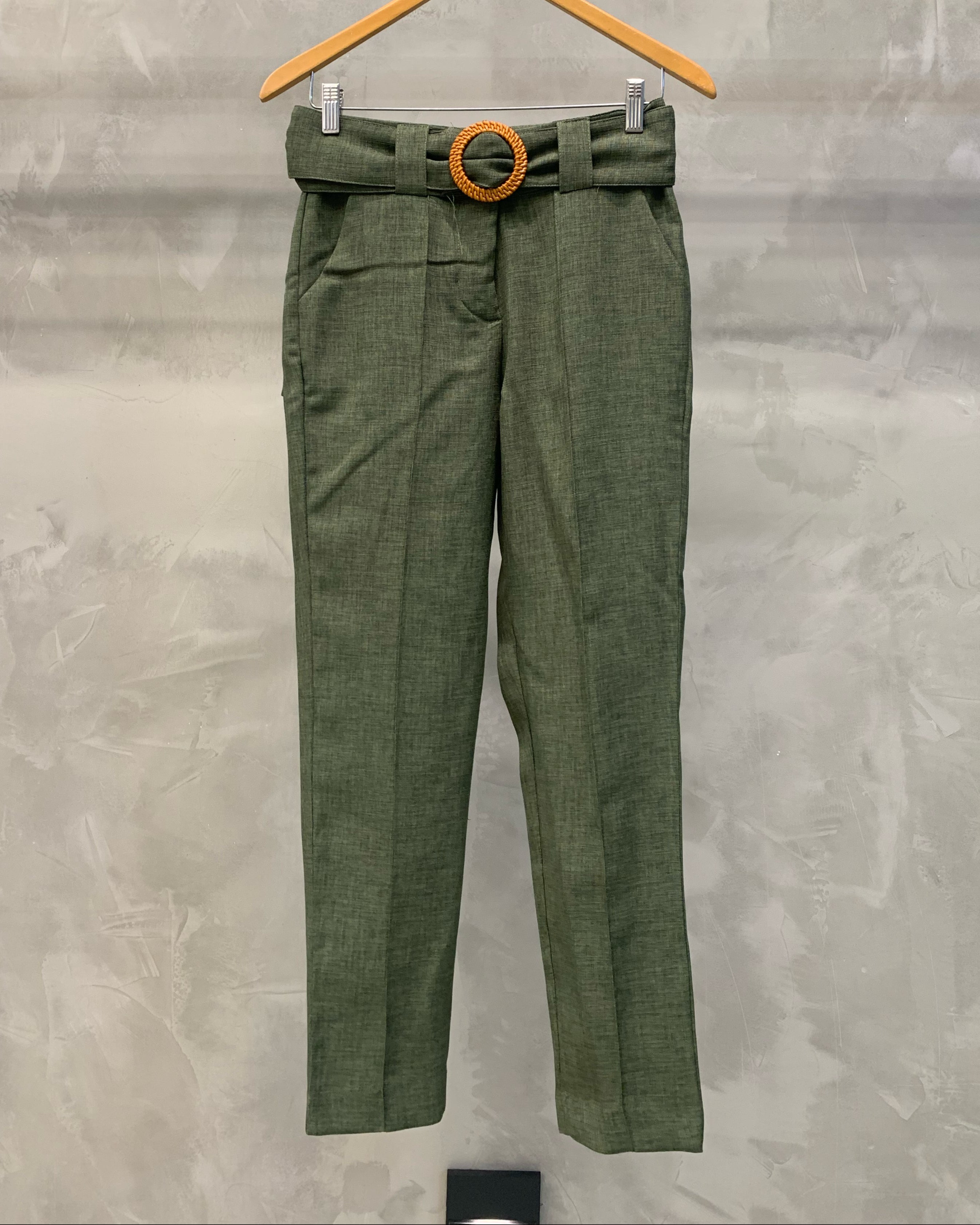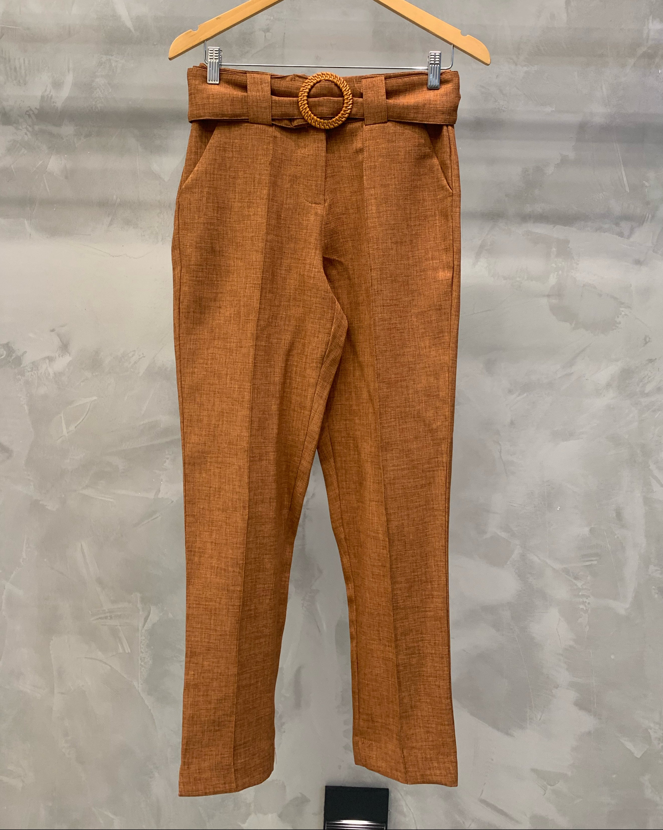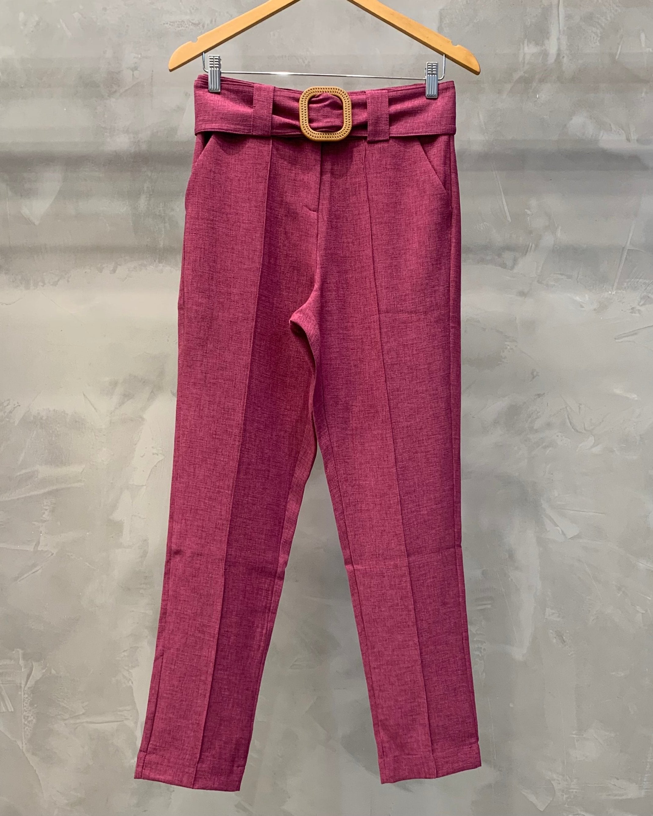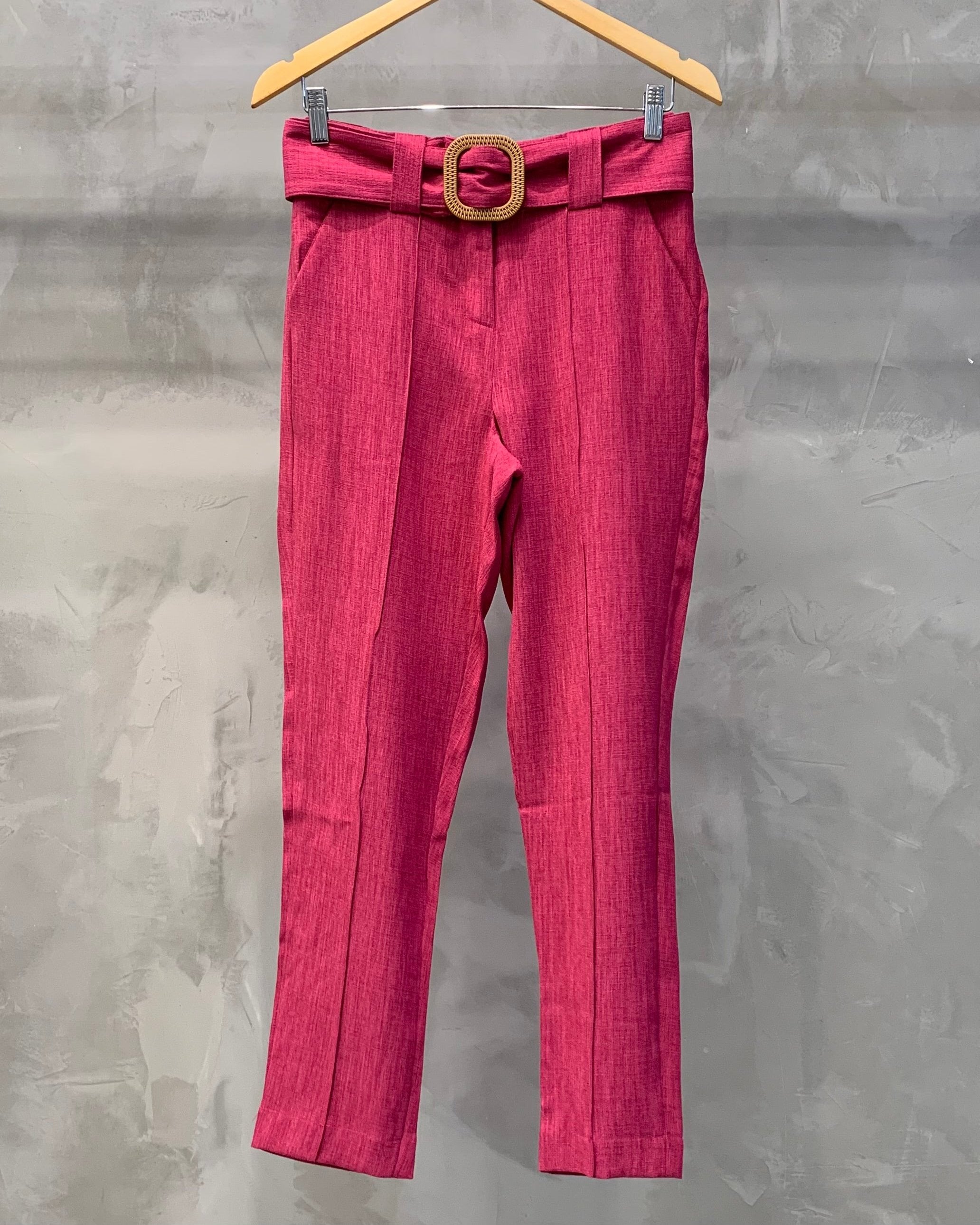 A calça cigarrete é uma peça com corte reto, pregas na frente e cinto forrado com detalhe de madeira, é perfeita para diversas ocasiões, proporcionando um caimento impecável e um toque de modernidade. As pregas frontais adicionam um toque de sofisticação e ajudam a estruturar a calça, proporcionando um caimento impecável.