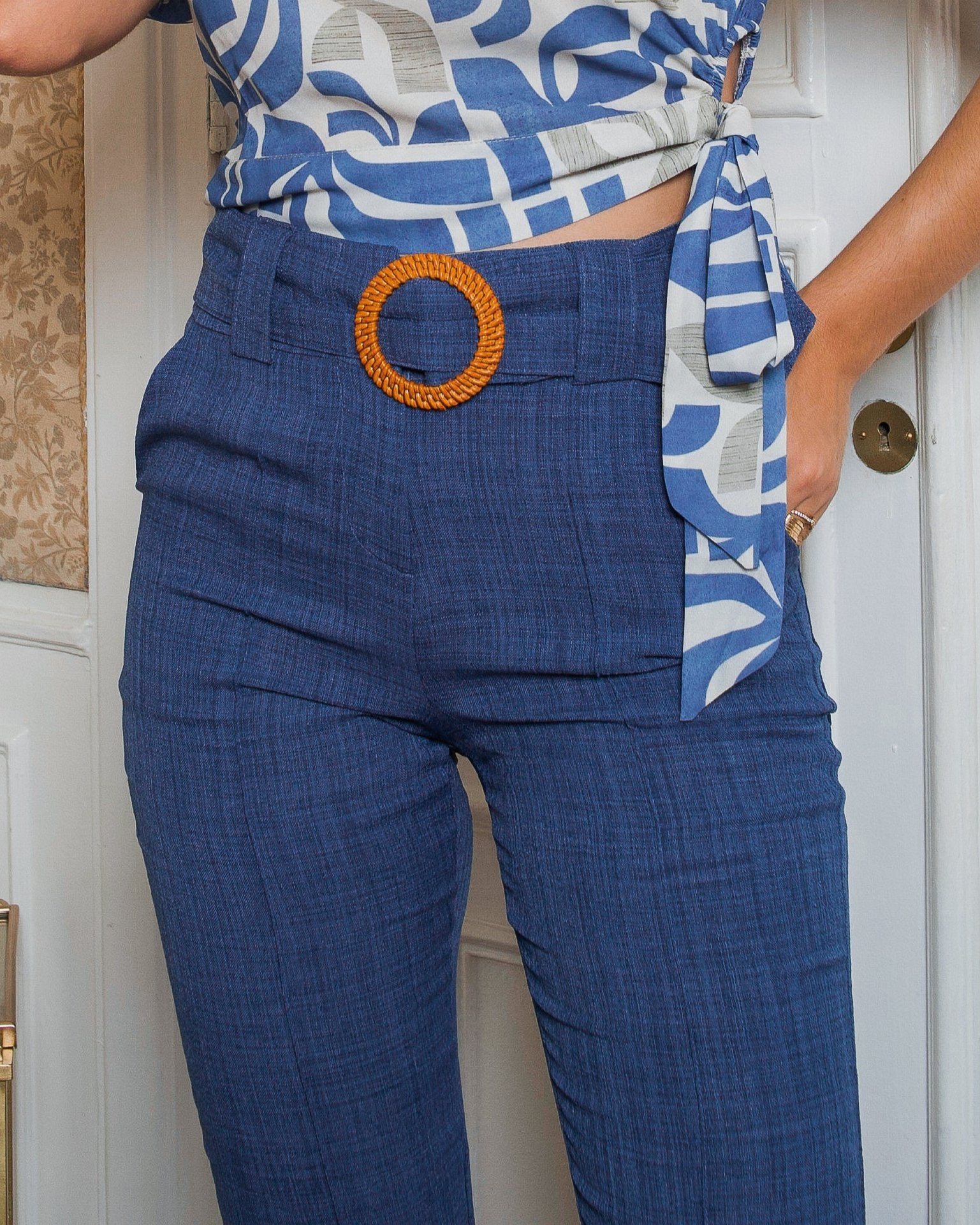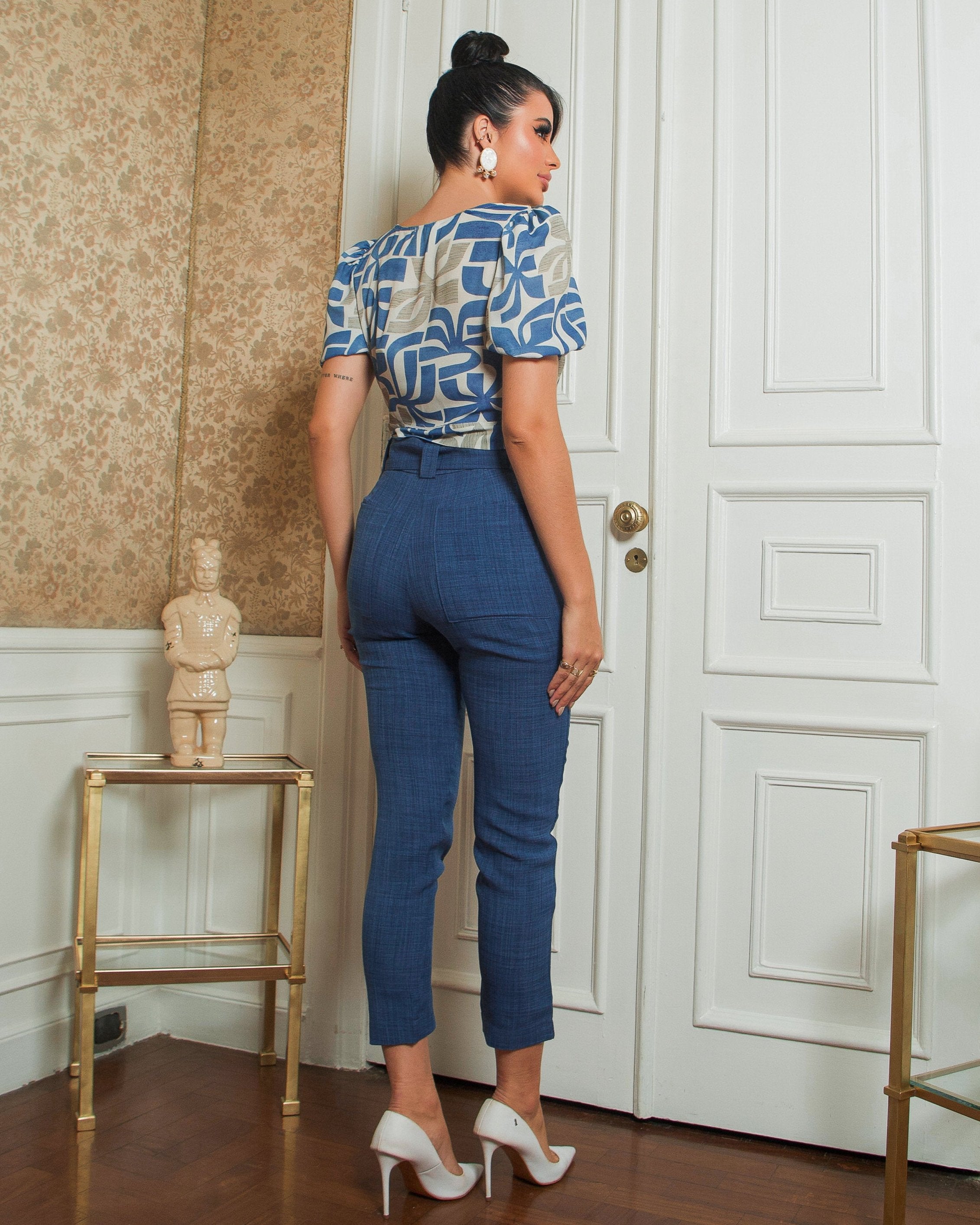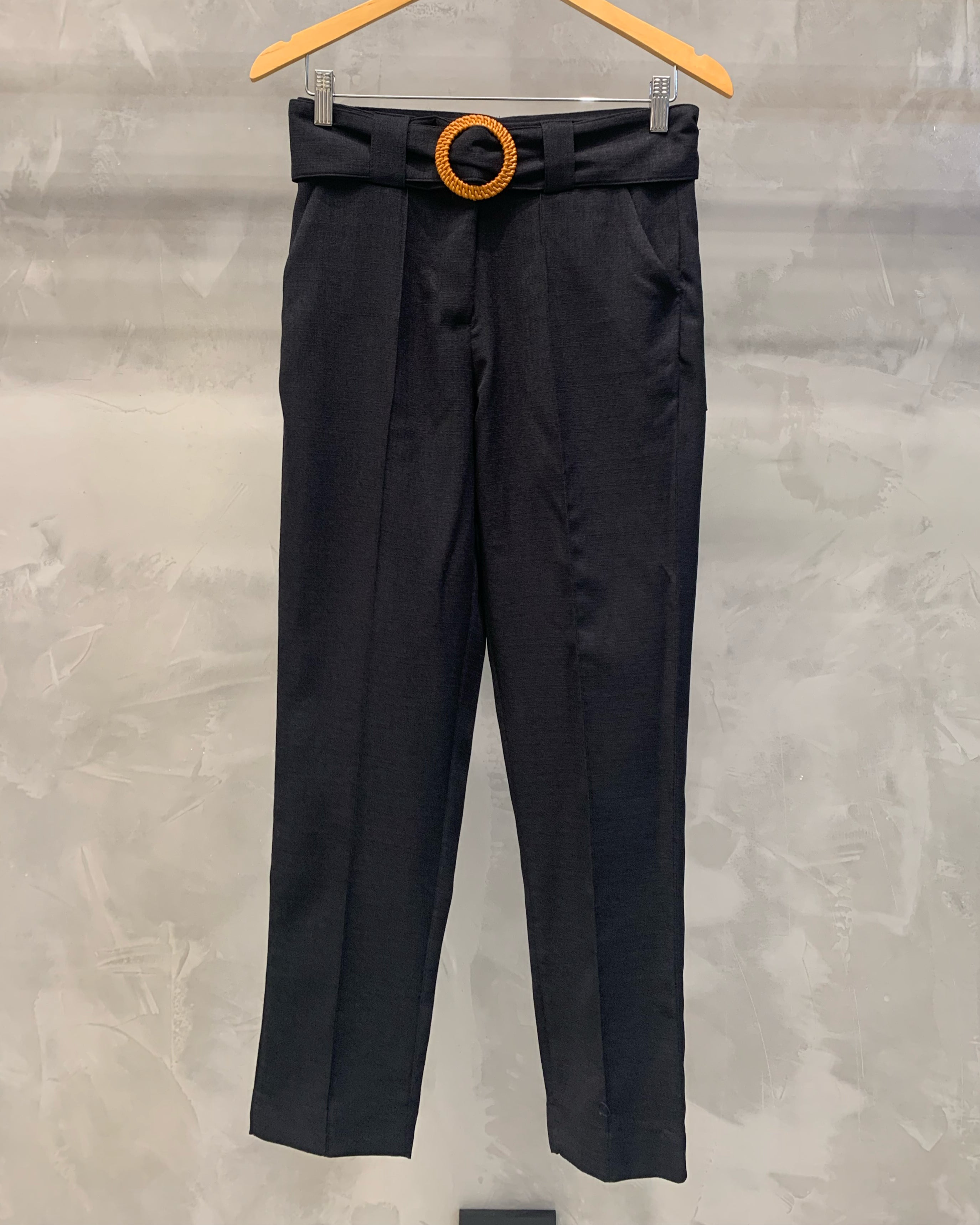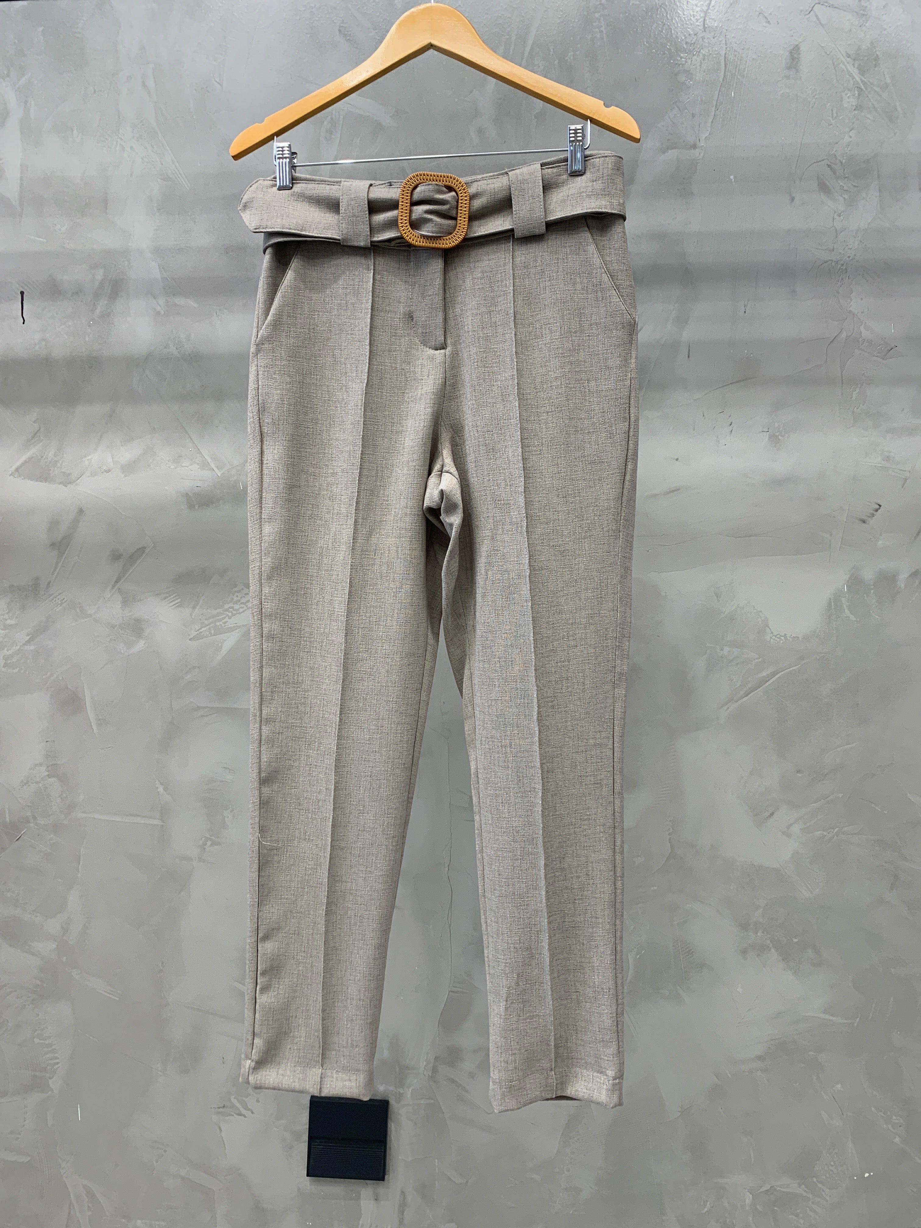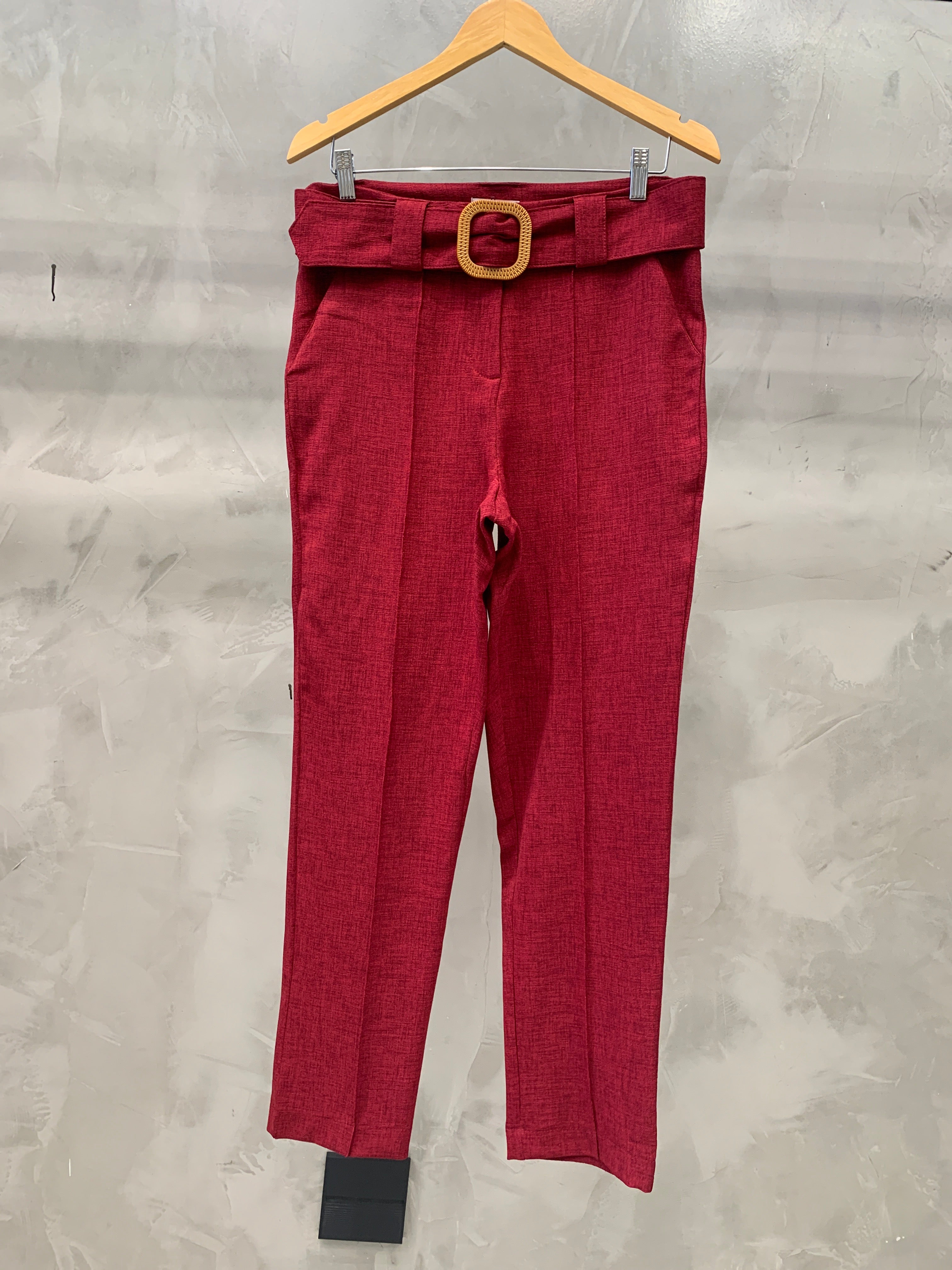 A calça cigarrete é uma peça com corte reto, pregas na frente e cinto forrado com detalhe de madeira, é perfeita para diversas ocasiões, proporcionando um caimento impecável e um toque de modernidade. As pregas frontais adicionam um toque de sofisticação e ajudam a estruturar a calça, proporcionando um caimento impecável.