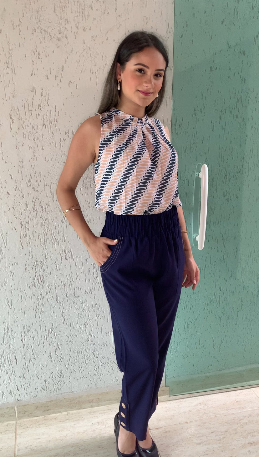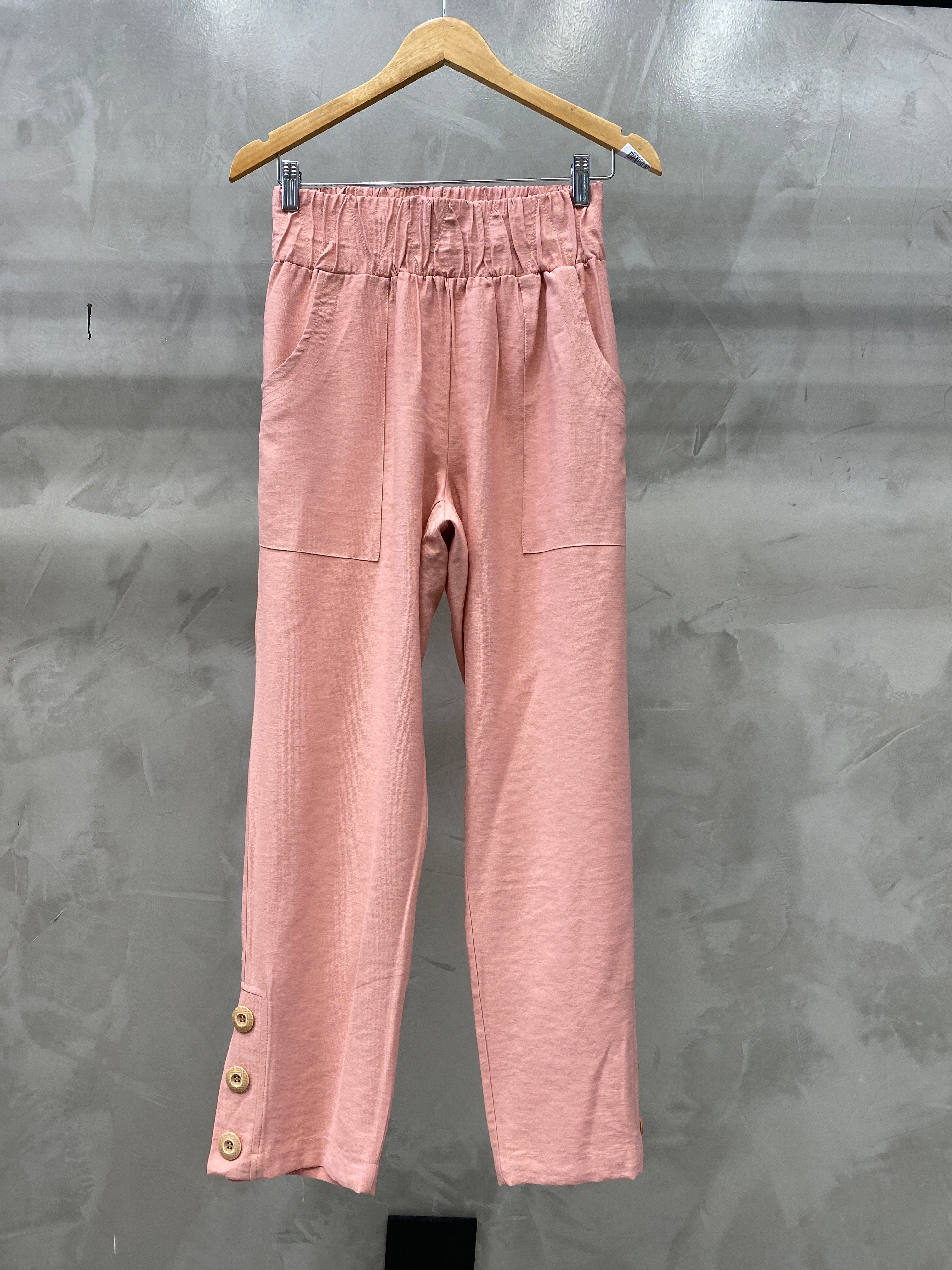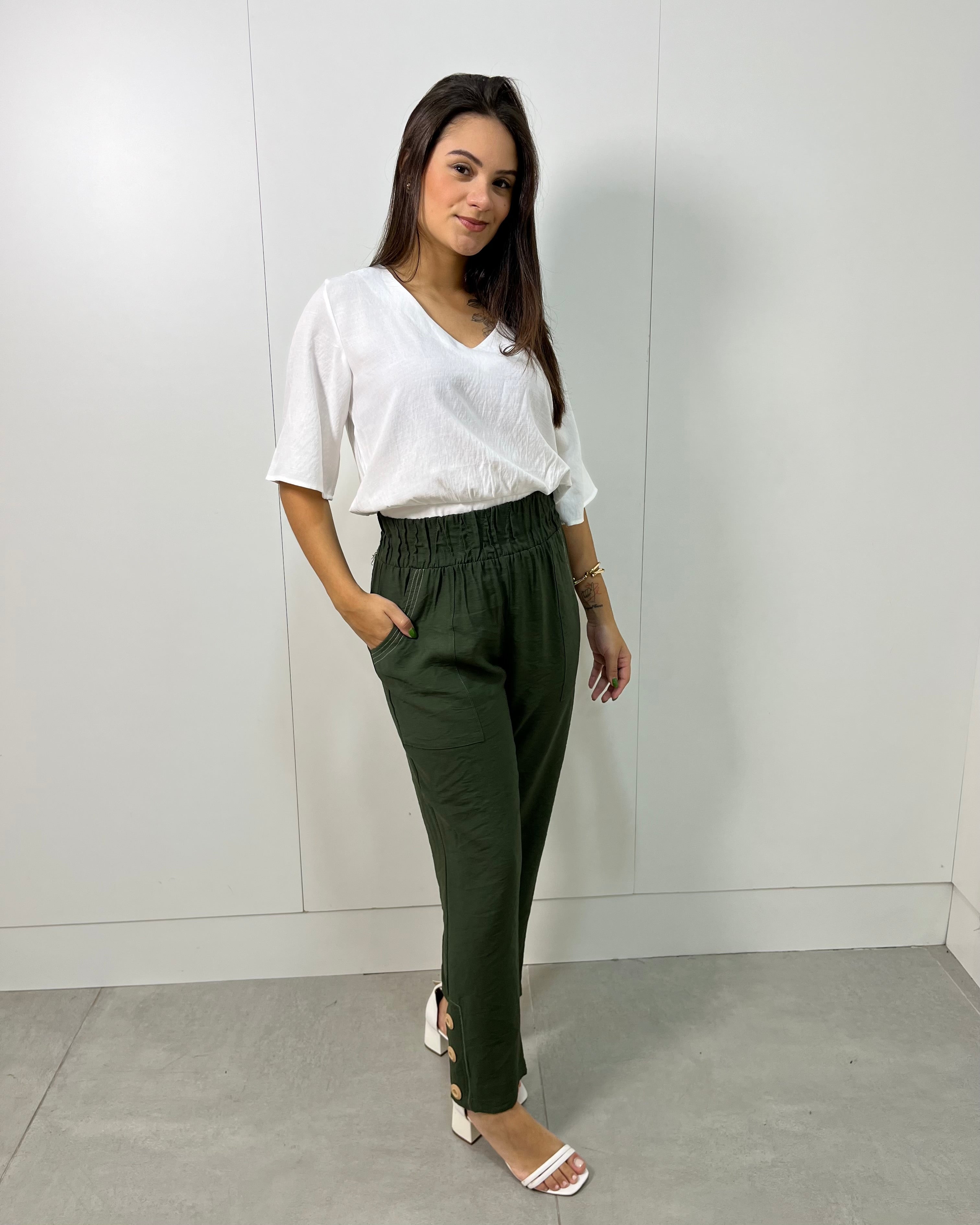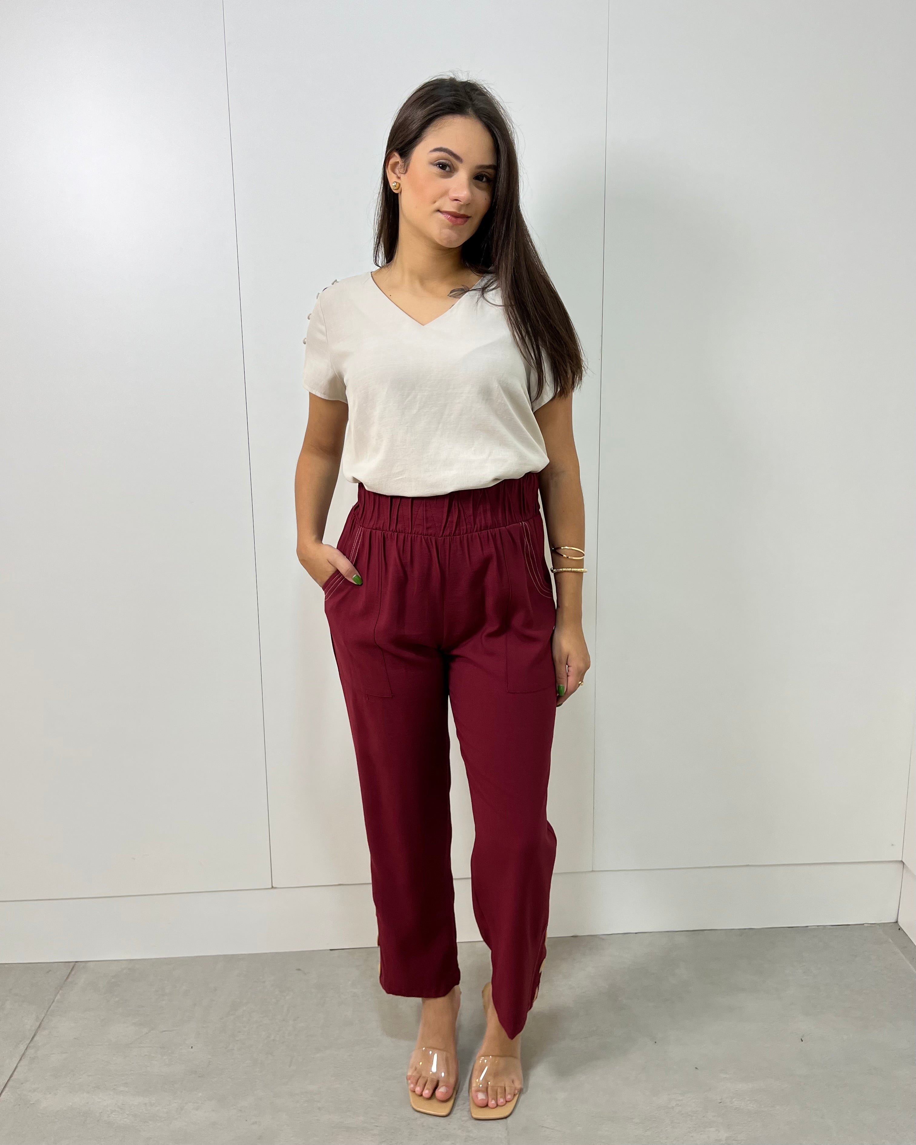 Calça tubinho com elástico na cintura, detalhe de botões e pespontos que dão todo o charme. Tem bolsos laterais.