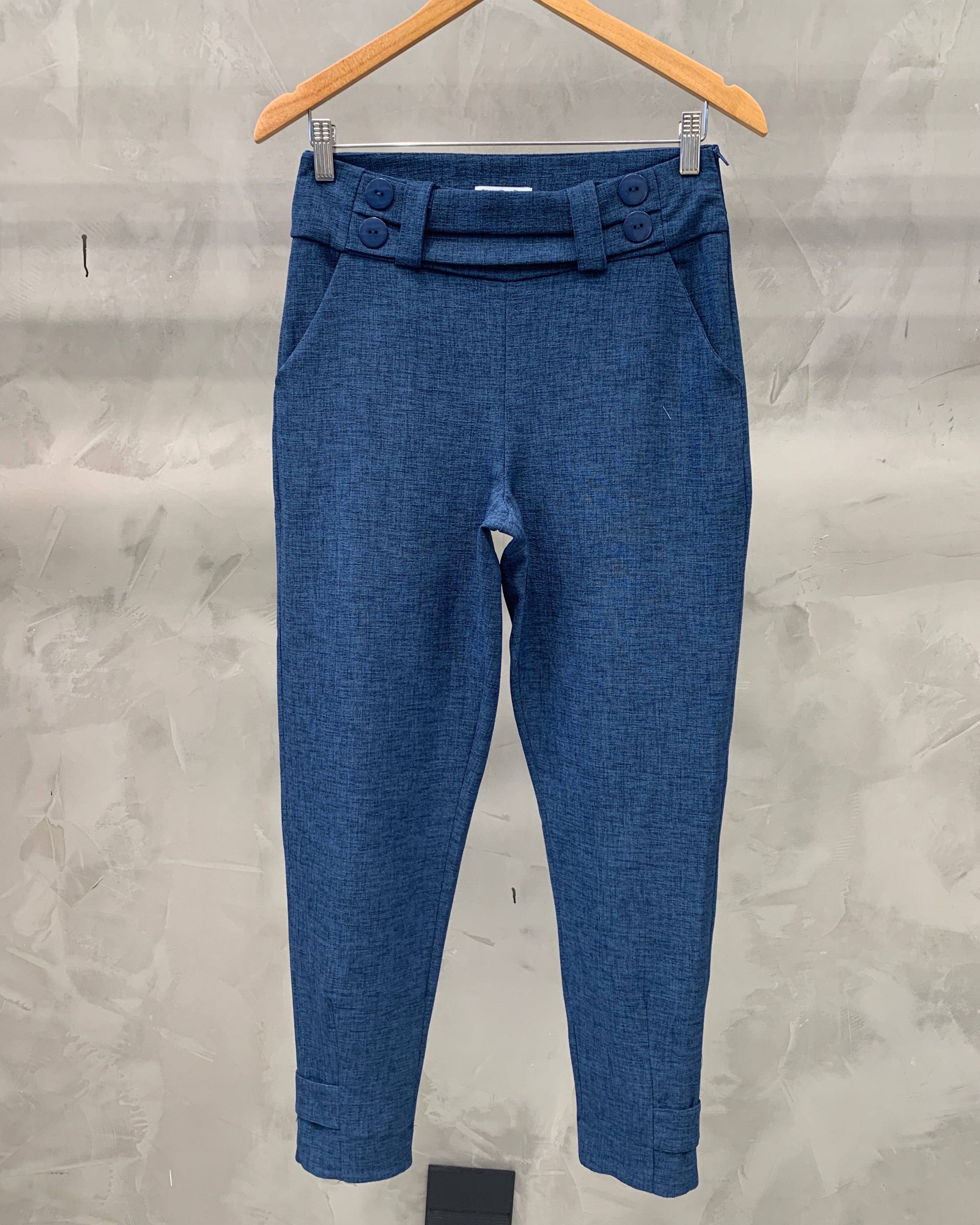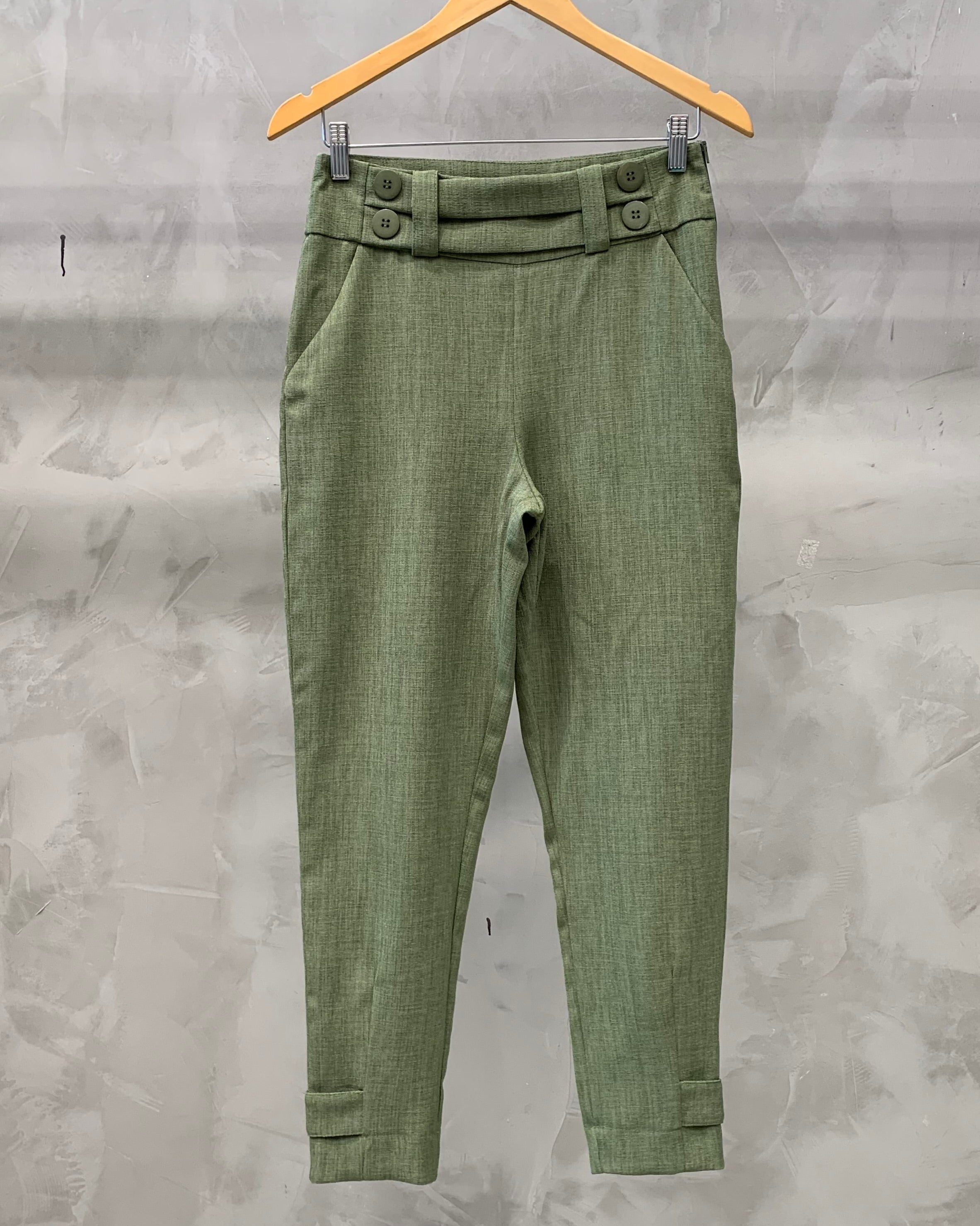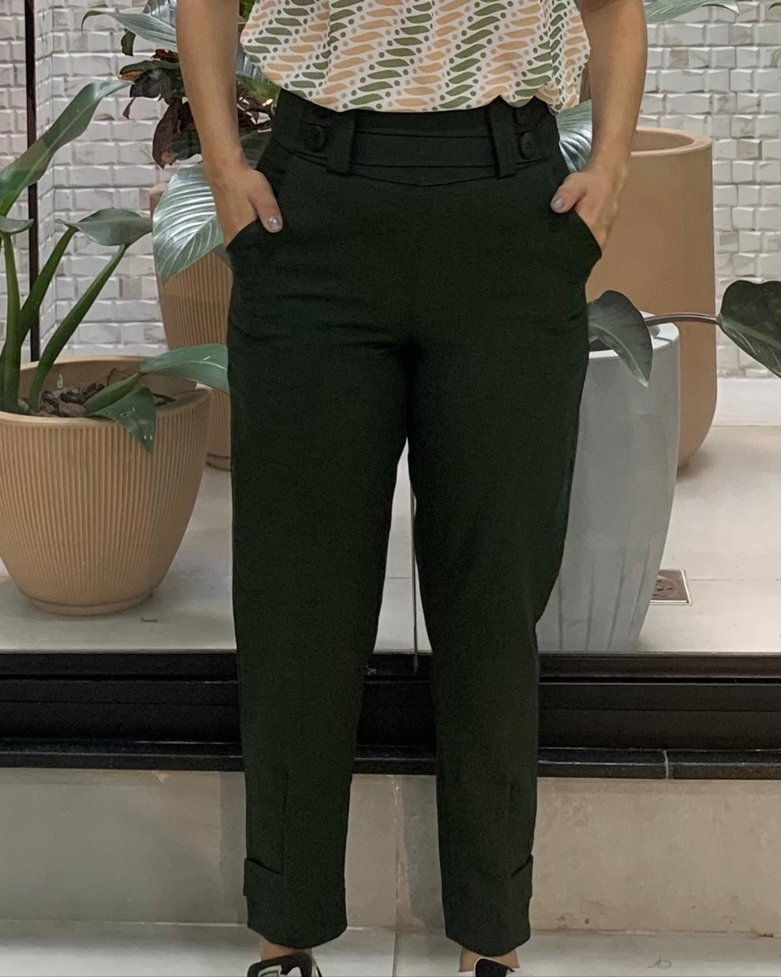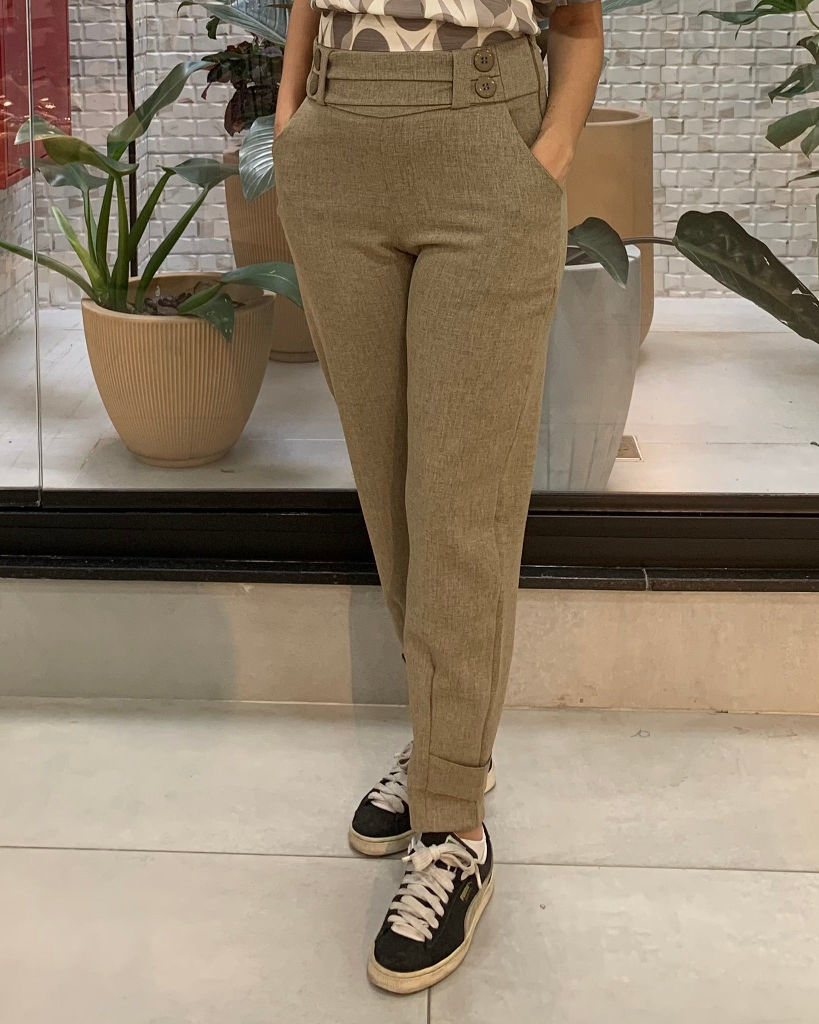 Calça lisa com modelagem reta, com detalhe de botões frontais e zíper lateral. É uma peça chave para o seu guarda roupa, perfeita para qualquer ocasião! Confeccionada no Polylinho.