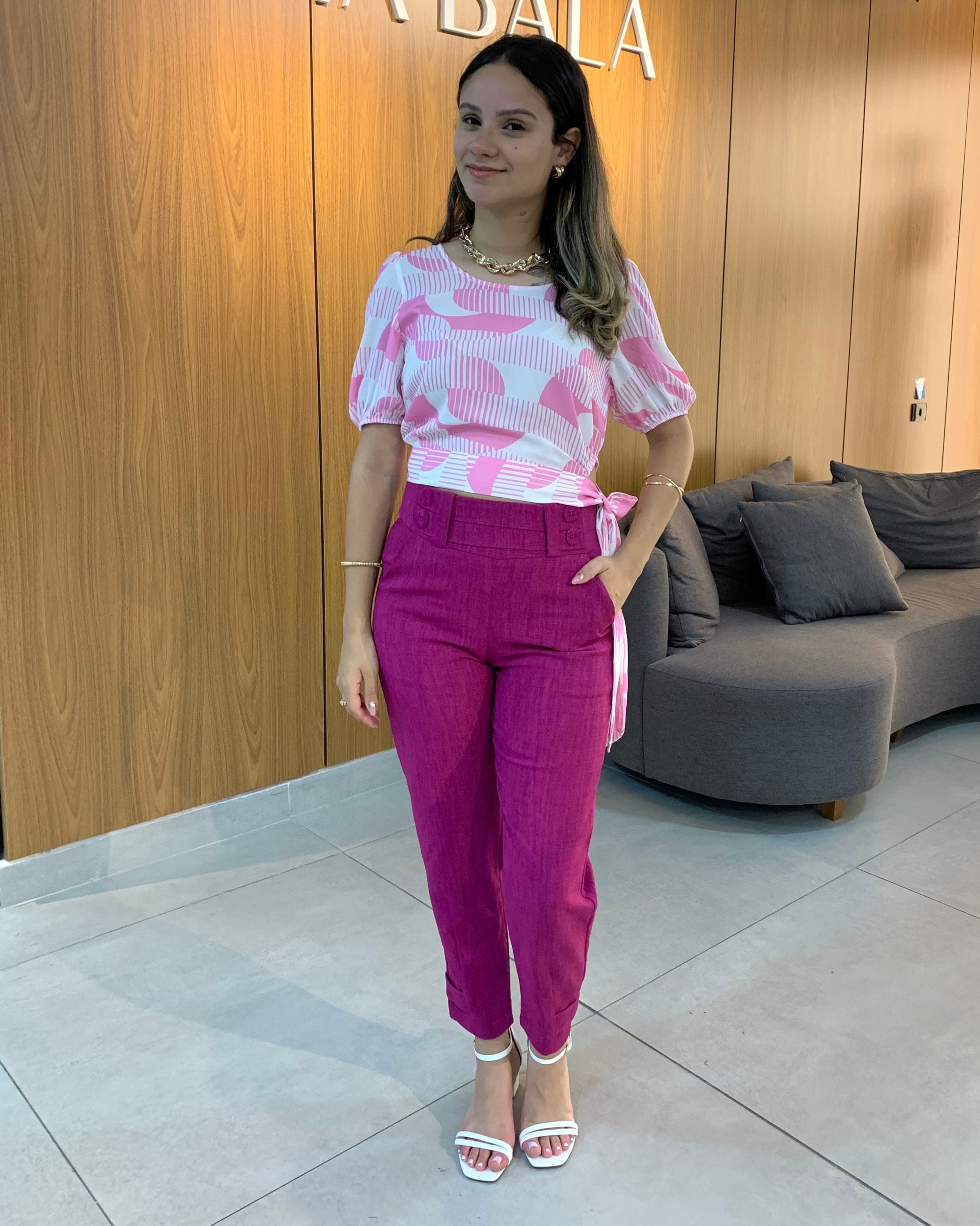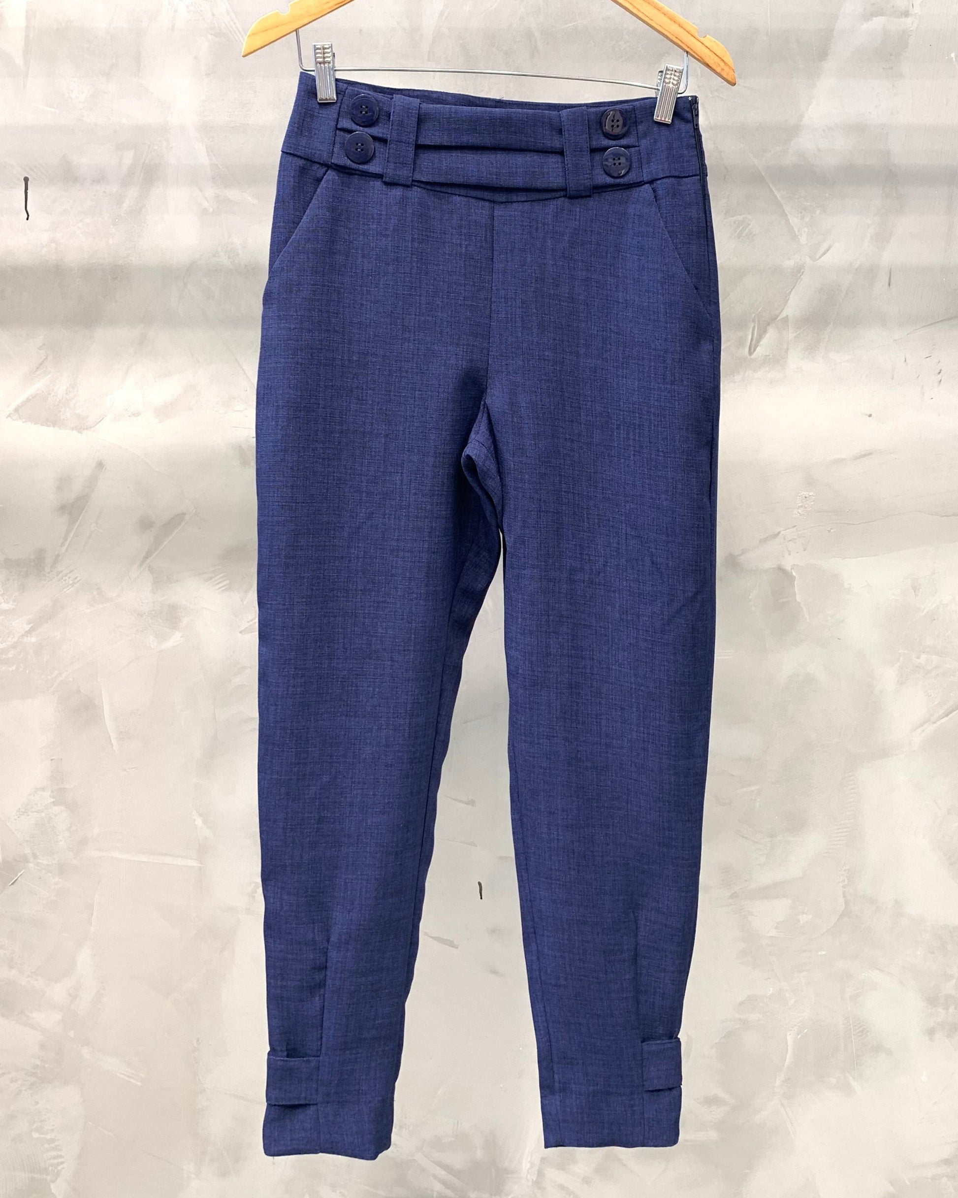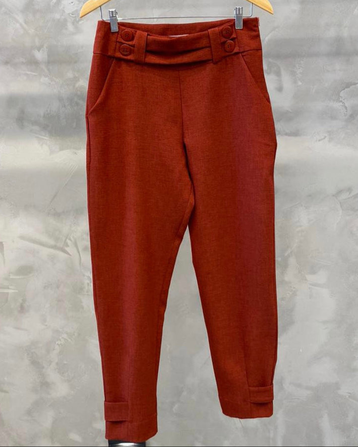 Calça lisa com modelagem reta, com detalhe de botões frontais e zíper lateral. É uma peça chave para o seu guarda roupa, perfeita para qualquer ocasião! Confeccionada no Polylinho.