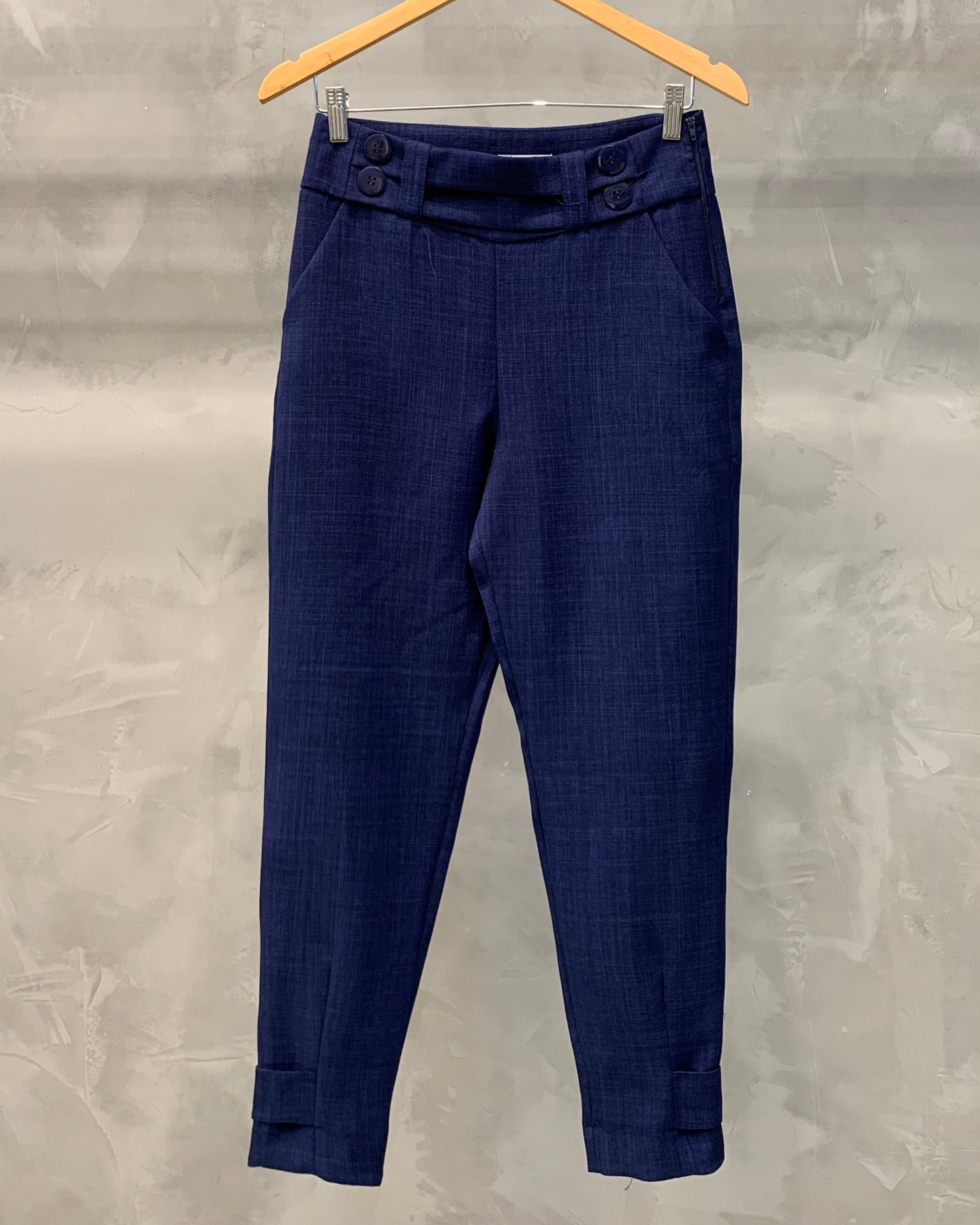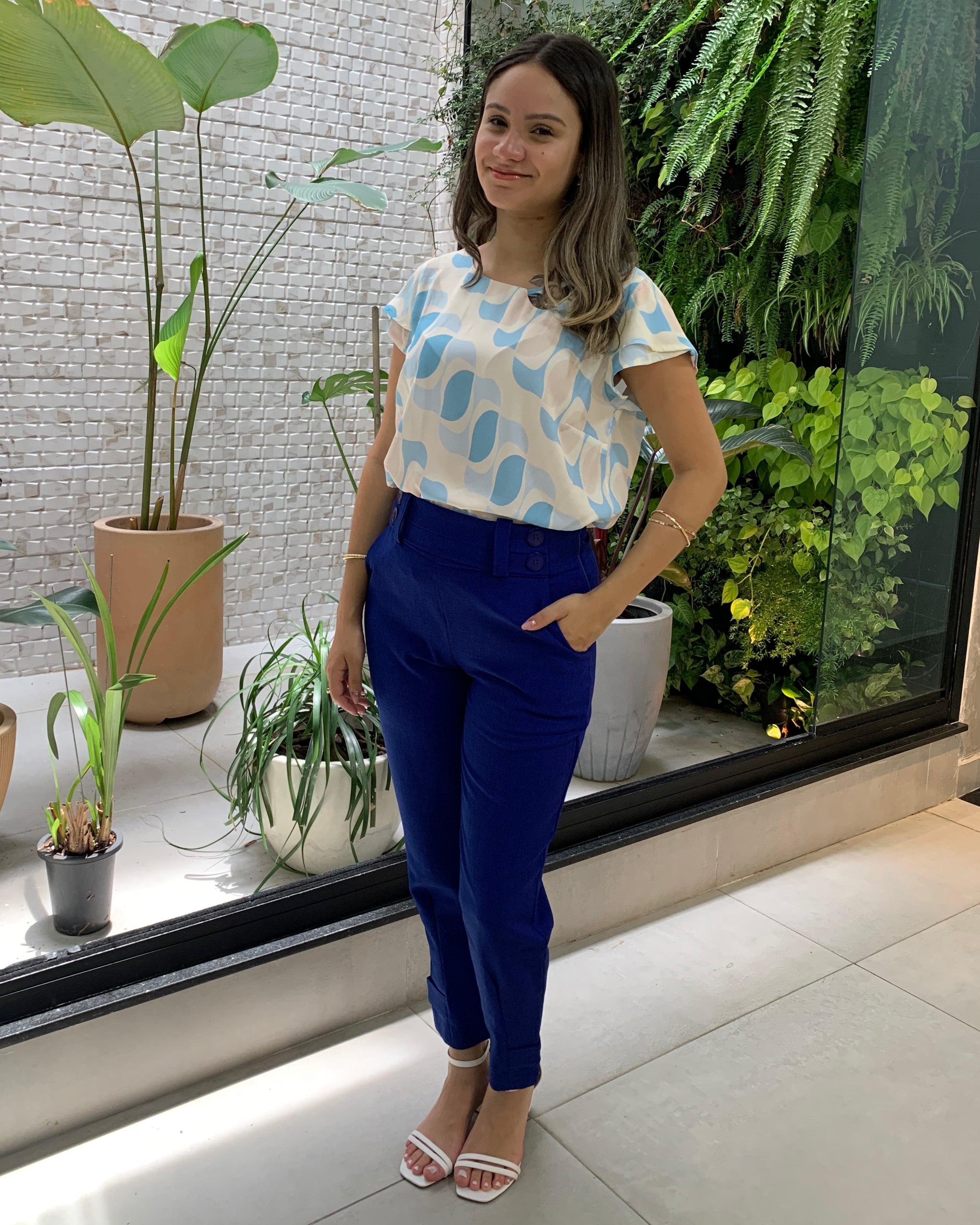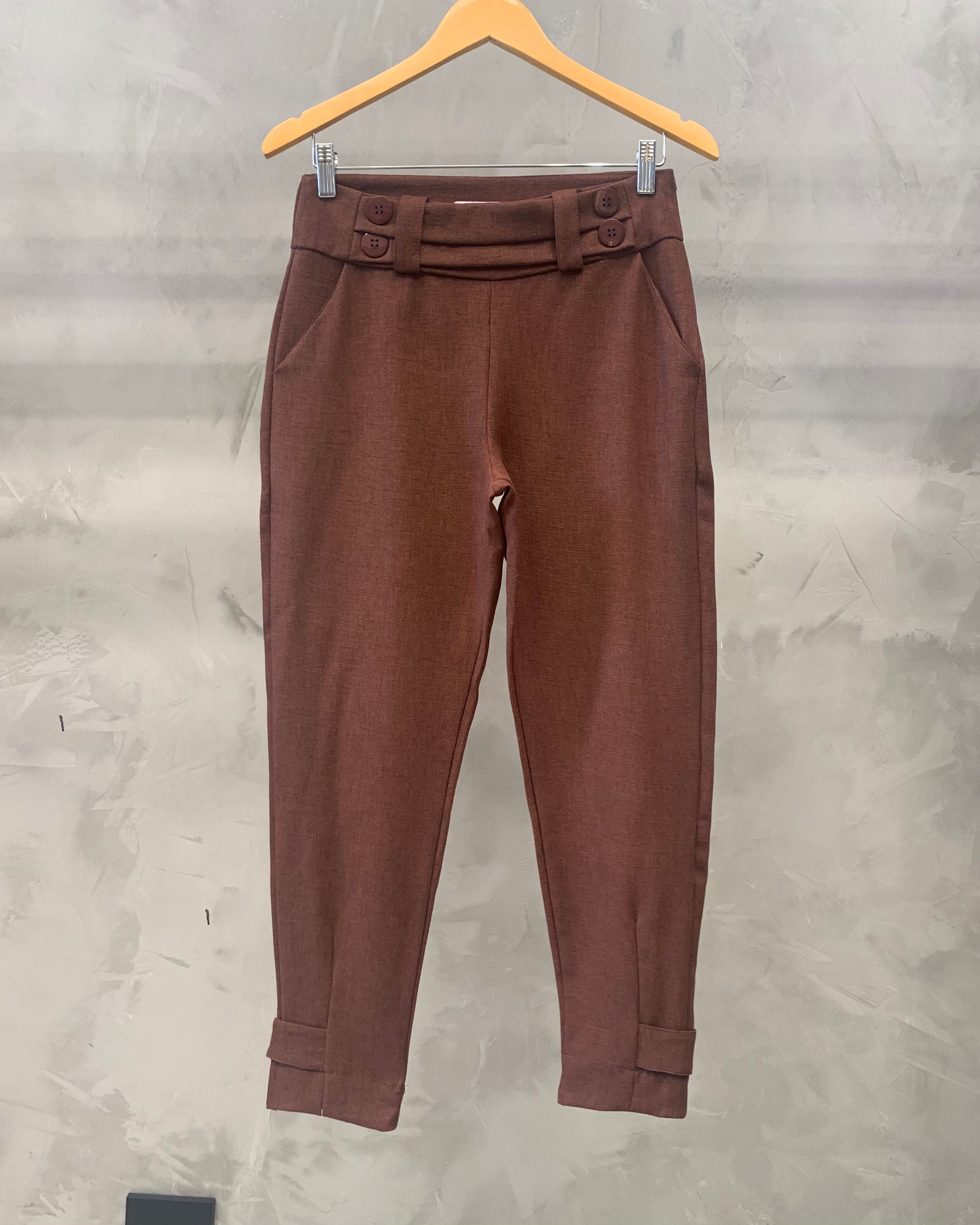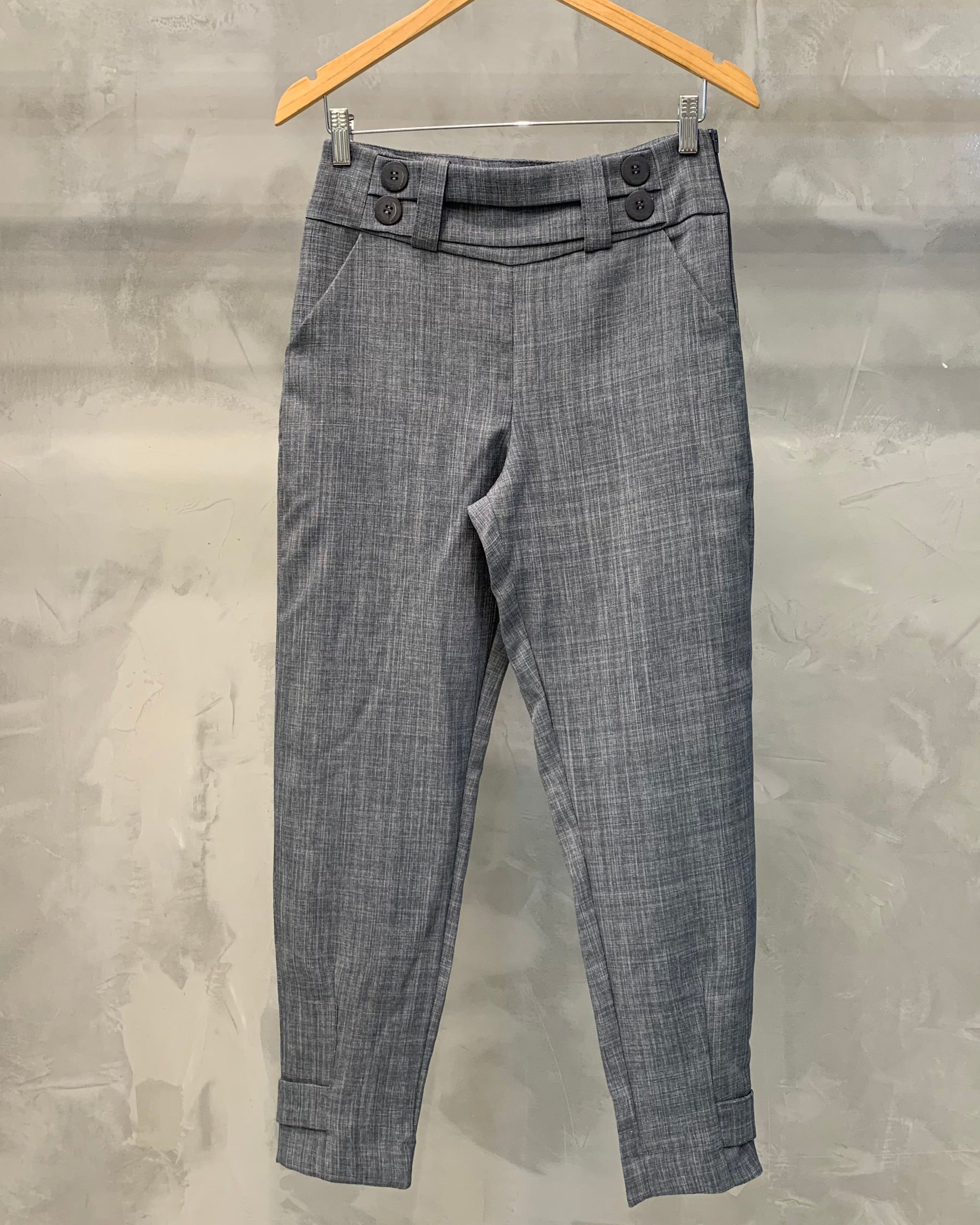 Calça lisa com modelagem reta, com detalhe de botões frontais e zíper lateral. É uma peça chave para o seu guarda roupa, perfeita para qualquer ocasião! Confeccionada no Polylinho.