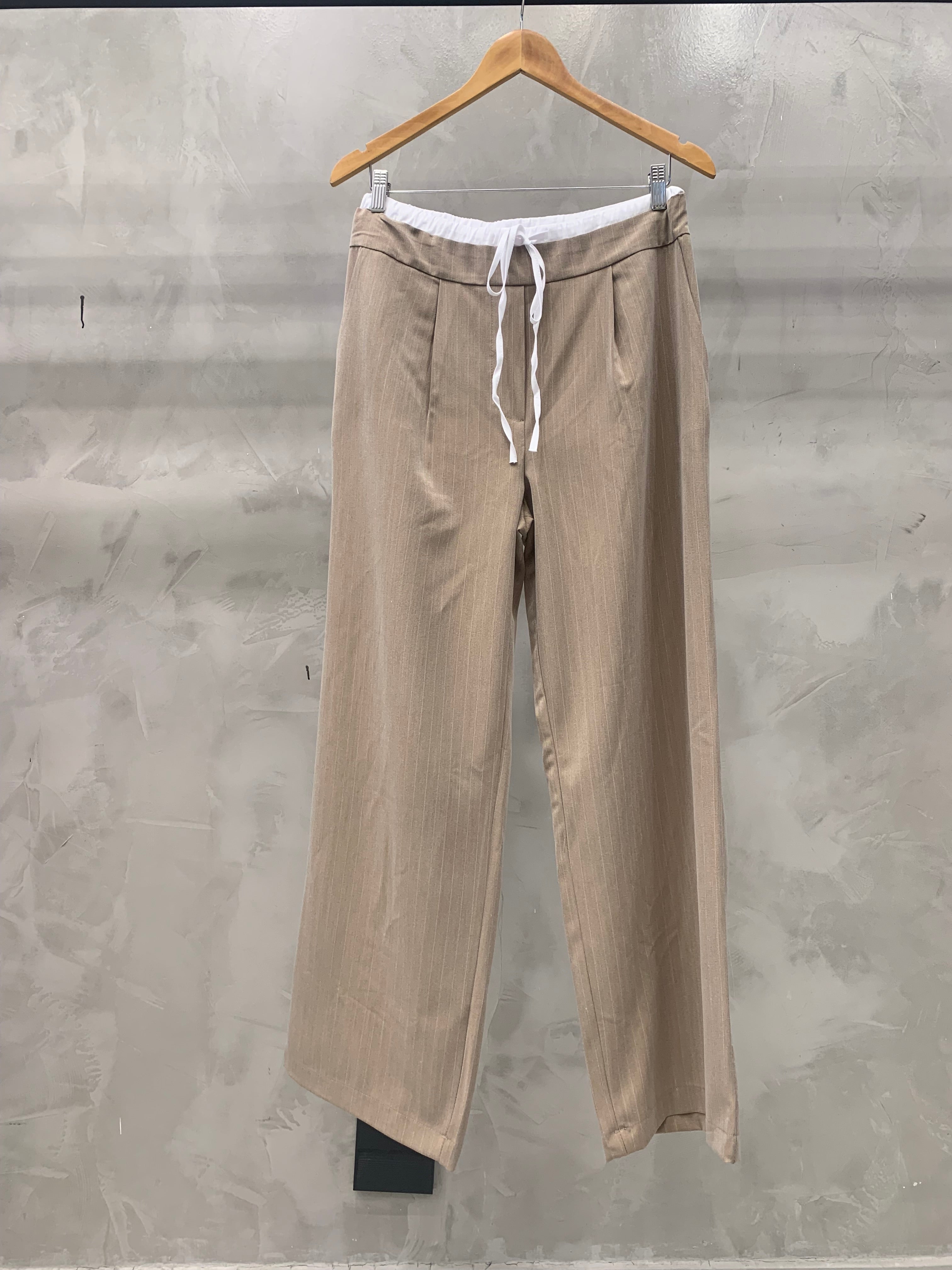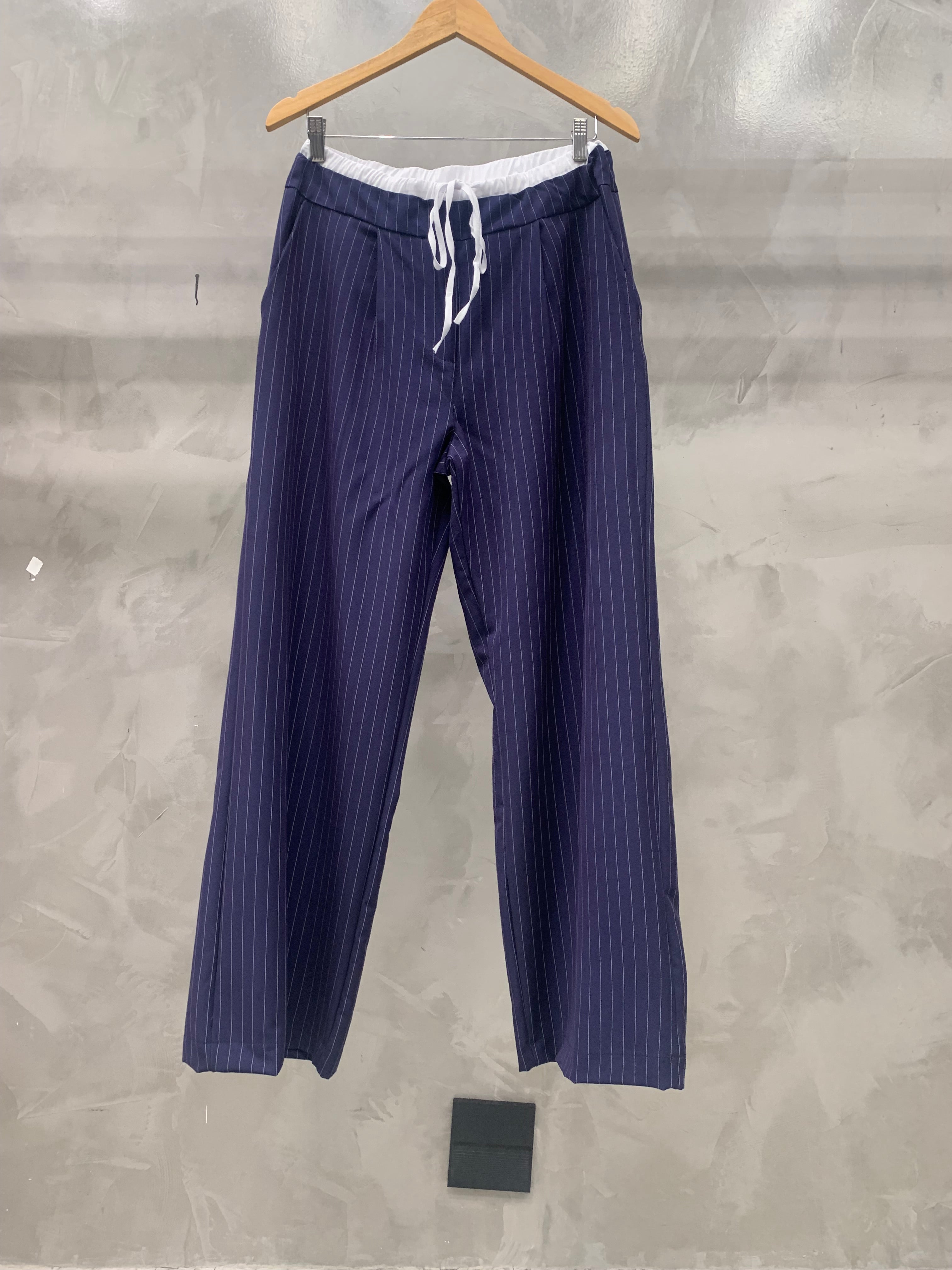 Calça risca de giz, de cintura alta com dupla cintura elástica com cordão e tecido combinado. Pinças na frente. Bolsos na frente e falsos bolsos com linha viva atrás. Modelagem de pernas largas com zíper lateral para mais fácil vestimenta.