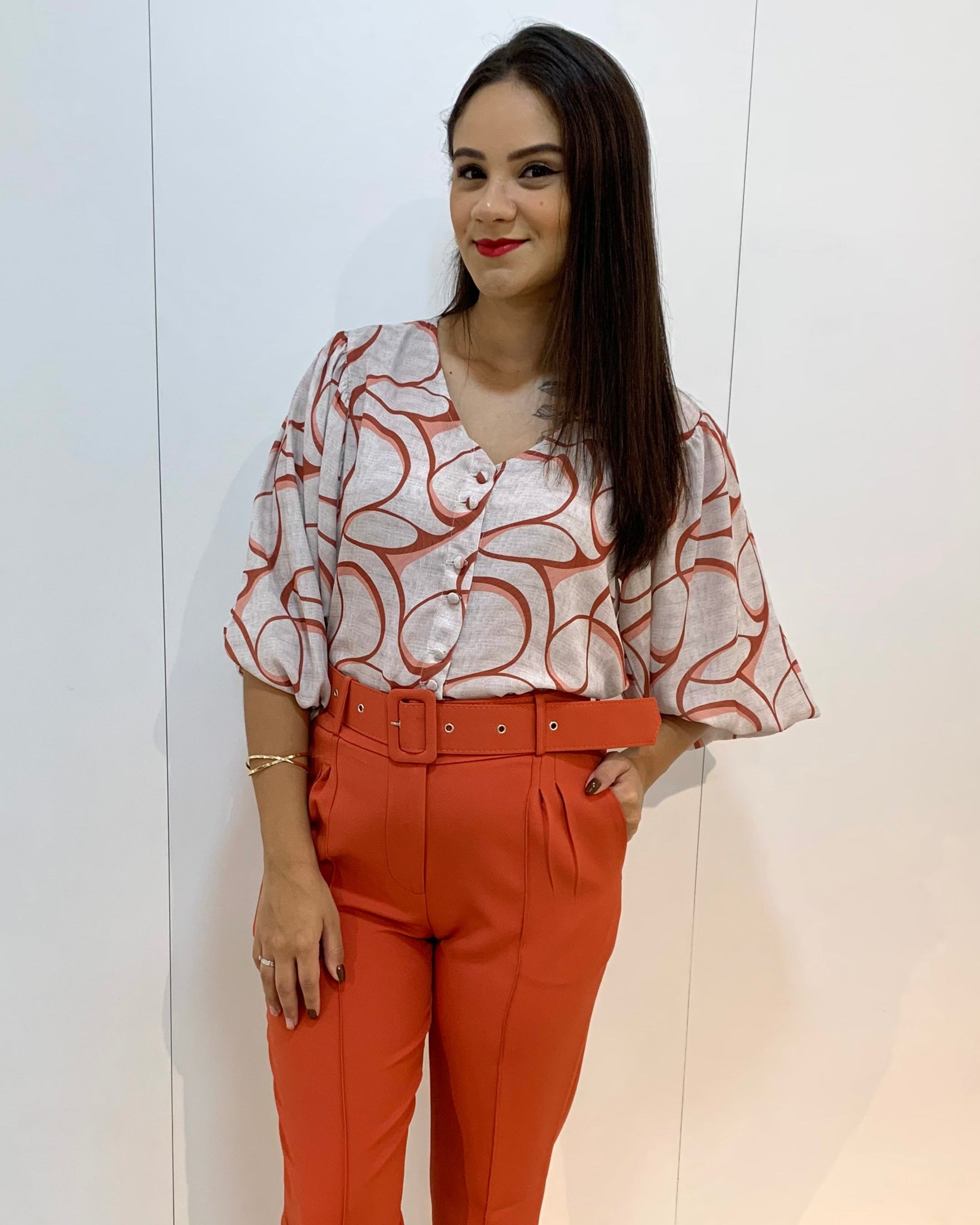 Camisa estampada com decote V e manga longa bufante. Tem detalhes de botões forrados frontais do mesmo tecido, que dá um toque mais sofisticado para peça! Confeccionado no Crepe.