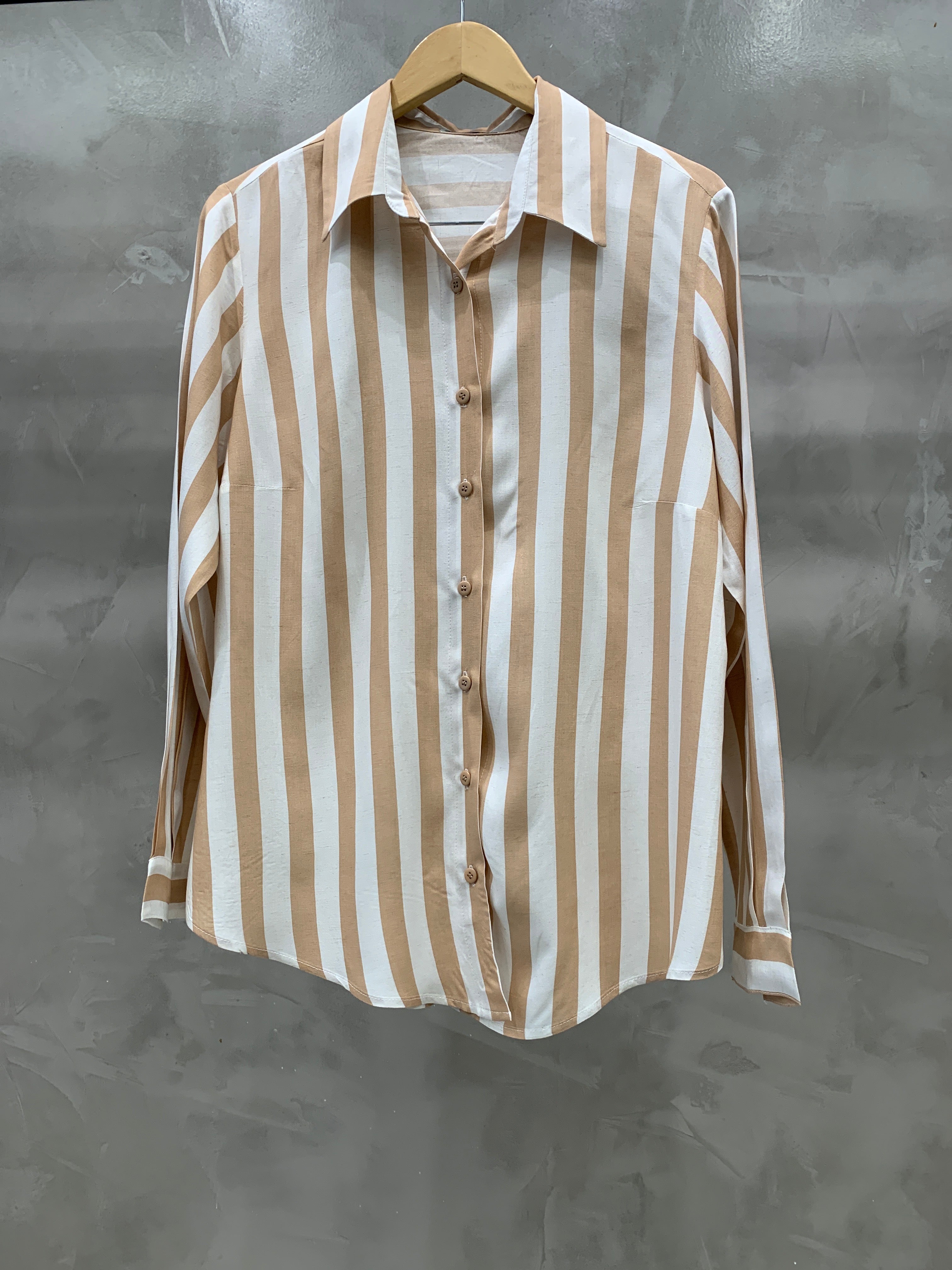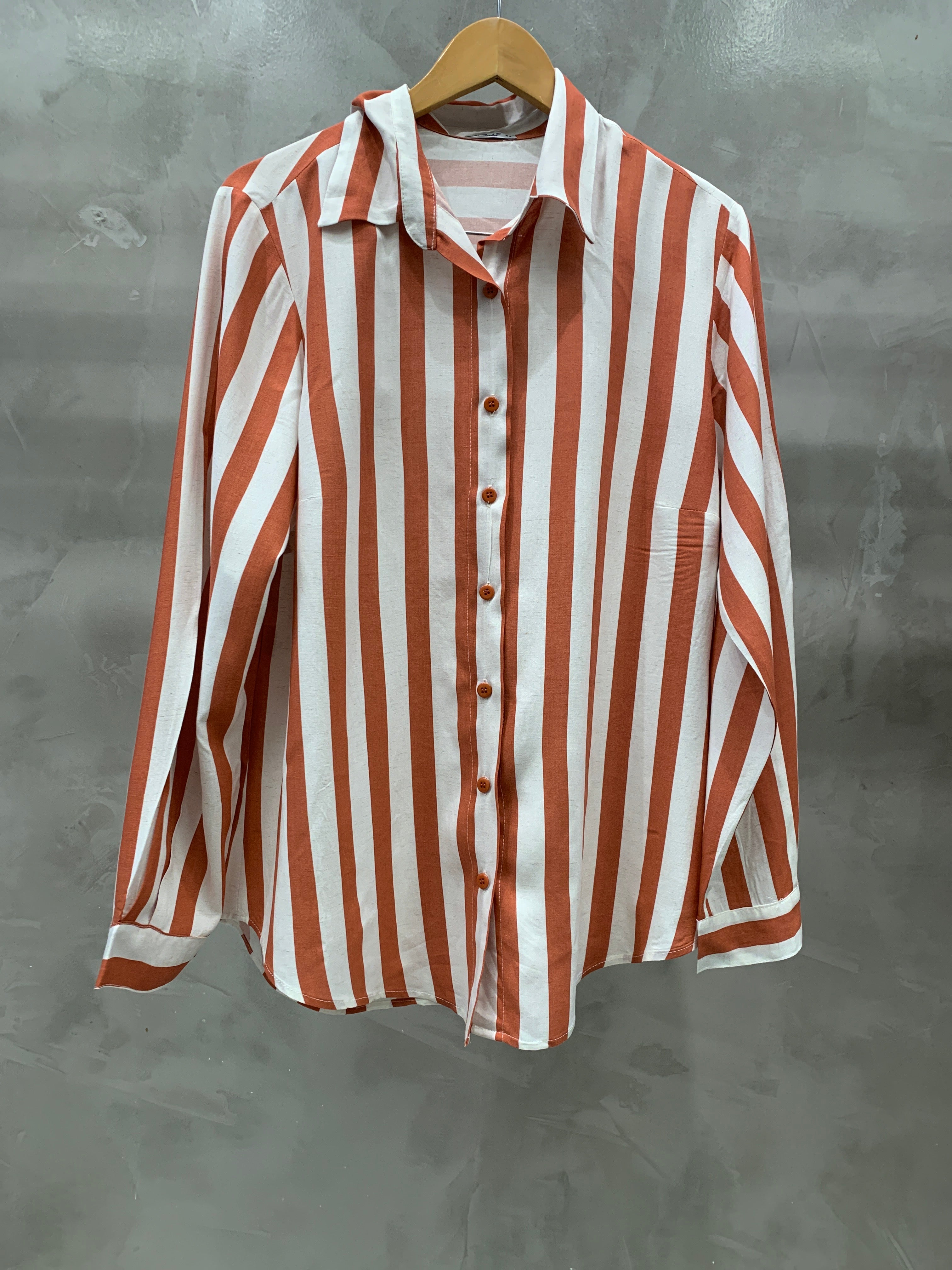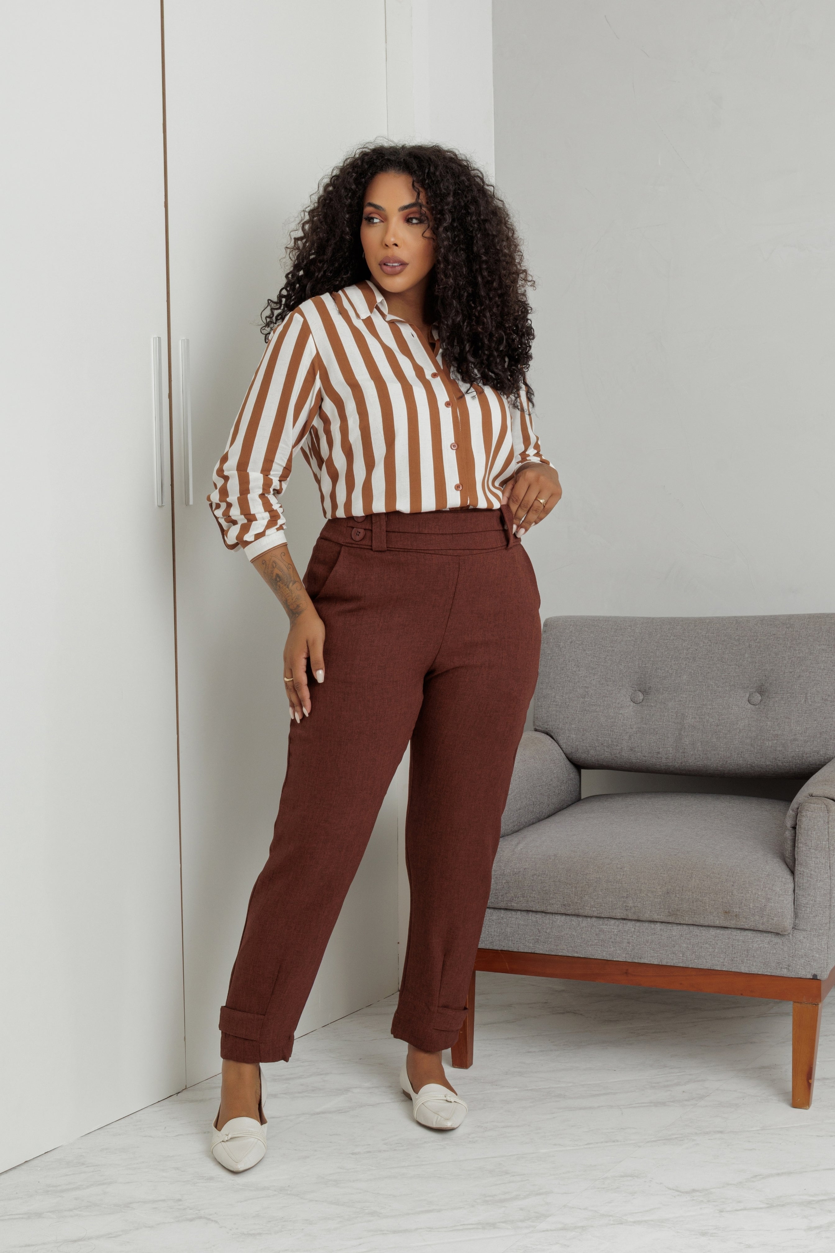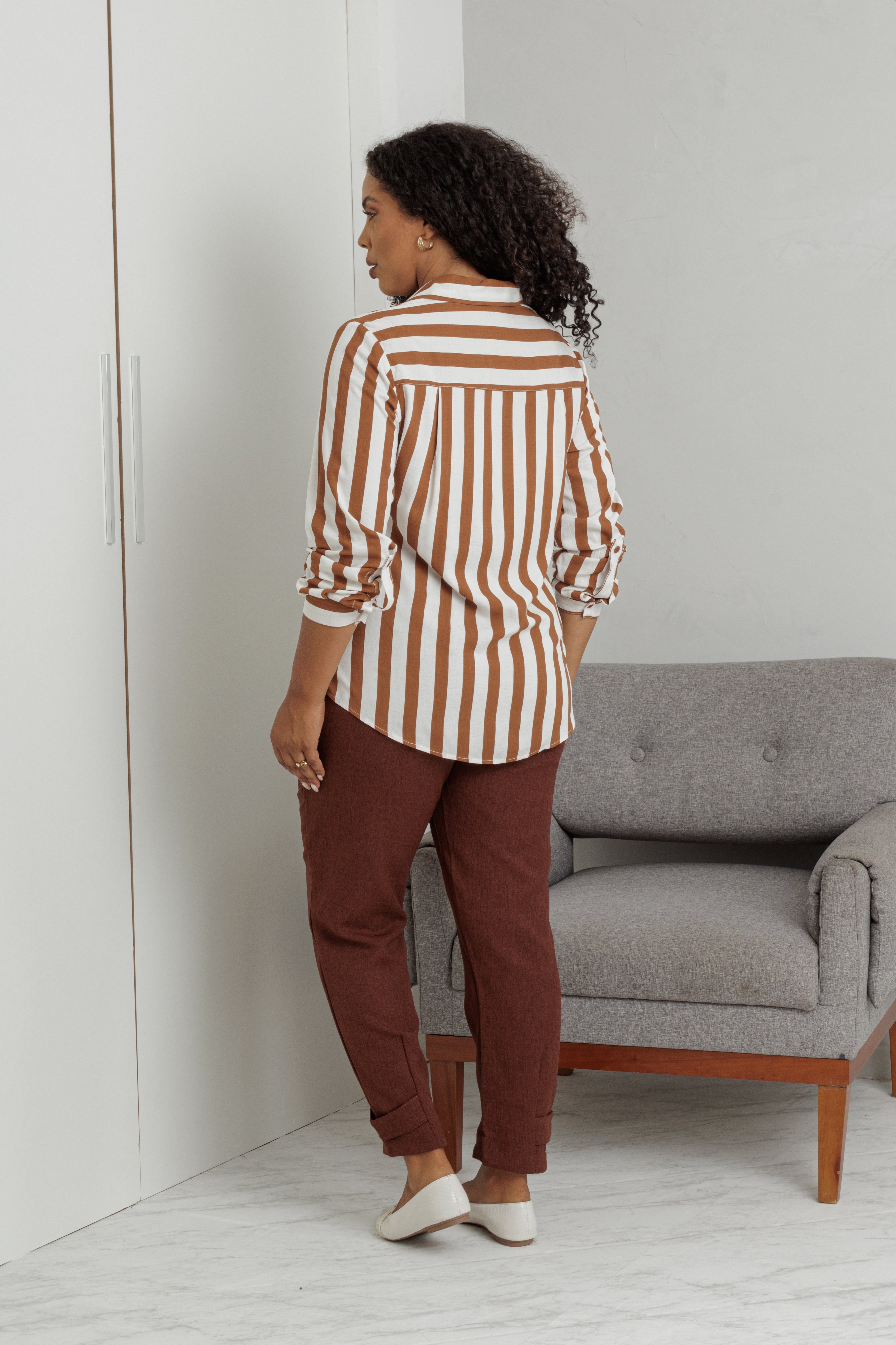 Camisa Plus listrada com modelagem básica e botões frontais. Confeccionada no tecido de Viscose com Linho.