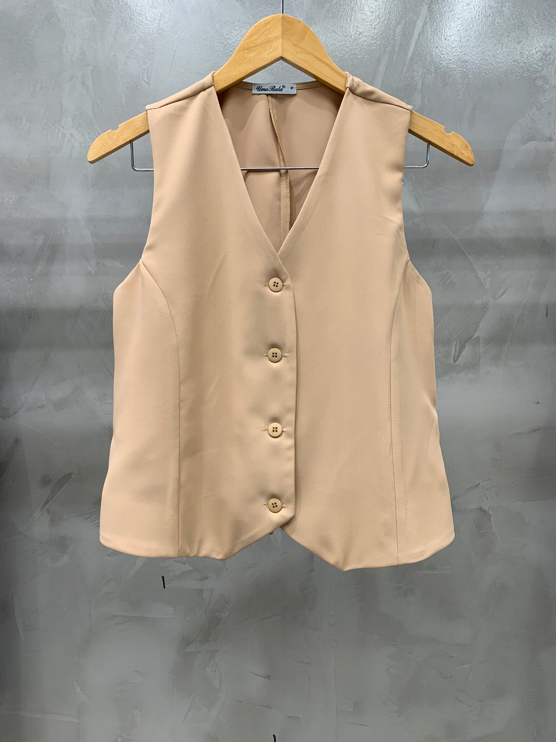 Colete Liso, decote V e barra com corte. Tem detalhe de ajuste traseiro, confeccionado no tecido New Two way.