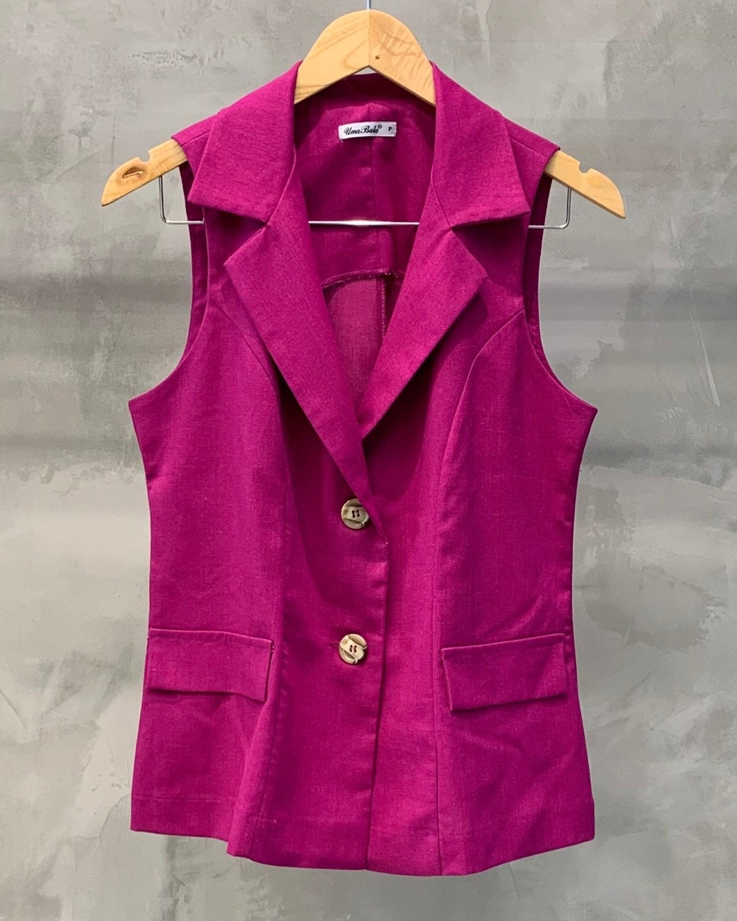 O colete de linho destaca-se por sua modelagem alongada, com acabamentos de alfaiataria. Na parte frontal, apresenta recortes e bolsos falsos embutido e dois botões frontais que adiciona um contraste sutil. Aquela peça que você pode montar diversos looks criativos usando ele como peça principal ou sobreposições.