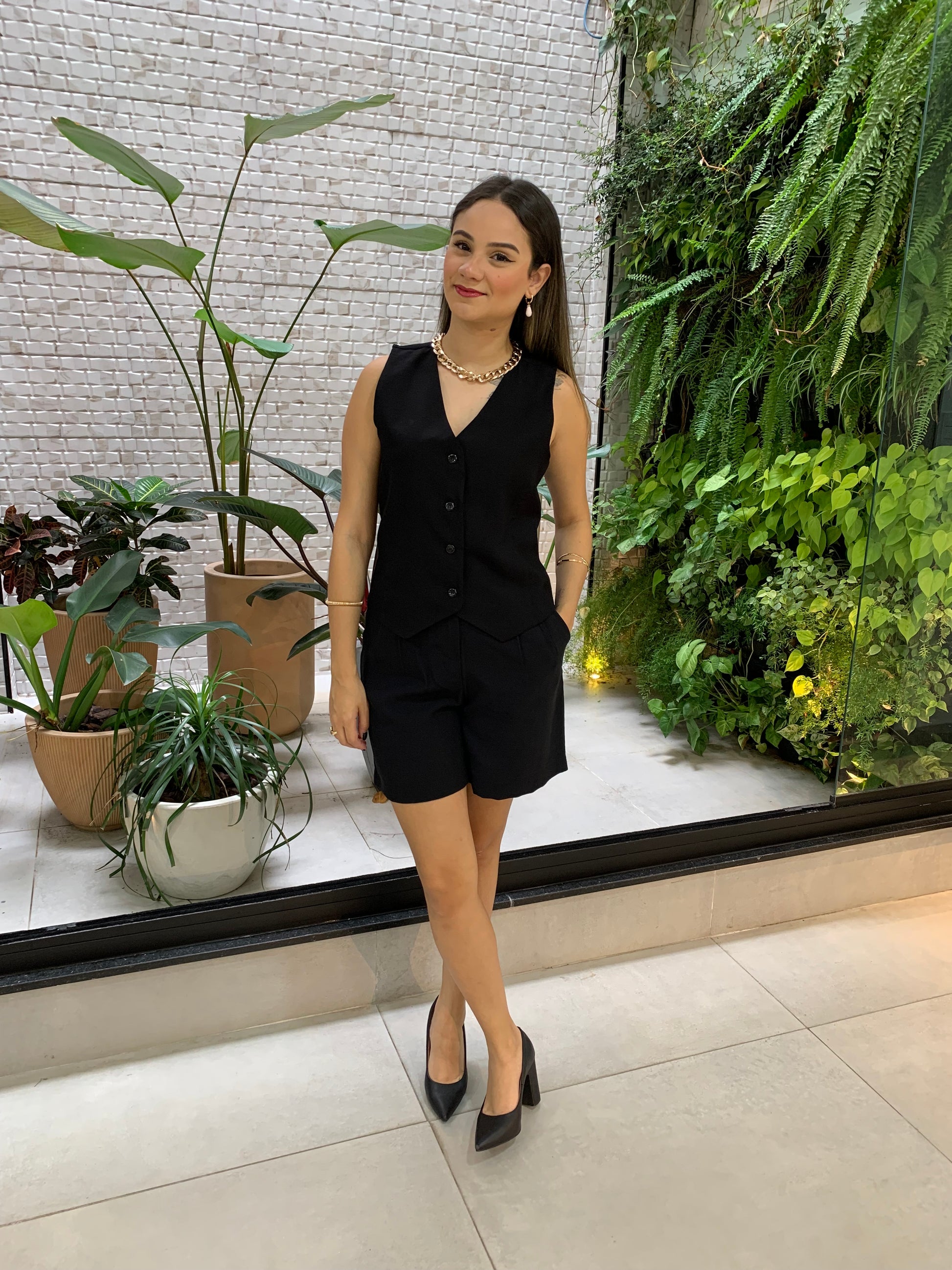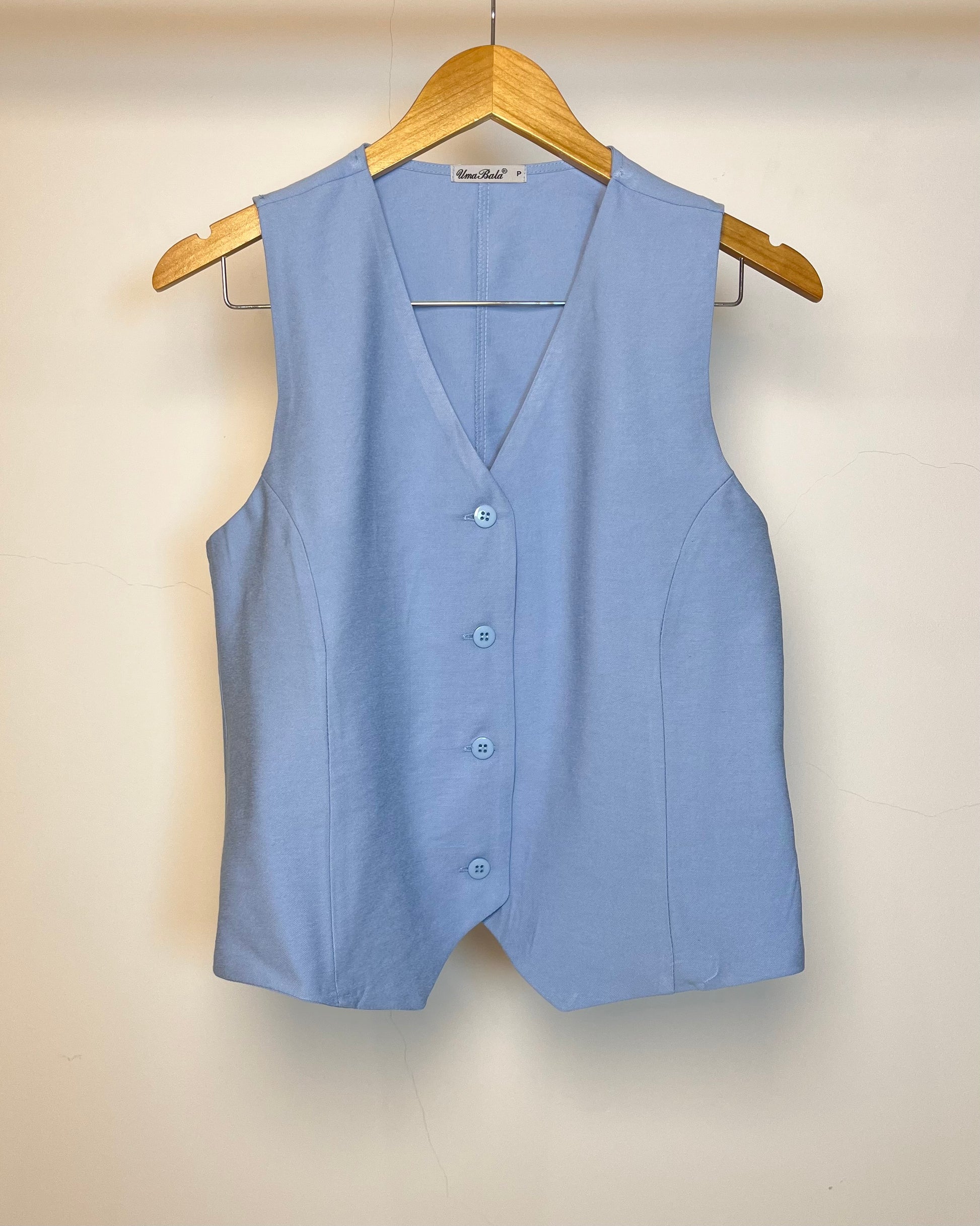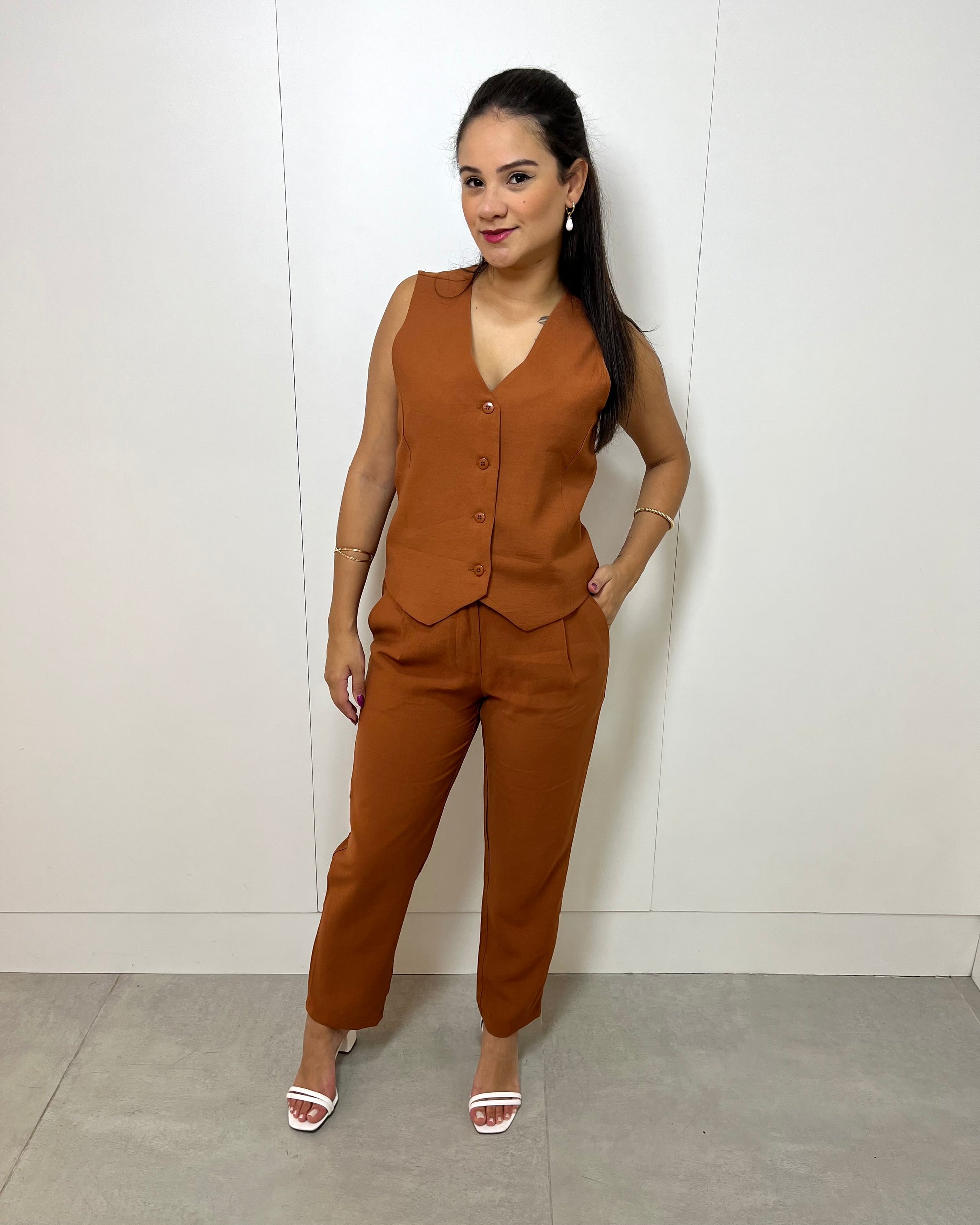 Colete Liso, decote V e barra com corte. Tem detalhe de ajuste traseiro, confeccionado no tecido Marante.