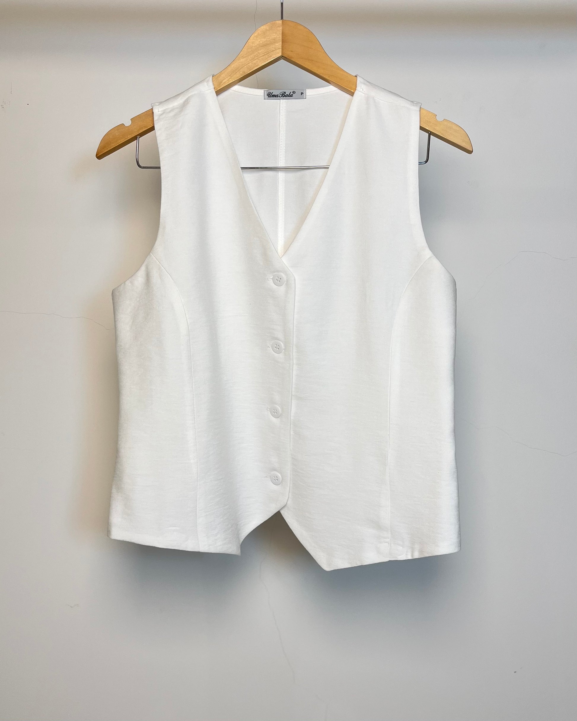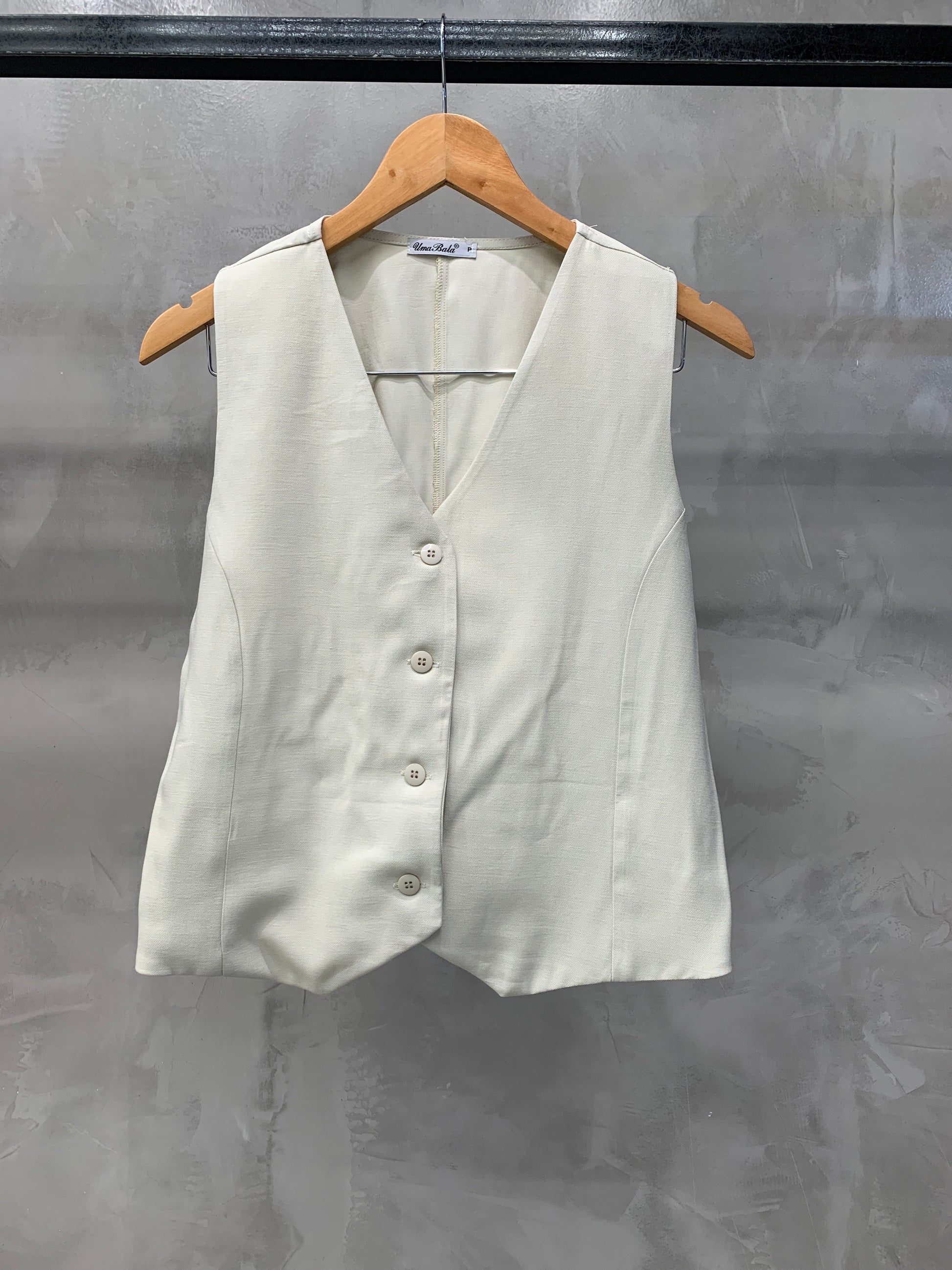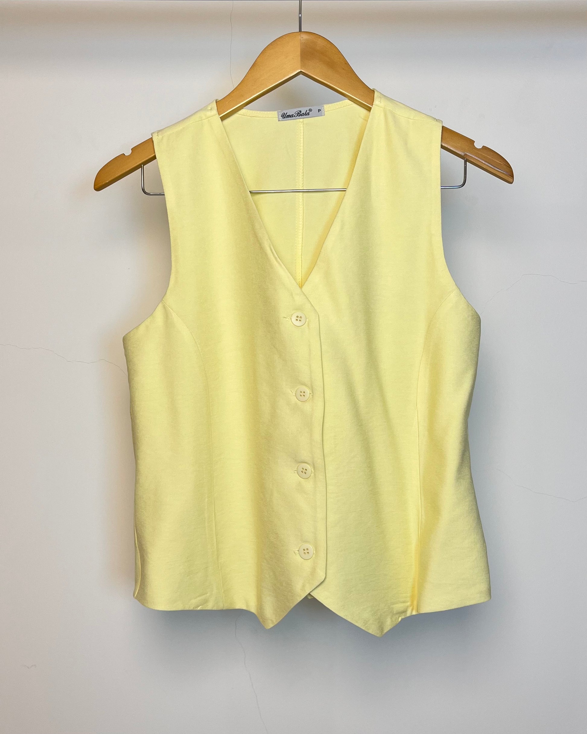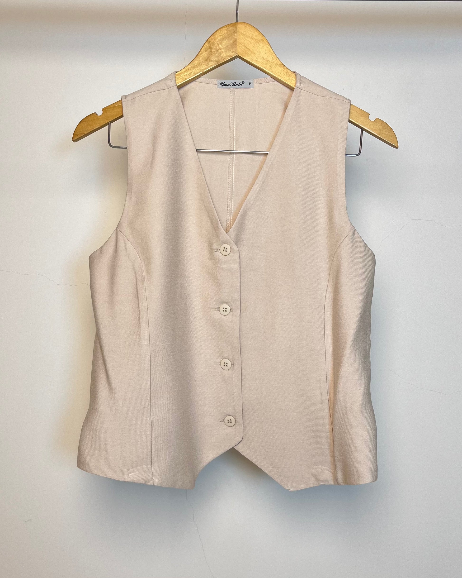 Colete Liso, decote V e barra com corte. Tem detalhe de ajuste traseiro, confeccionado no tecido Marante.