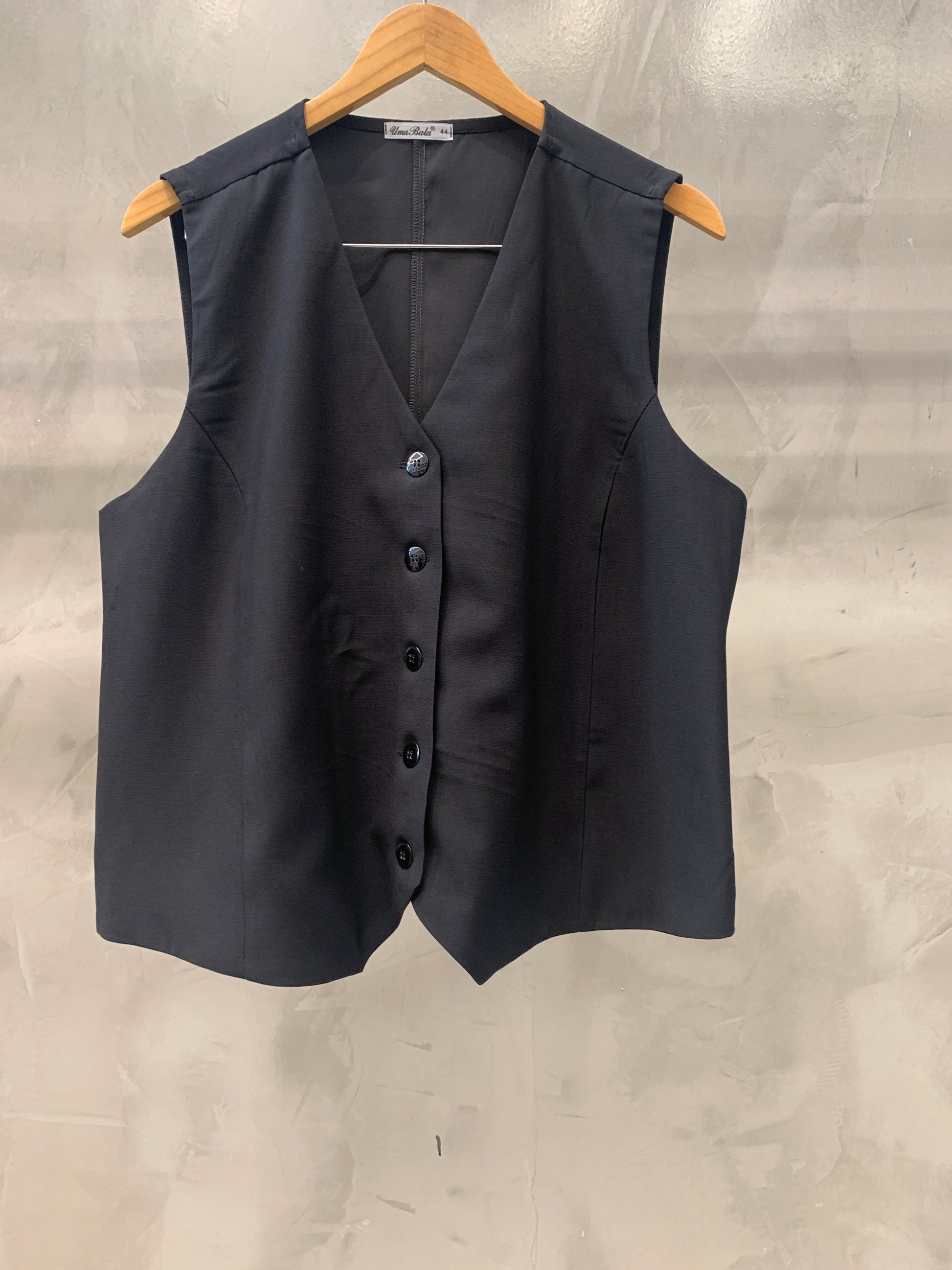 Colete Plus Liso, decote V e barra com corte. Tem detalhe de ajuste traseiro, confeccionado no tecido Marante.