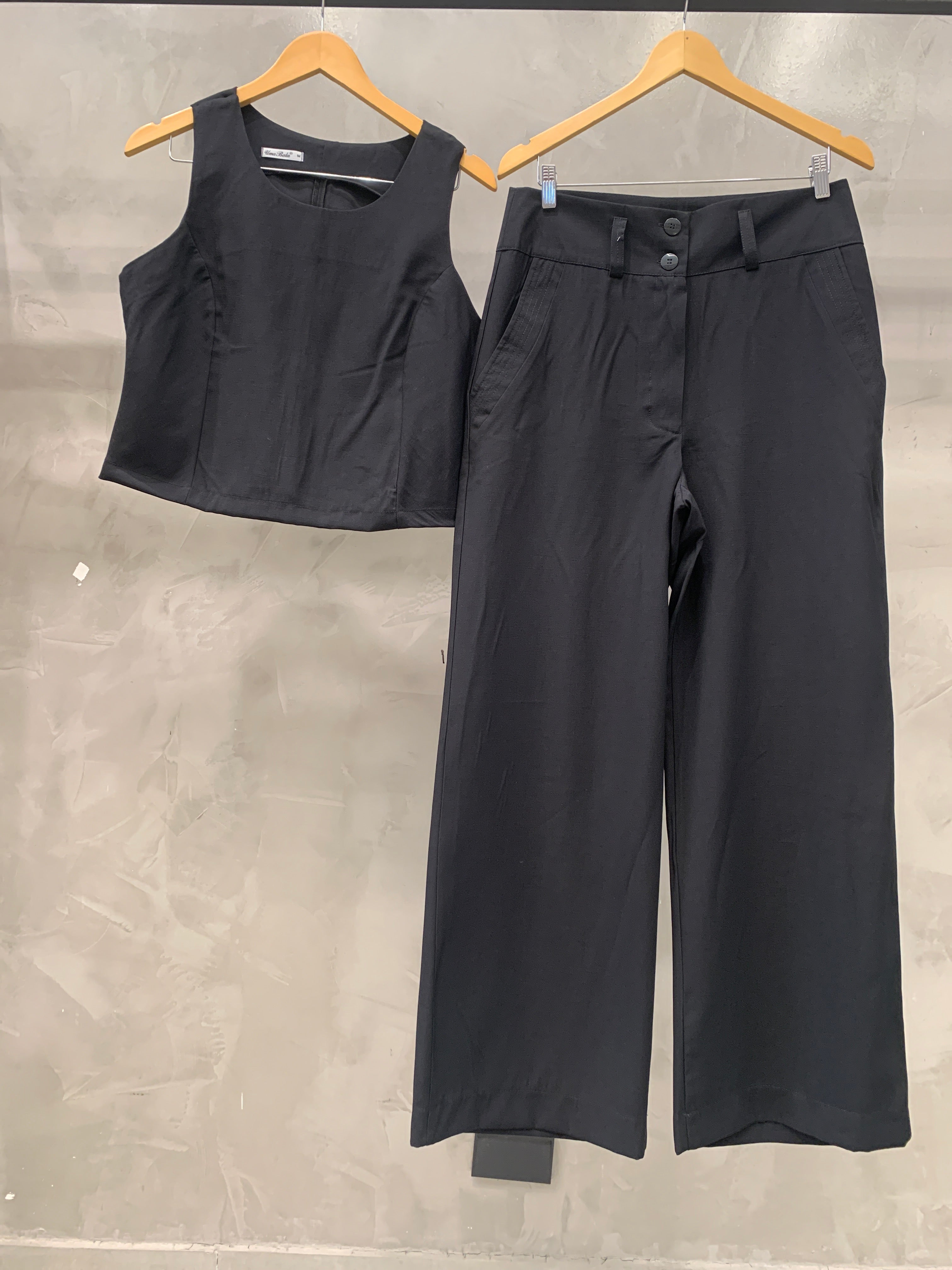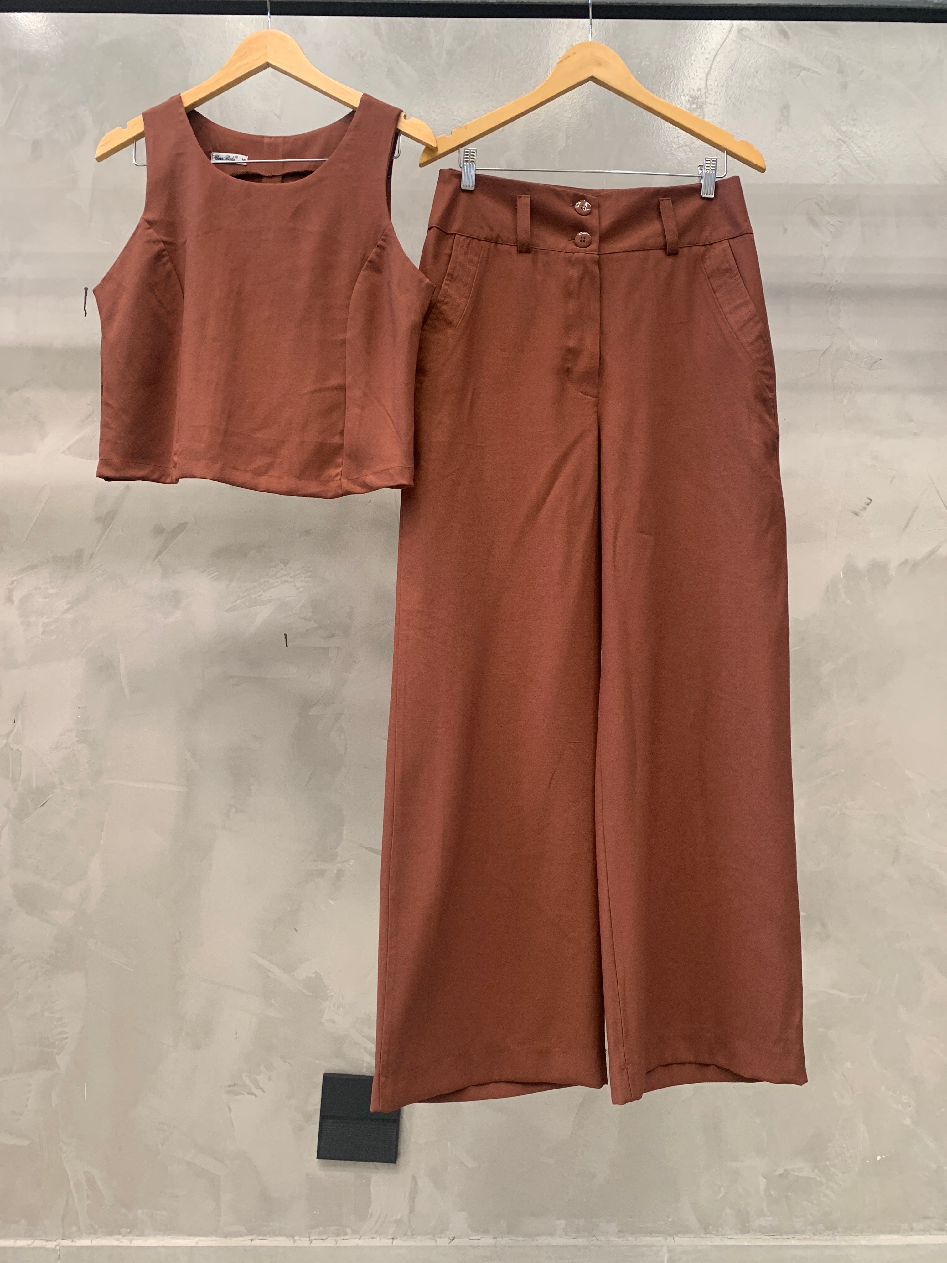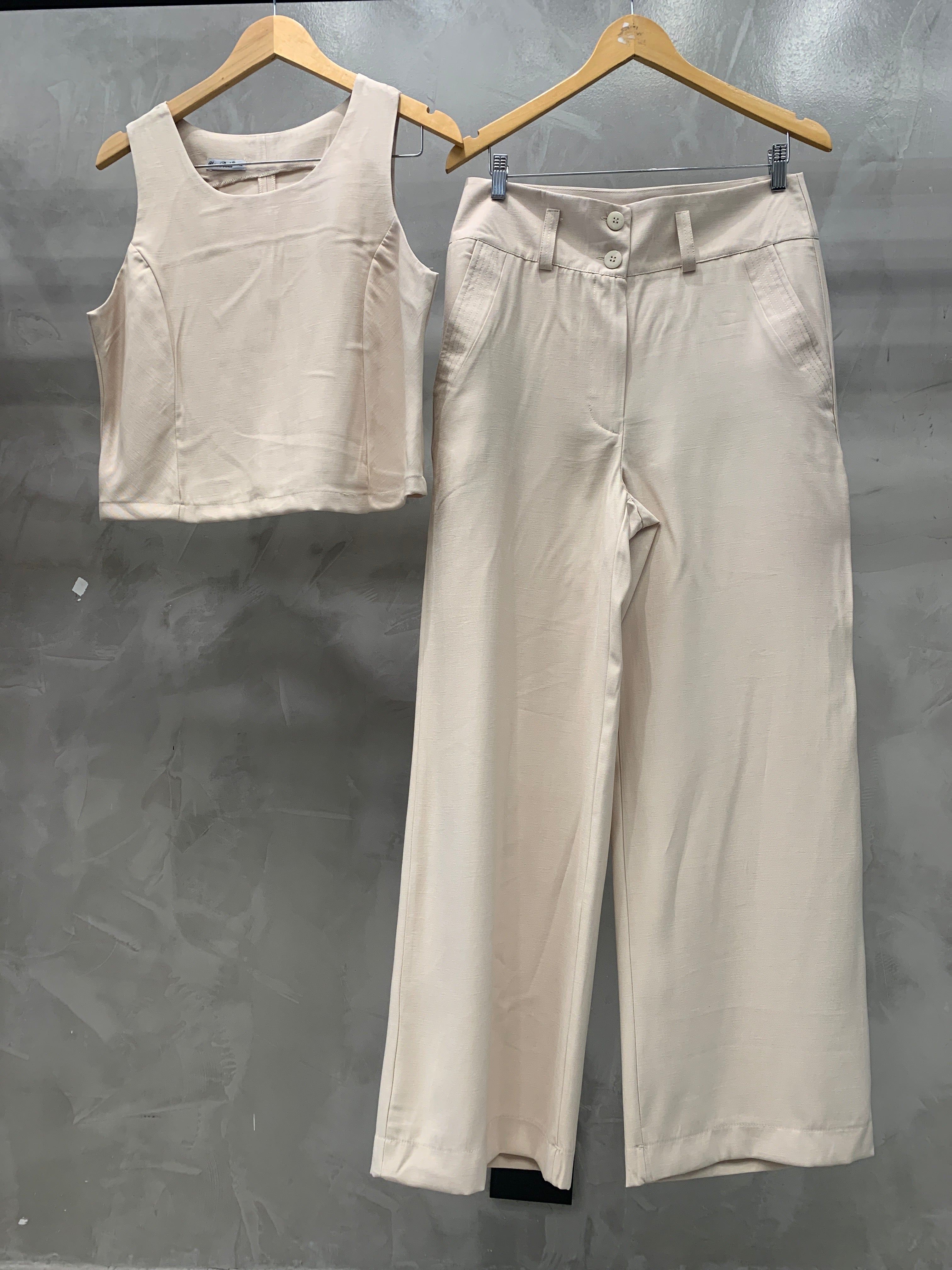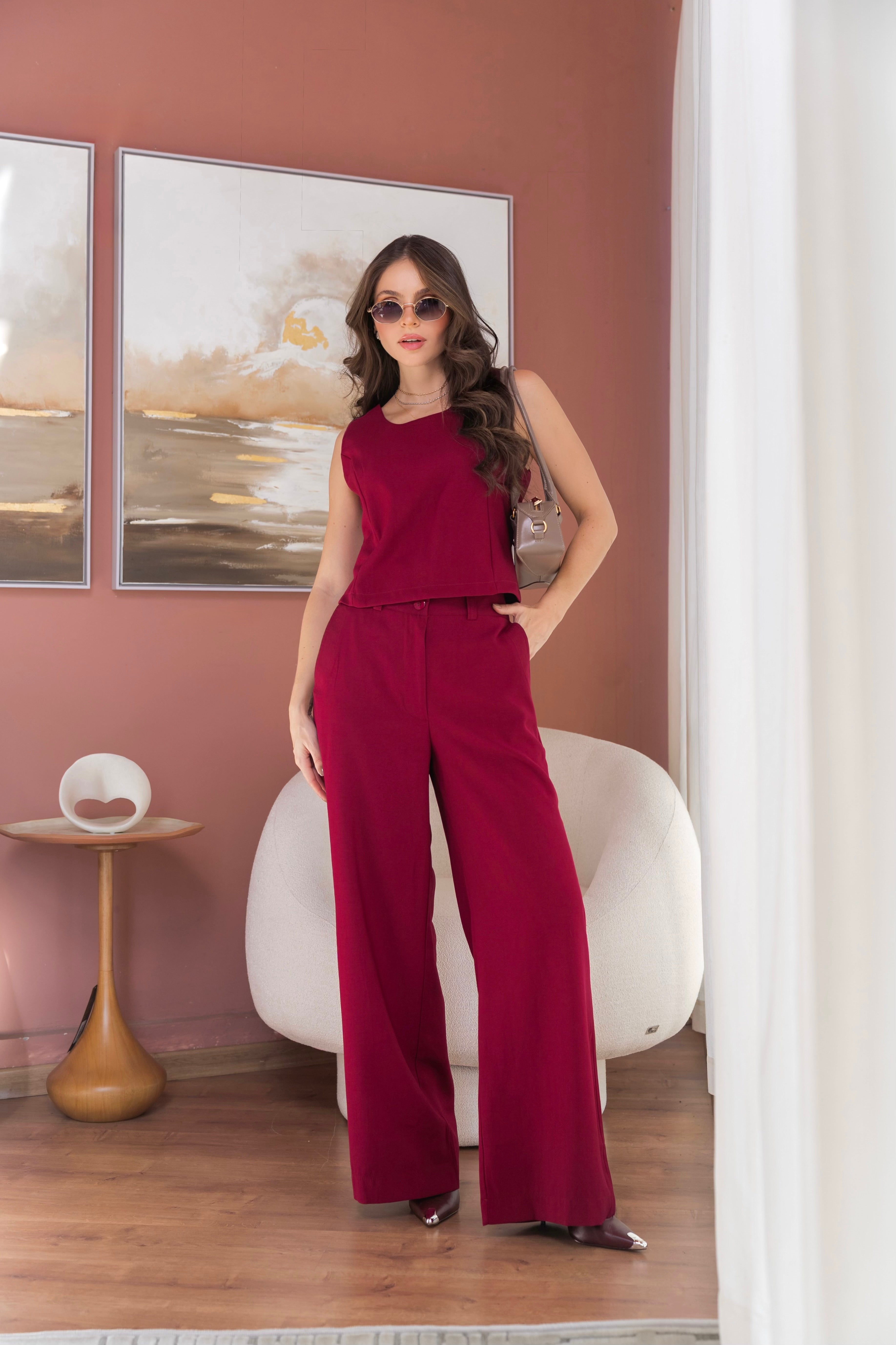 Conjunto de top cropped com decote redondo, fechamento por zíper traseiro e calça reta. Uma peça simples e versátil!