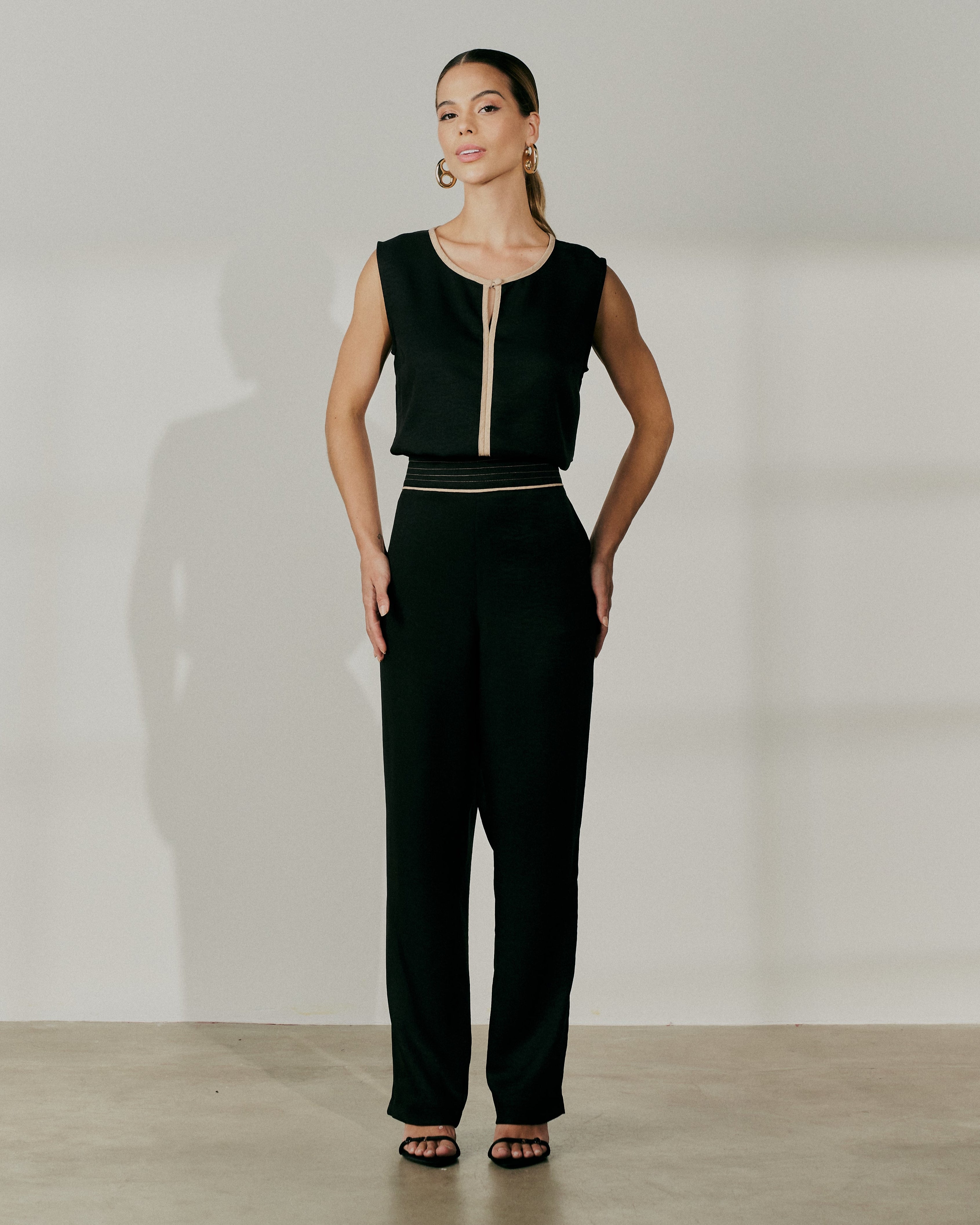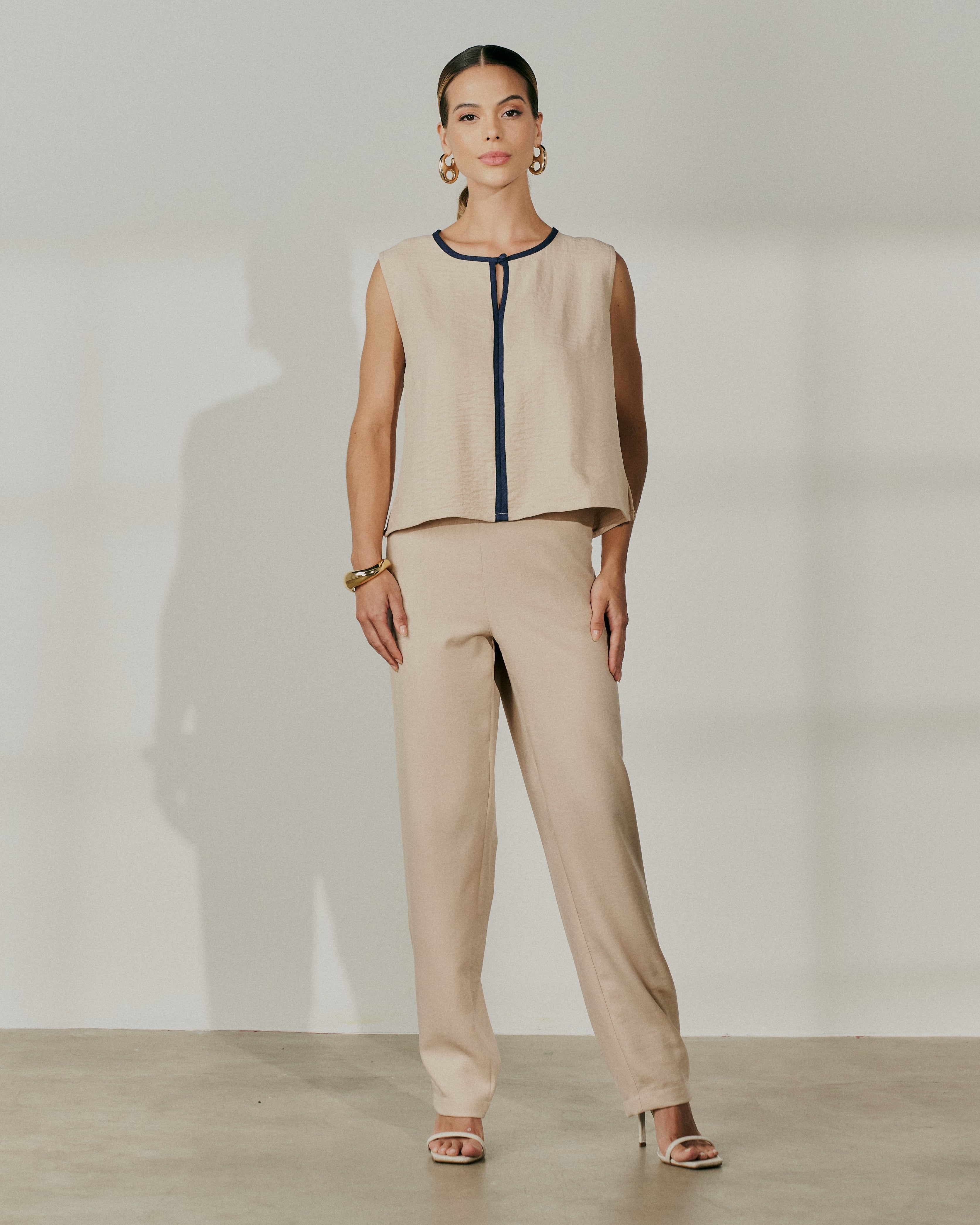 Conjunto Calça e Regata com Detalhe de Botão na Gola Azul Marinho