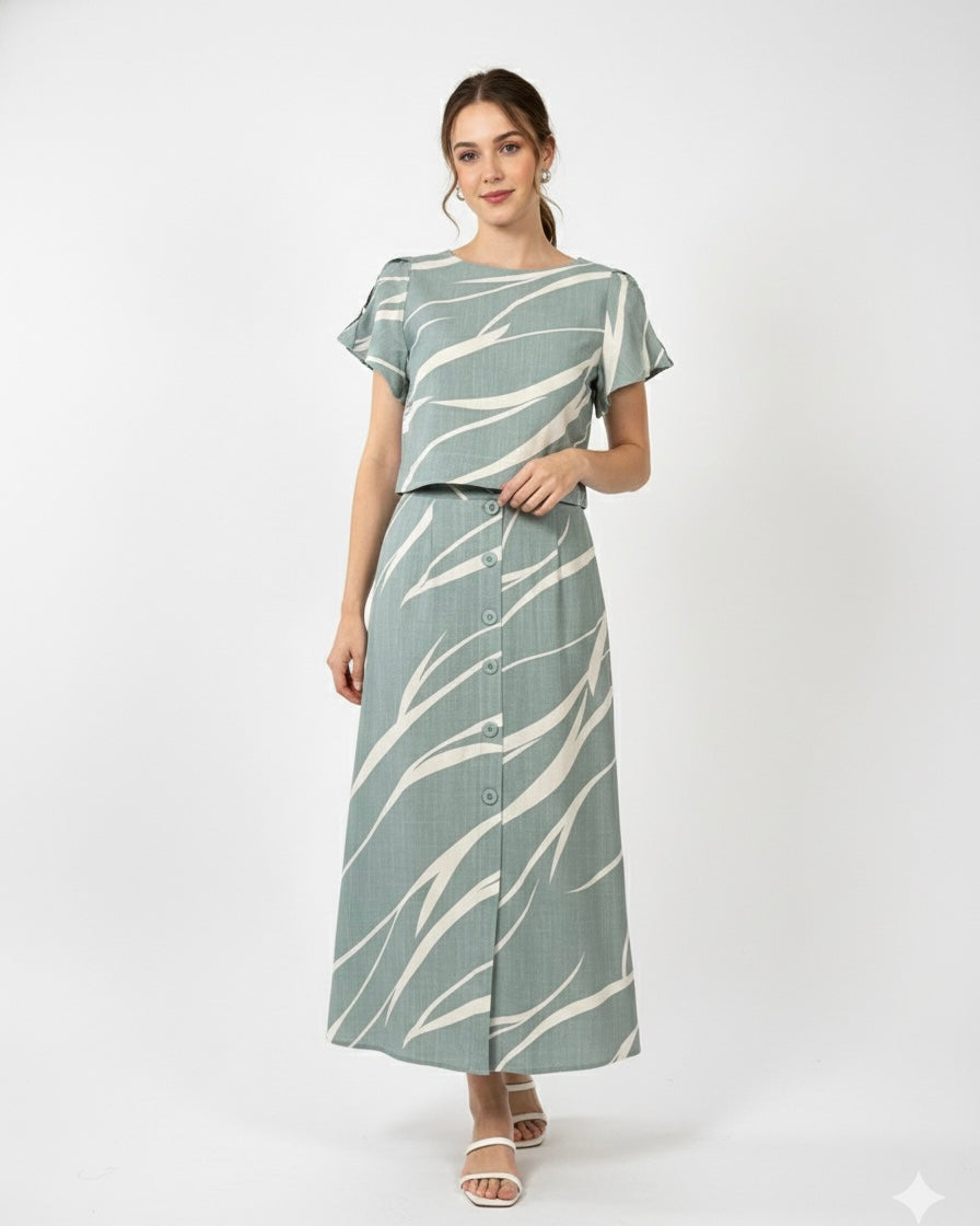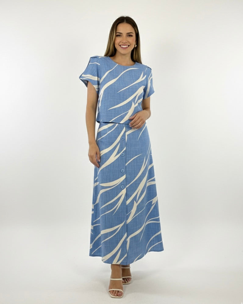 Conjunto Estampado de blusa de manga curta cropped e saia midi, confeccionados no Viscose estampado. Tem detalhes de botões que dão aquele destaque no look! Possui forro na saia.