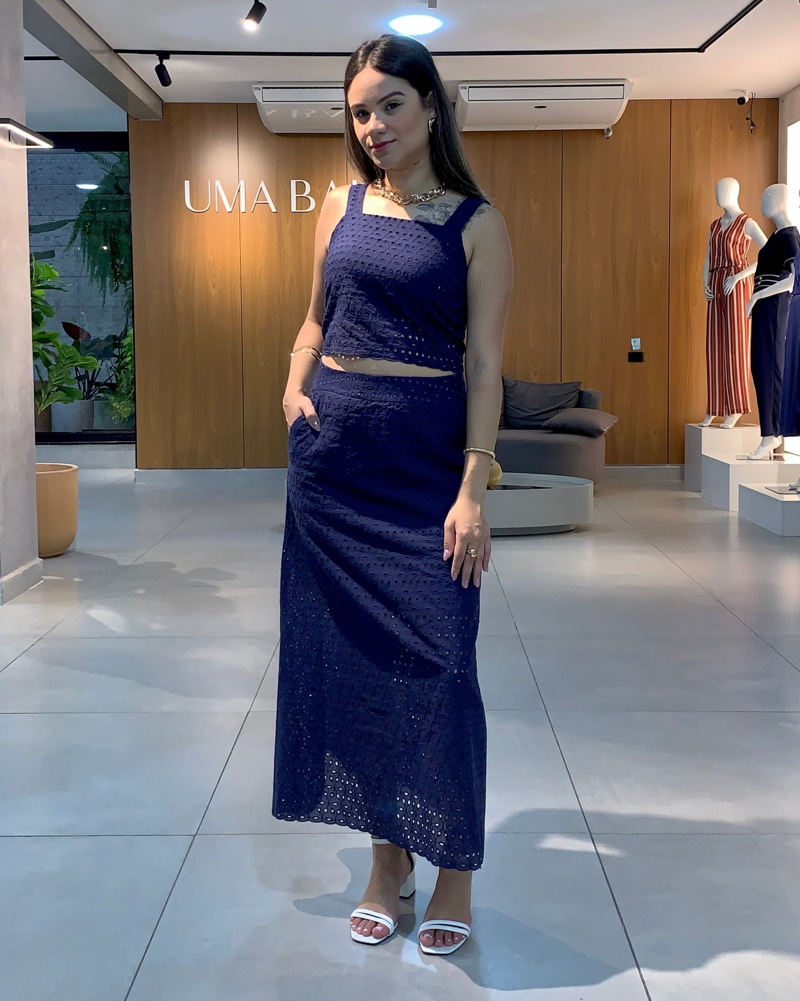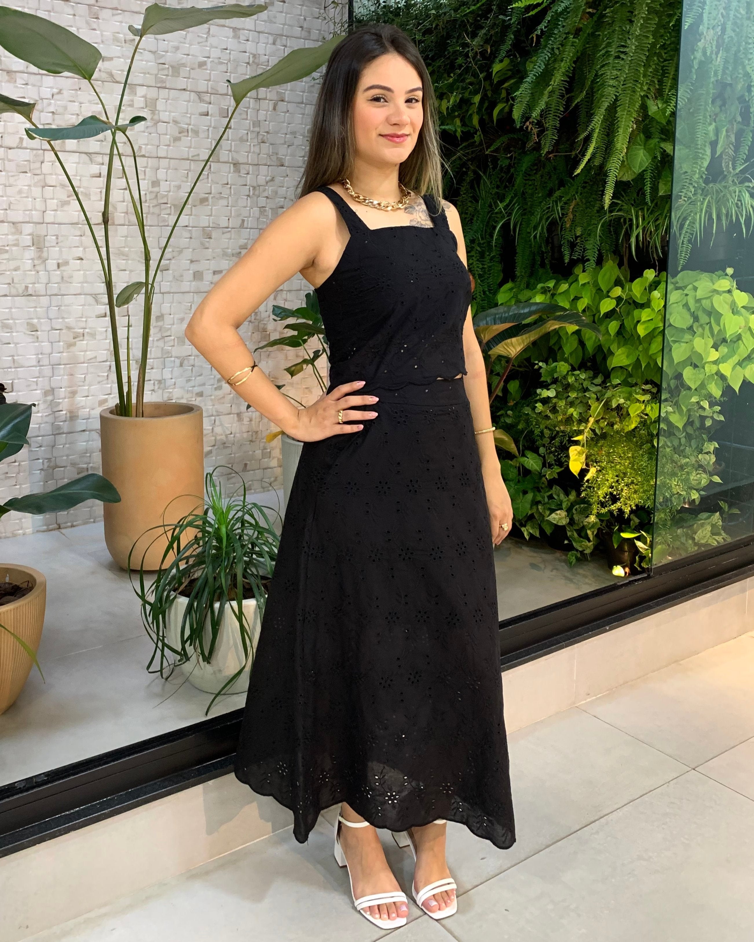 Conjunto de regata cropped e saia mídi, confeccionados no laise, o tecido do verão! A regata tem alça larga, elástico traseiro e a saia possui zíper traseiro e forro