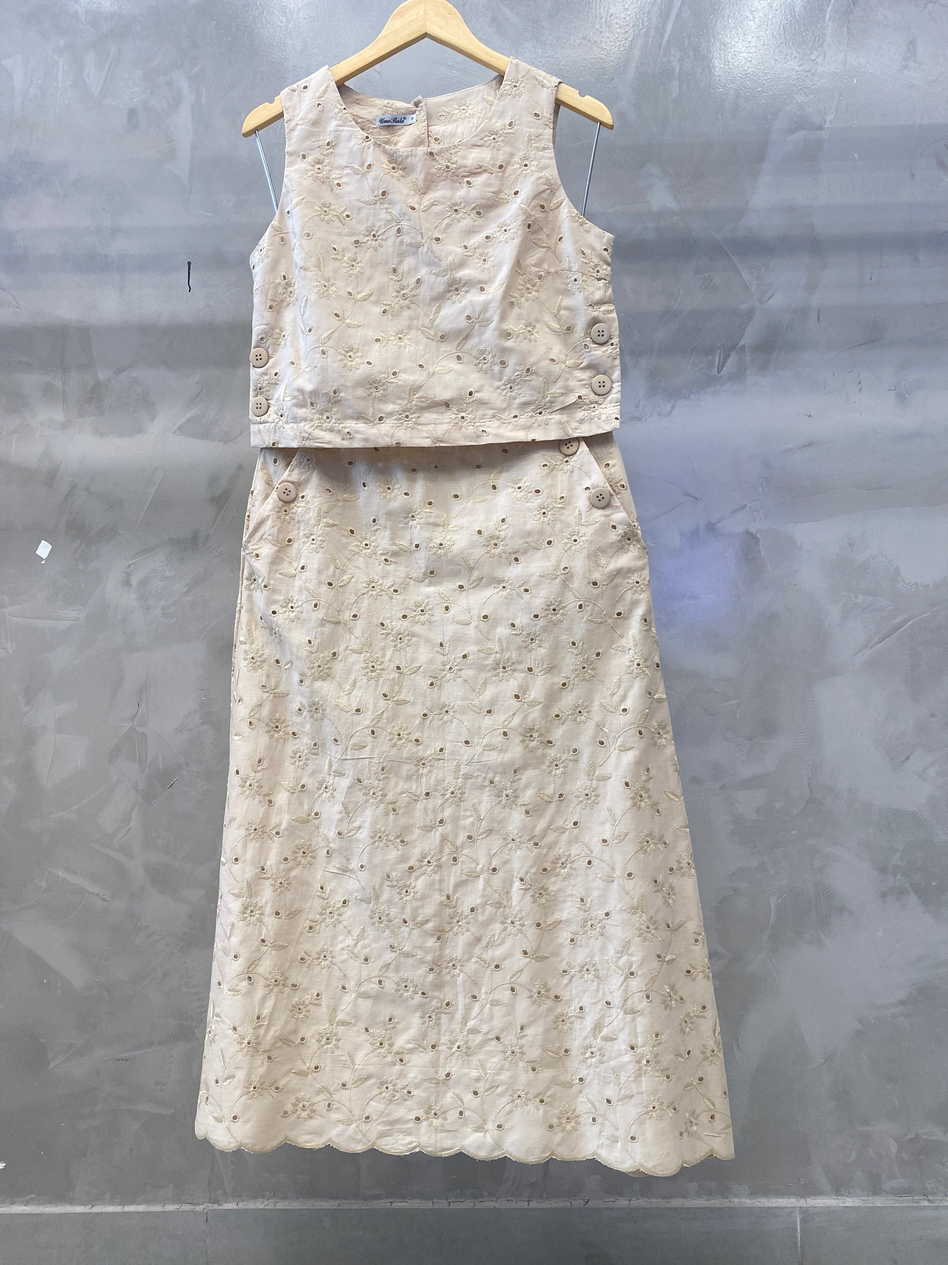 Conjunto de regata alça larga cropped e saia mídi, ambos tem detalhes de botões que dão todo charme para peça. É confeccionado no algodão bordado e na saia possui forro.