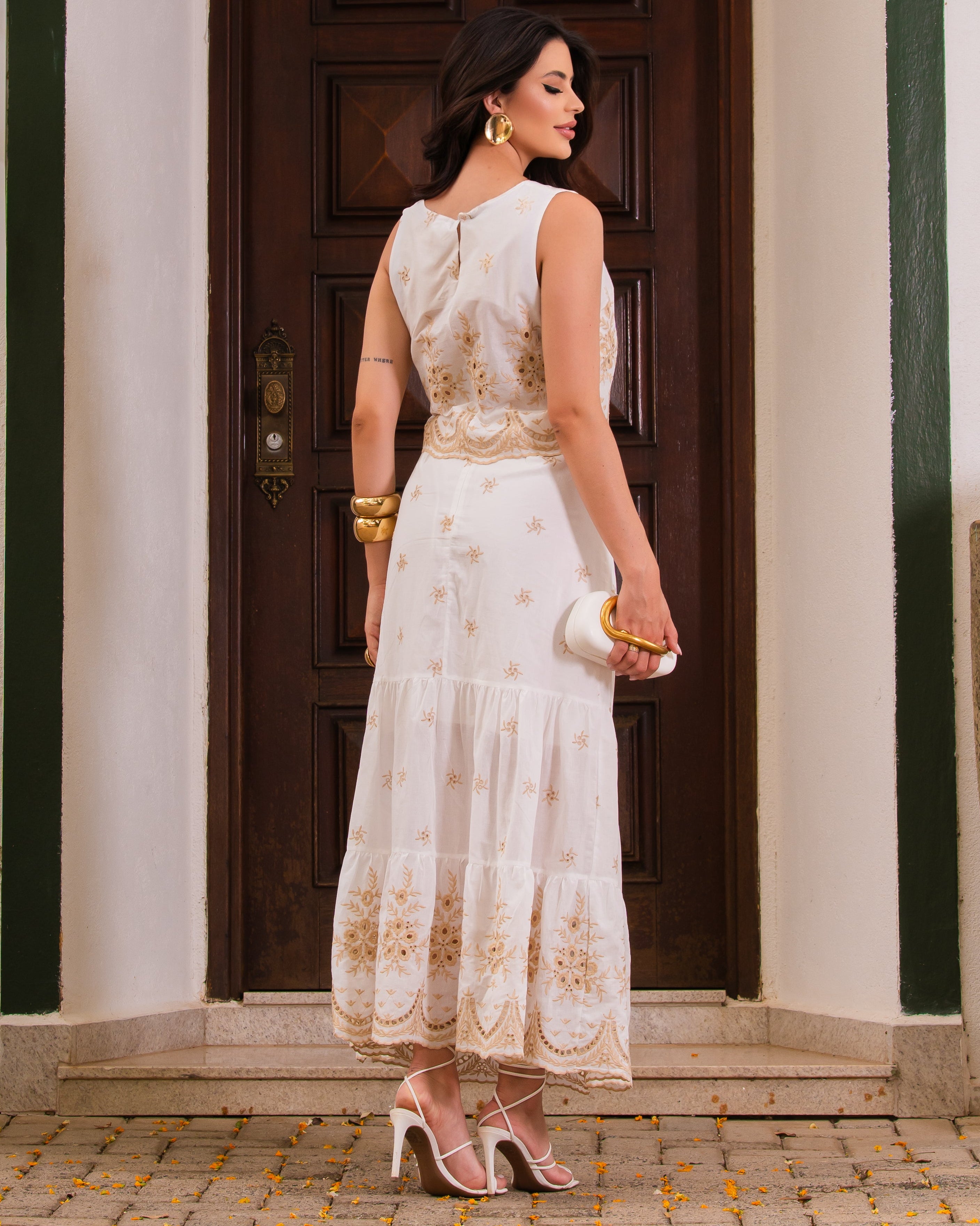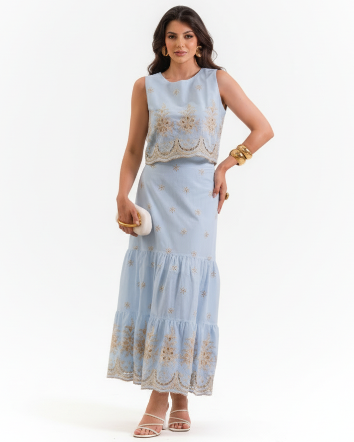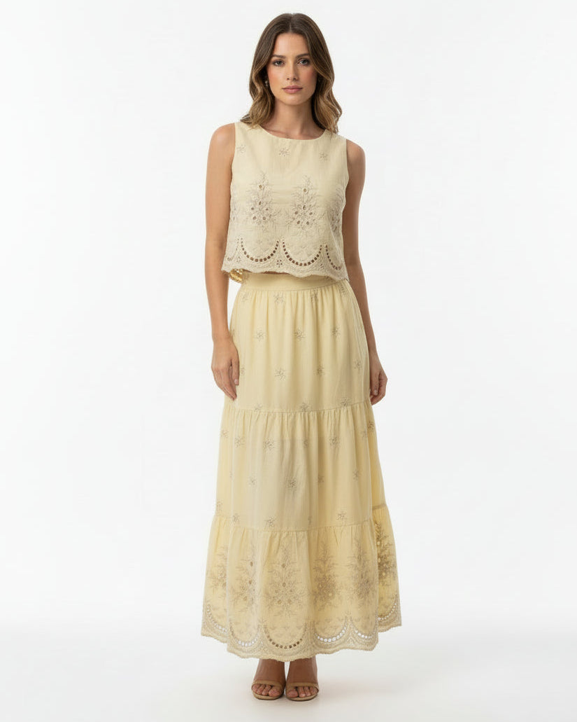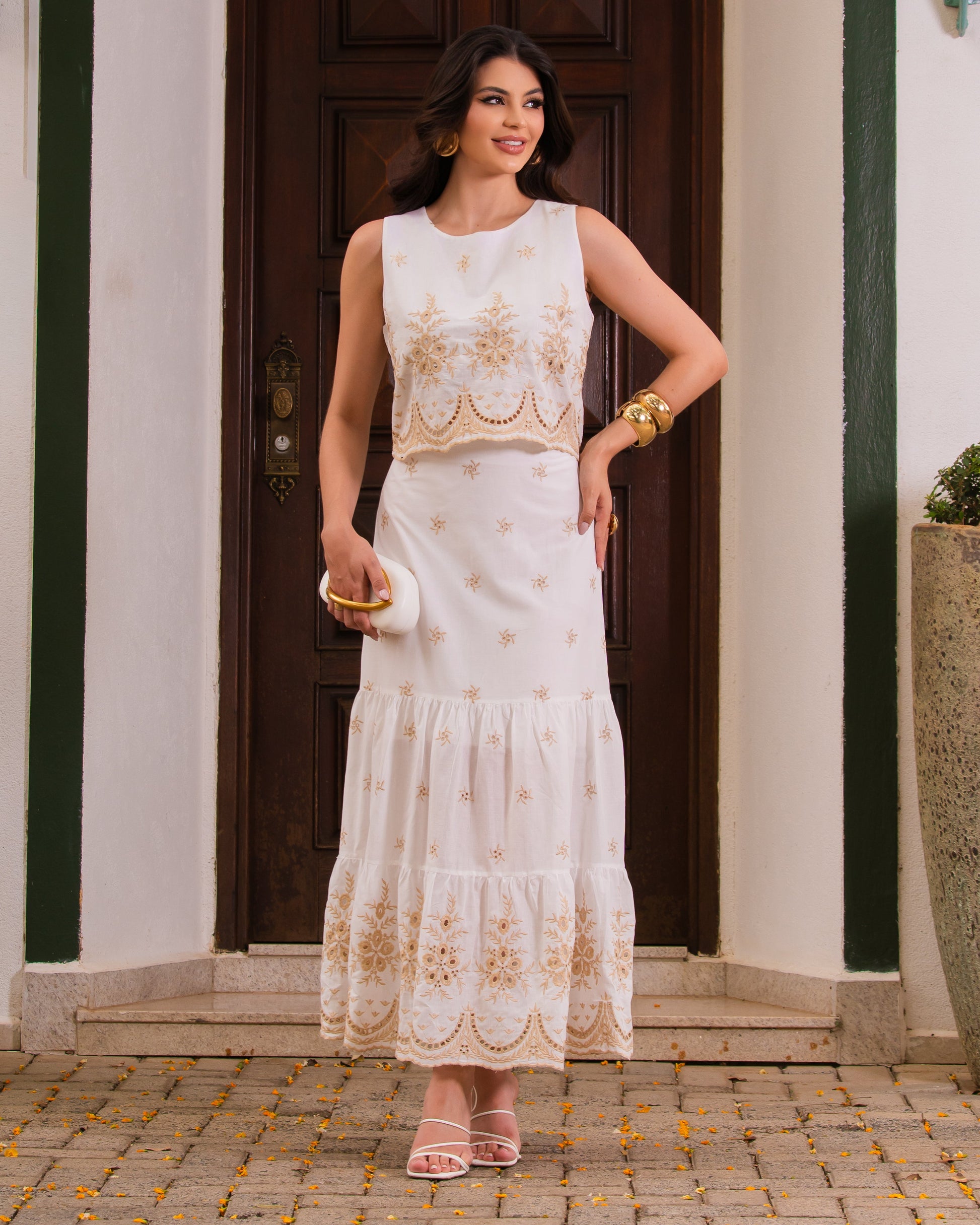 Conjunto Laise de regata alças largas em decote canoa e saia babados com detalhe barrado. É aquela peça perfeita para o final do ano que está por vir! Confeccionada no tecido de algodão com detalhes bordados, tendo zíper e forro na saia.