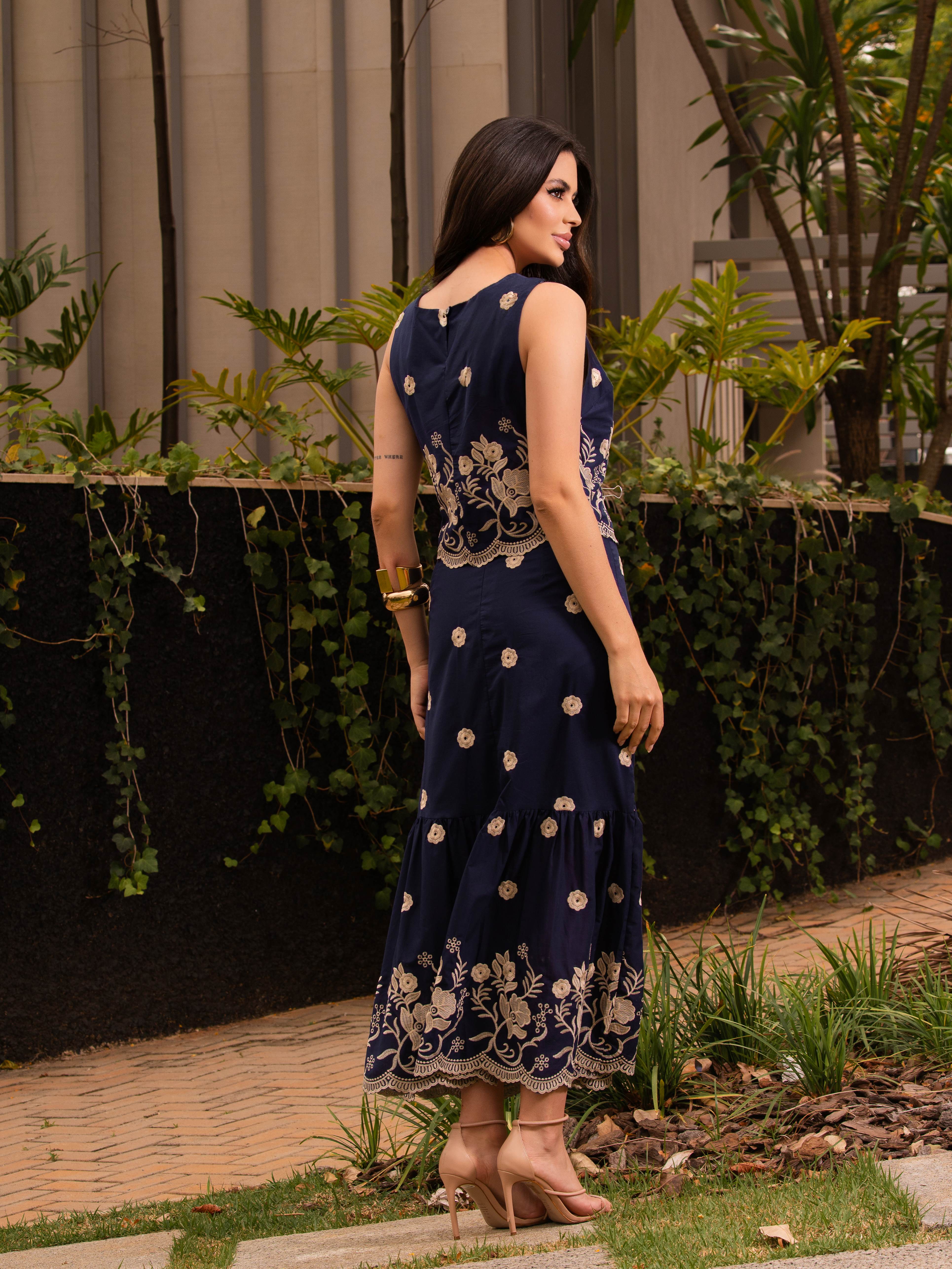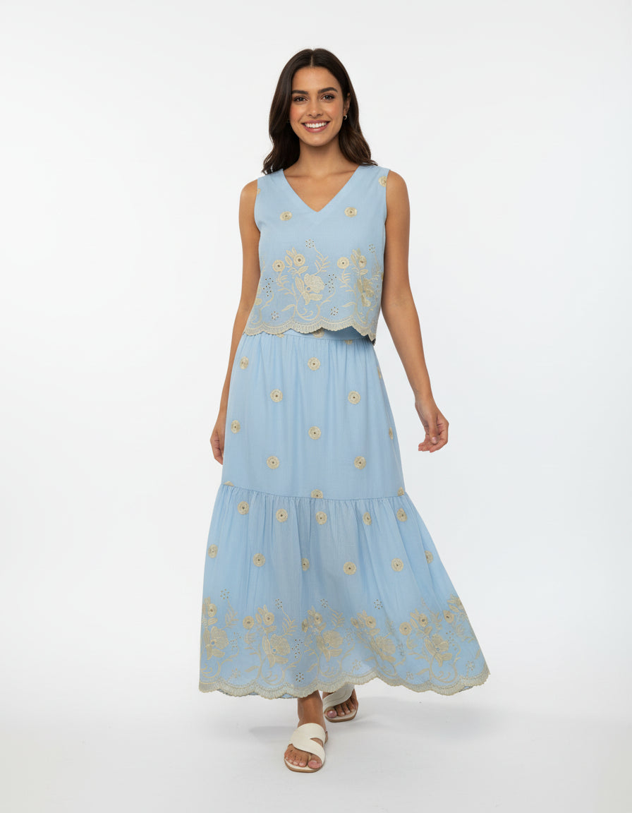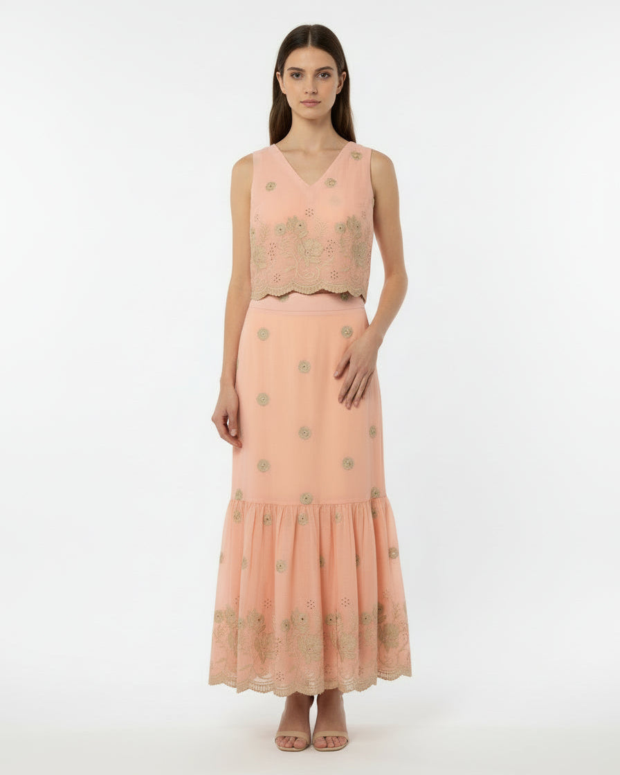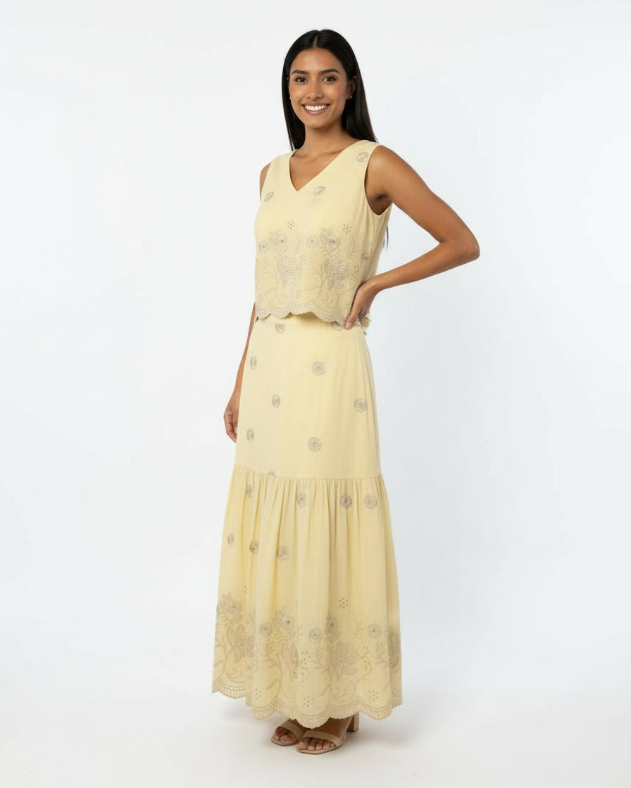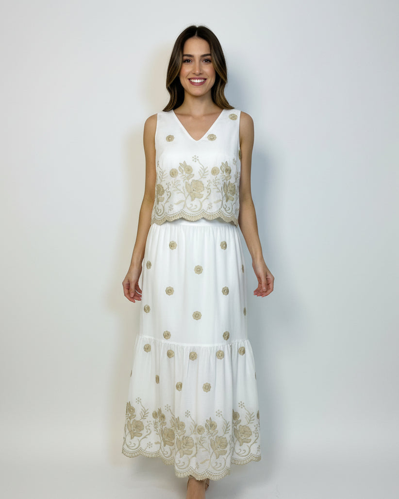 Conjunto Laise de regata alça grossa e decote V e saia com um babado na barra. O tecido é bordado com a estampa barrada, que dá um charme na peça. Possui forro na saia.