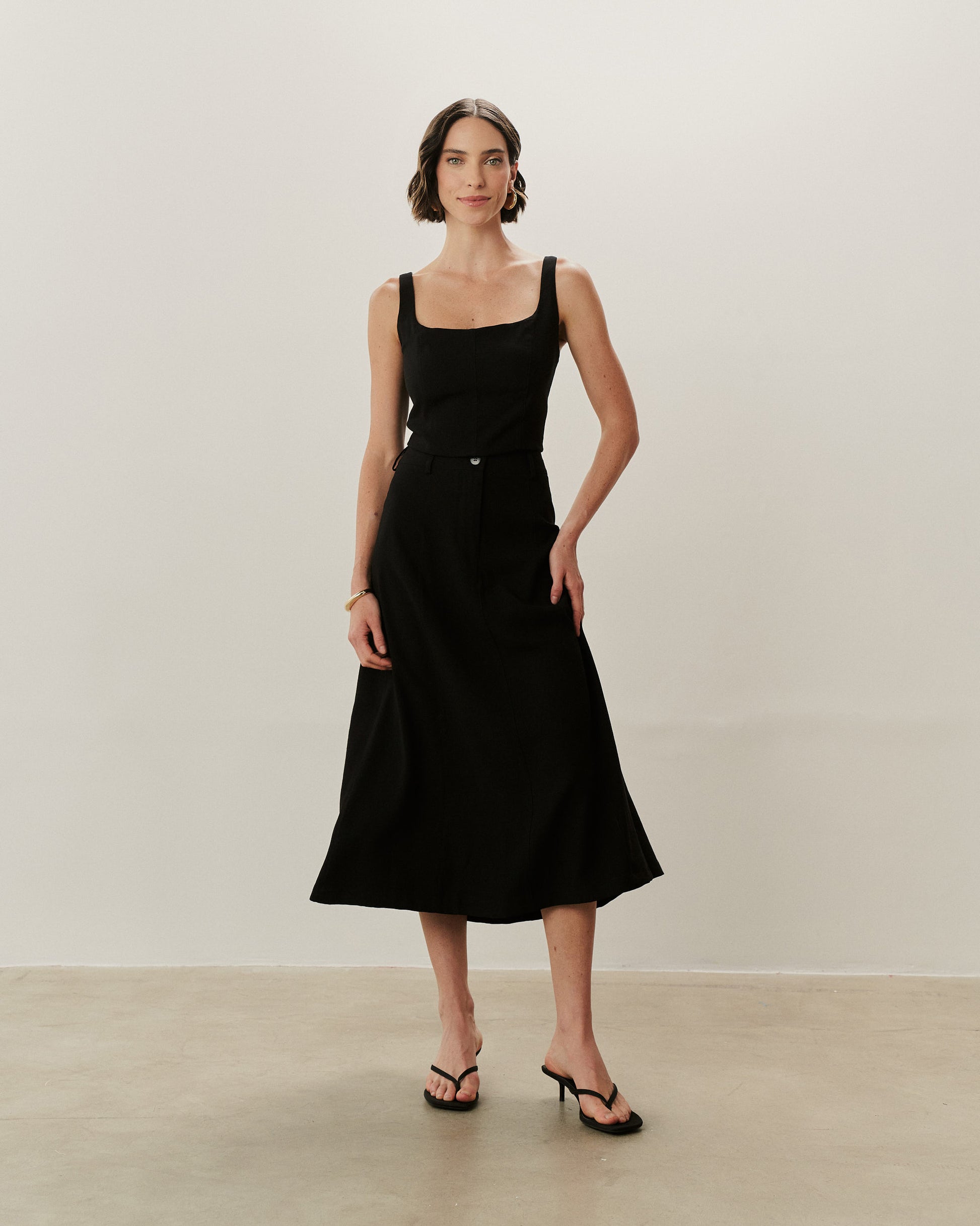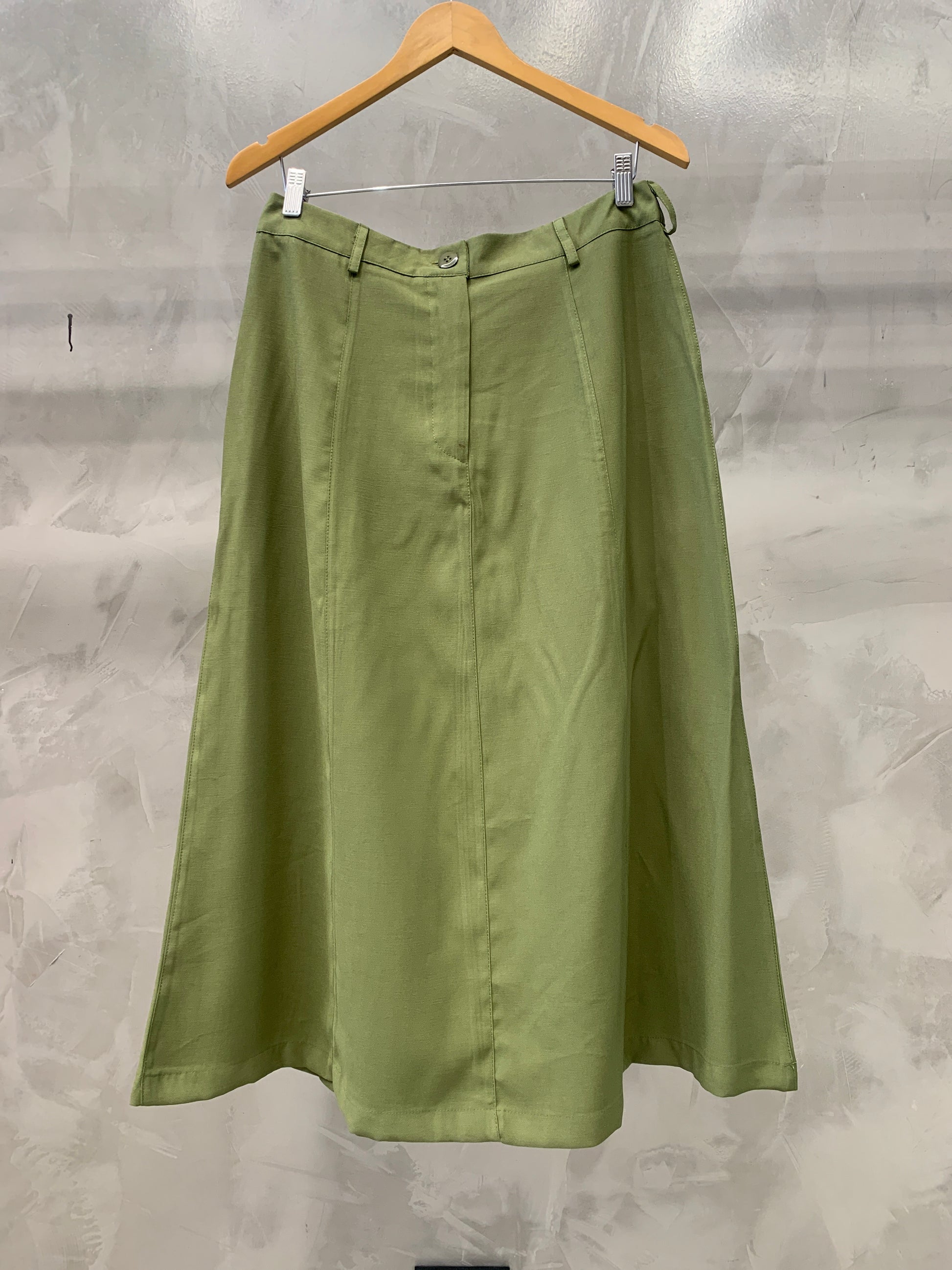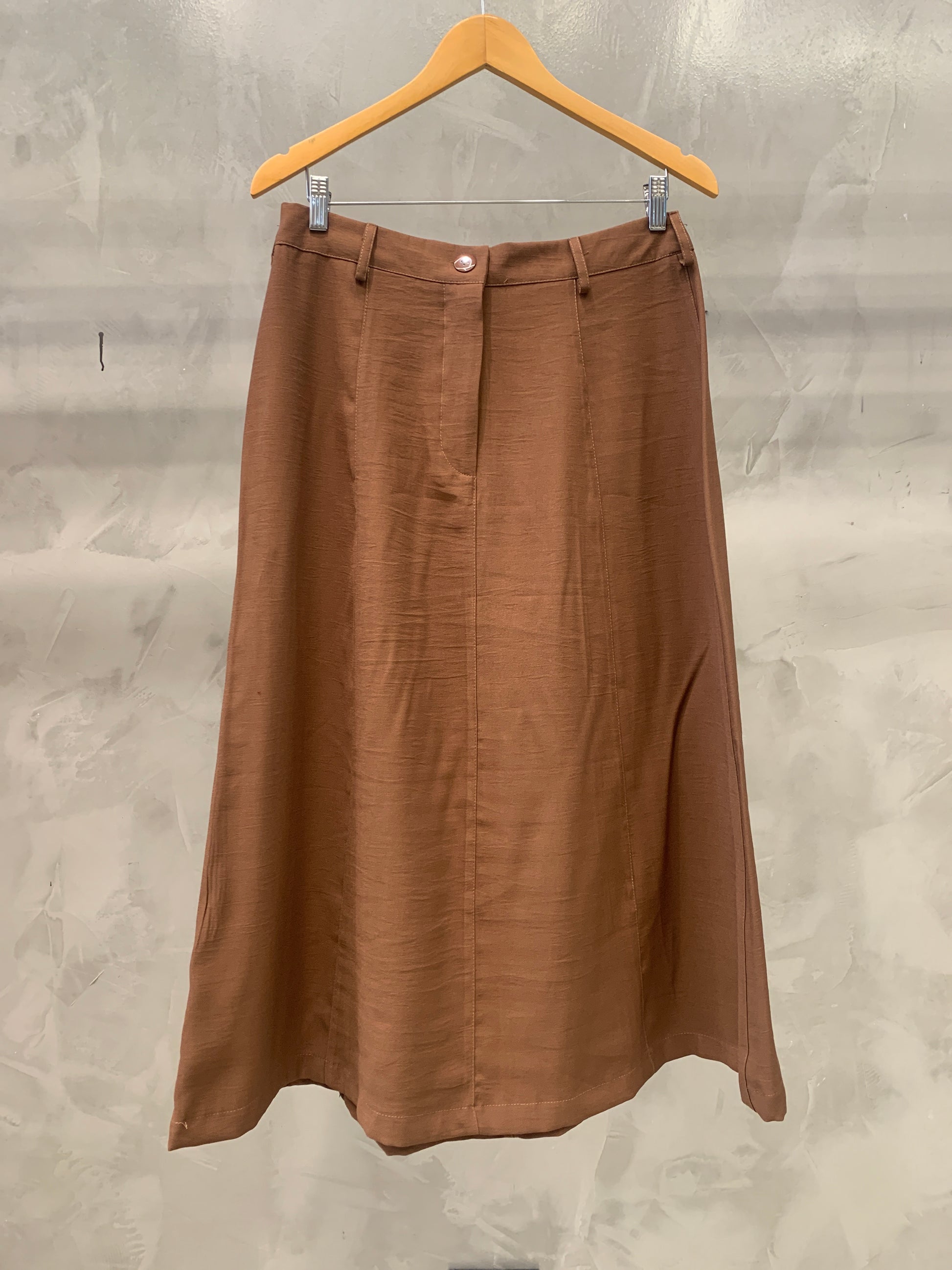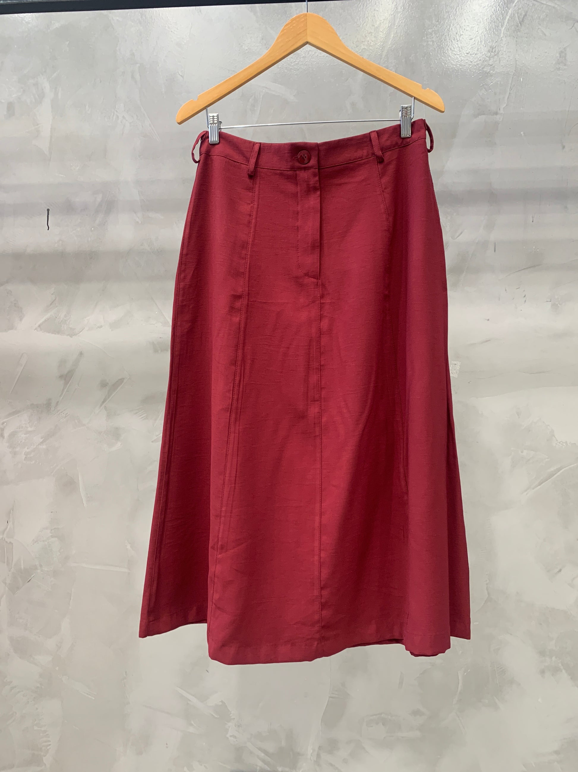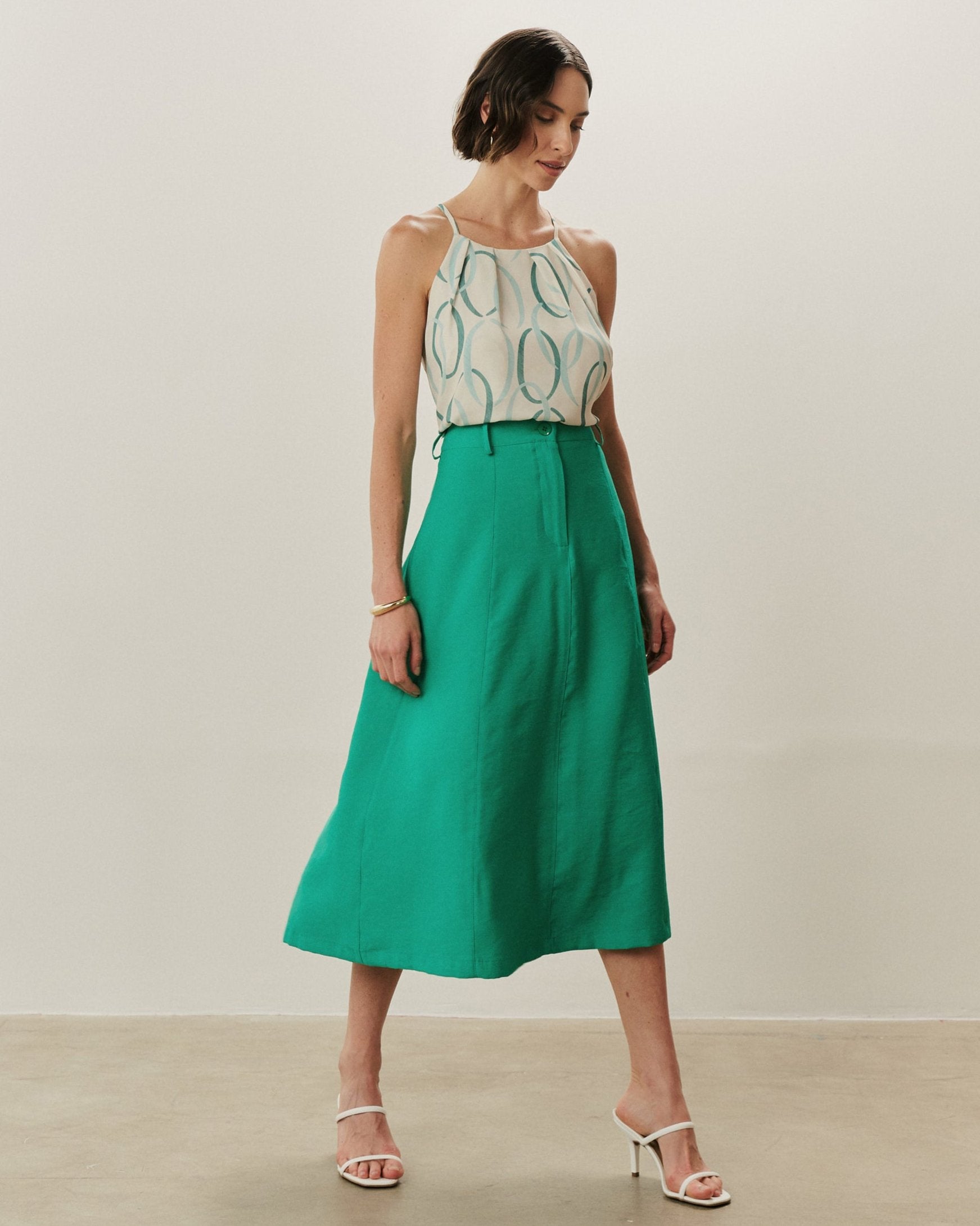 Saia midi com modelagem evasê e pespontos. Uma peça feminina e delicada, conseguindo montar diversos looks com ela. O fechamento é por botão e zíper frontal. Confeccionado no tecido Marante.