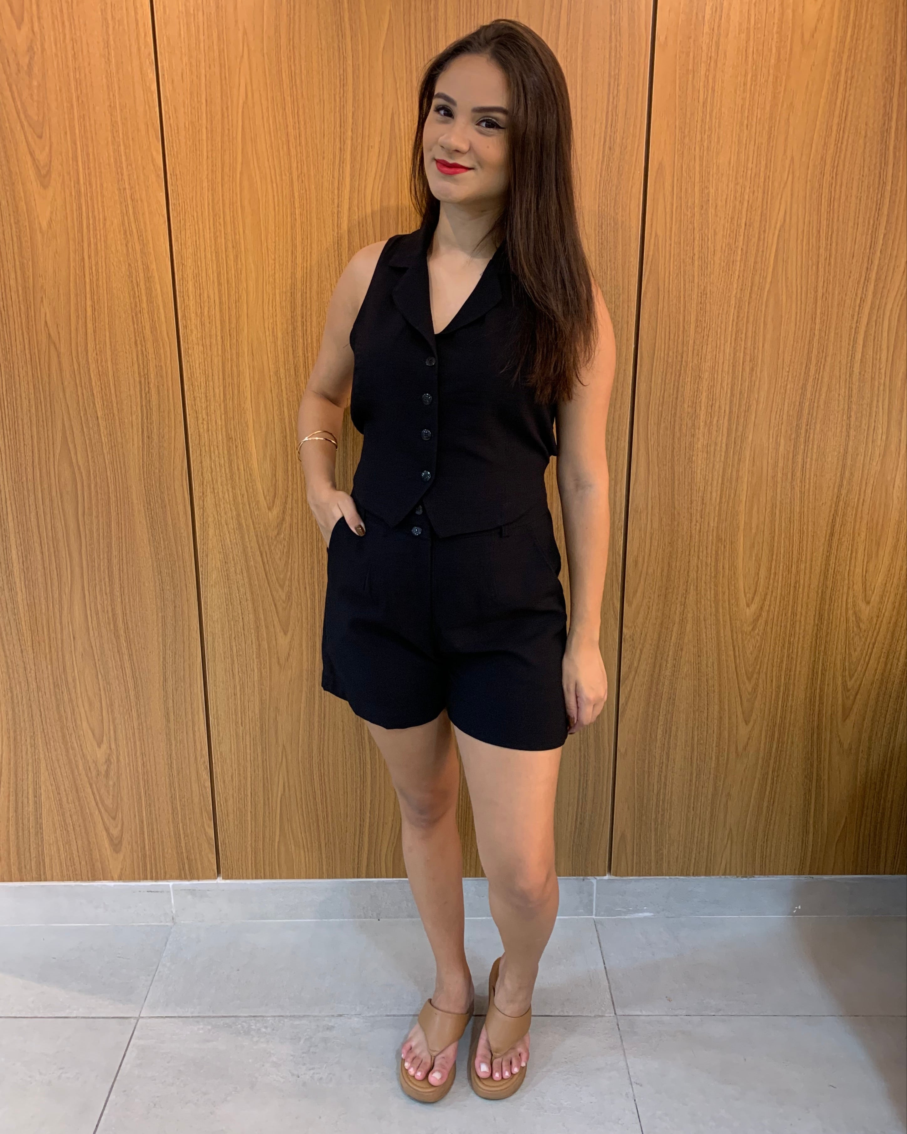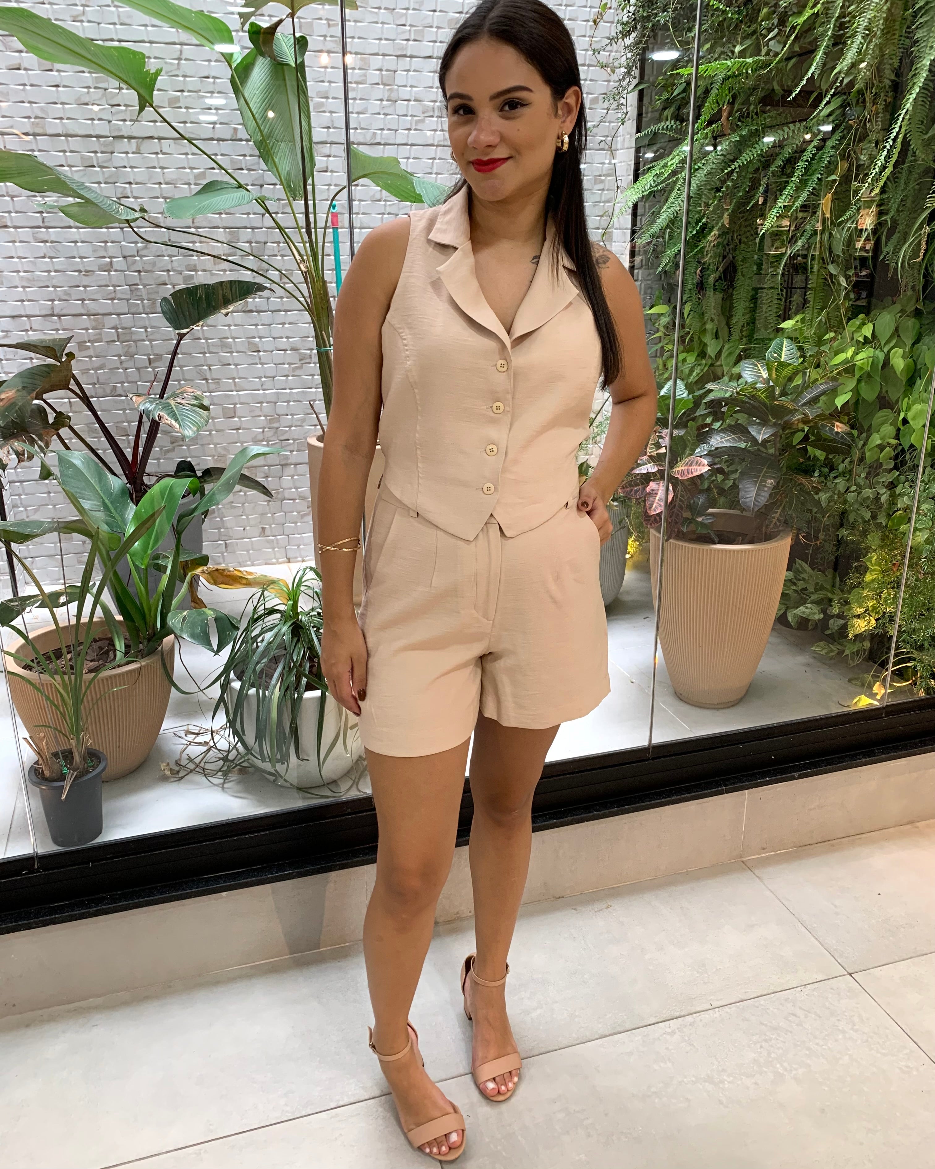 Conjunto de colete cropped com decote V, alças largas, amarração traseira ajustável e shorts com pregas frontais e bolsos laterais. Um look perfeito para o dia a dia corrido. Ambos tem botões frontais na mesma cor do tecido que dá todo charme na peça. Confeccionado no tecido Marante.