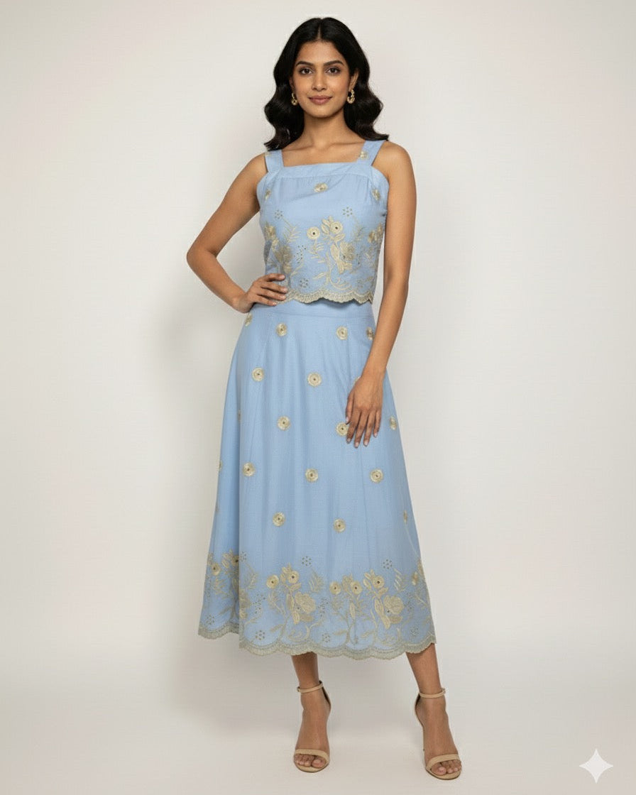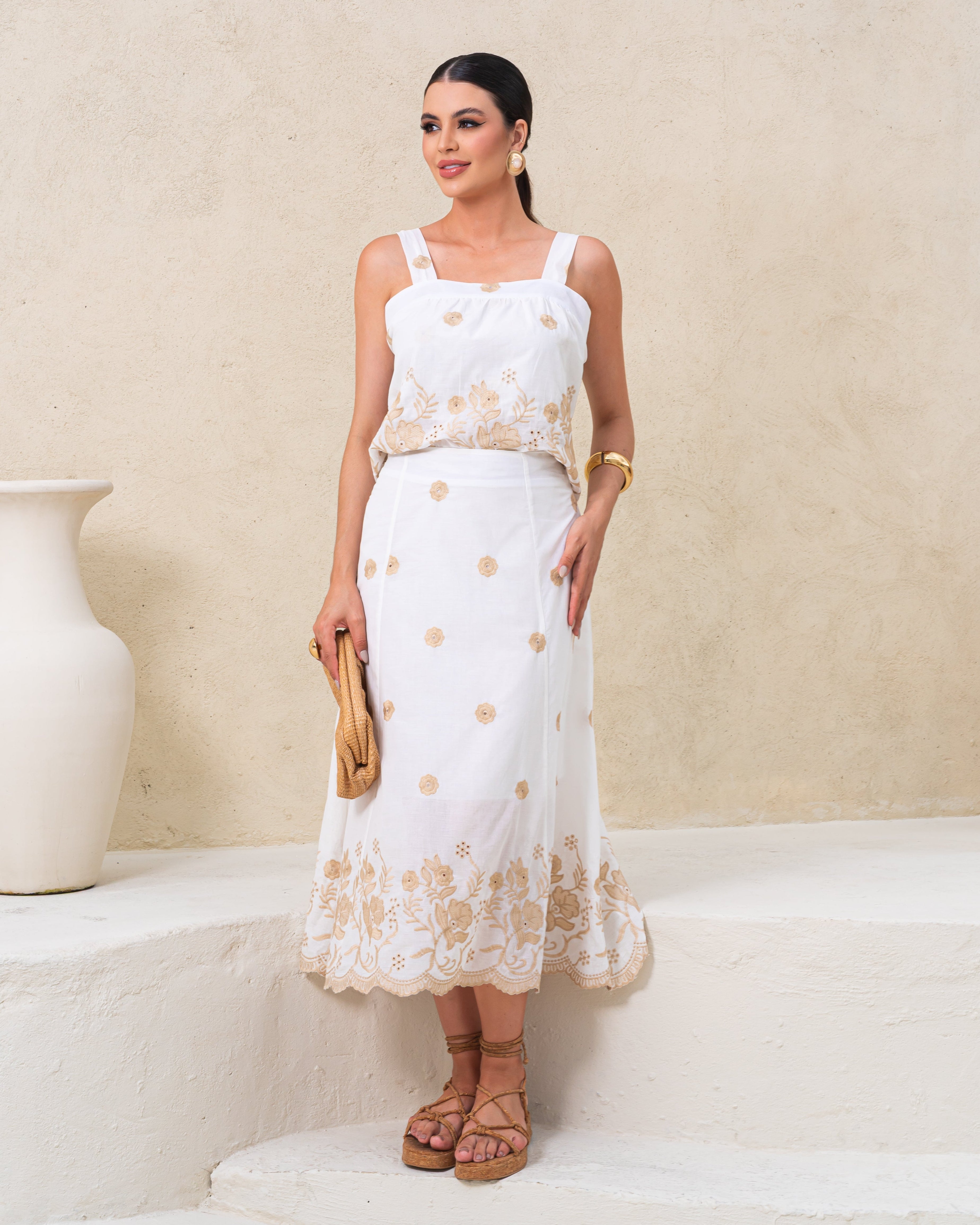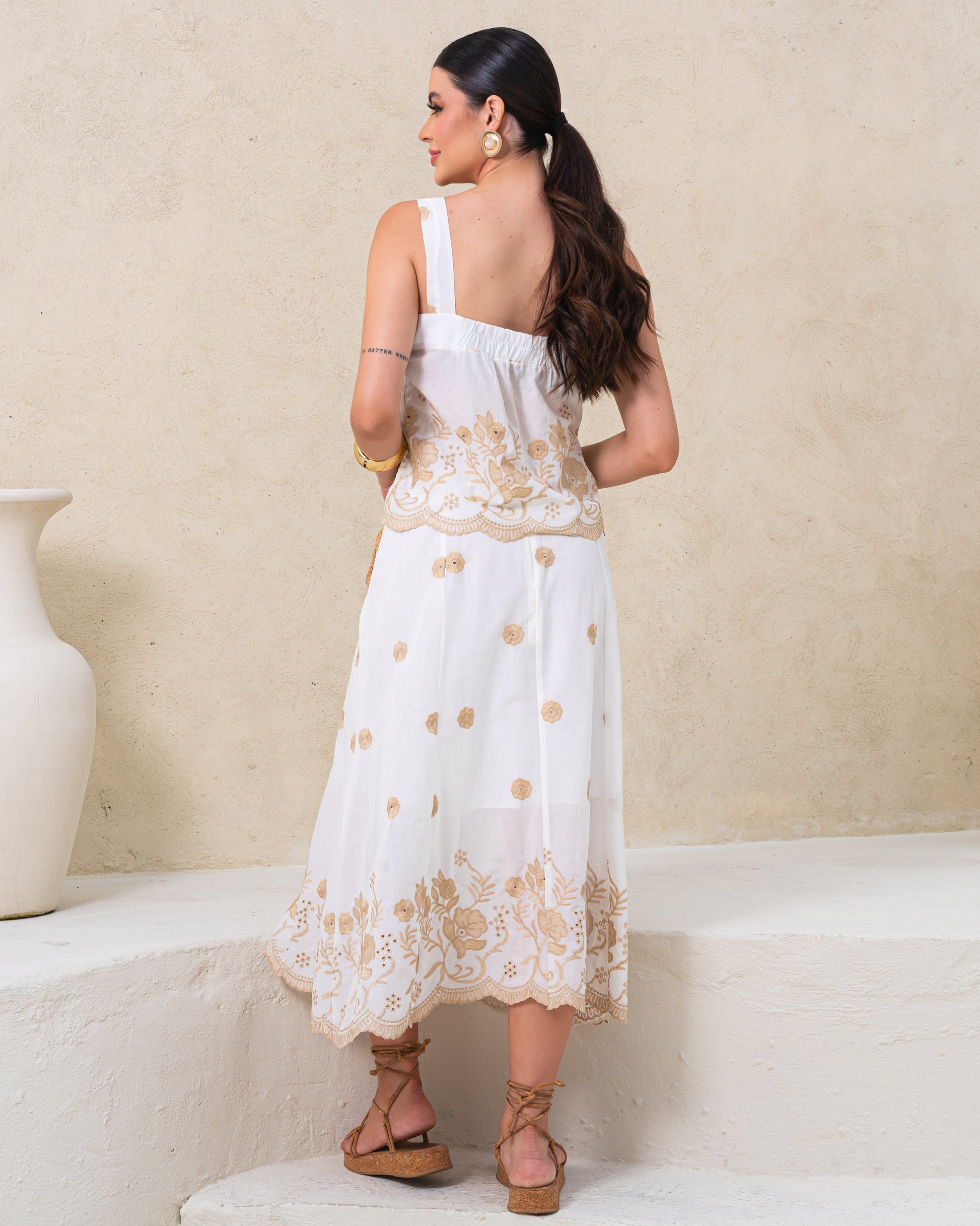 Conjunto Laise Barrado composto por regata com decote reto, alças largas com modelagem solta e saia midi com babado na barra, ziper lateral e forro. Aquela peça perfeita para o verão que está por vir !