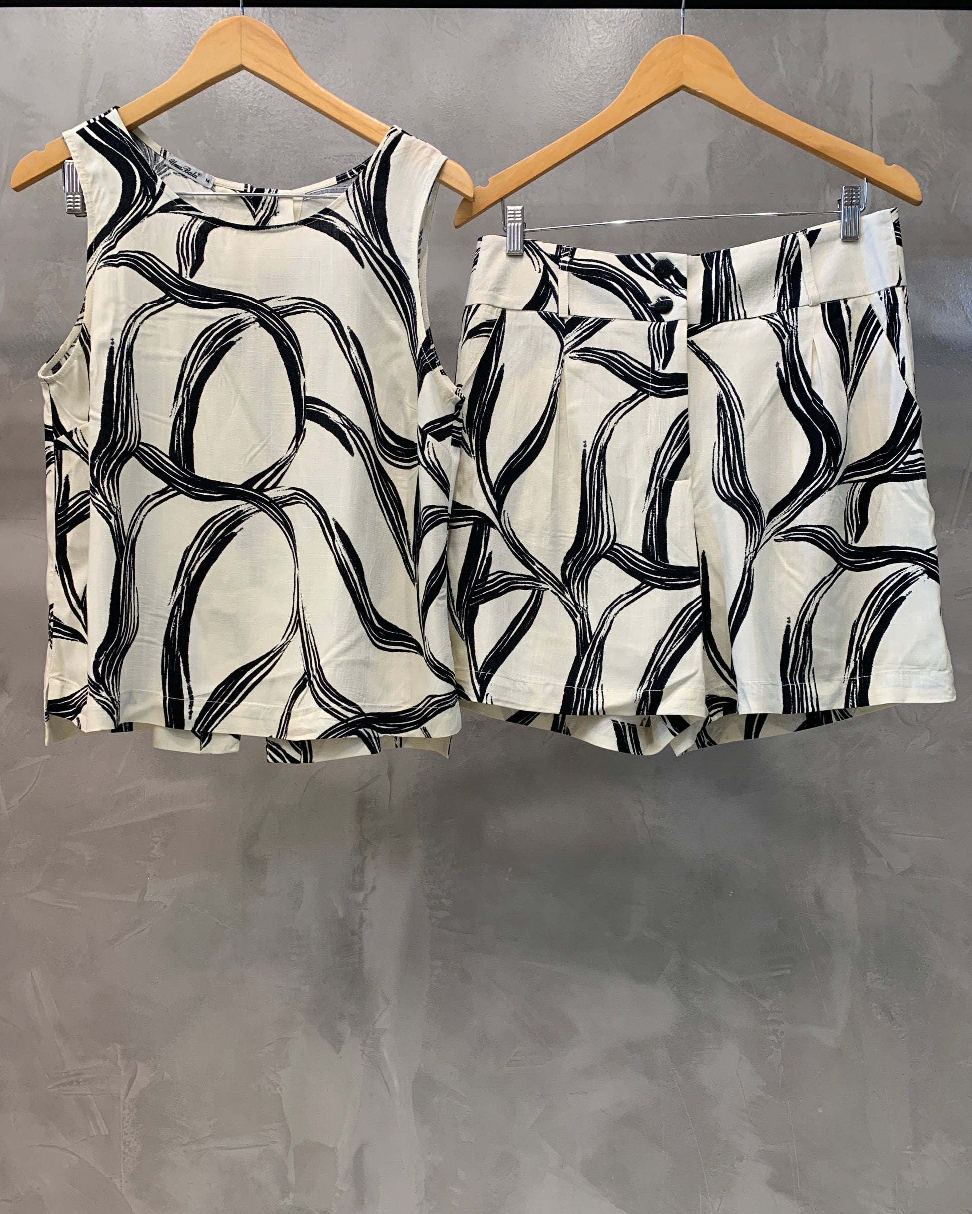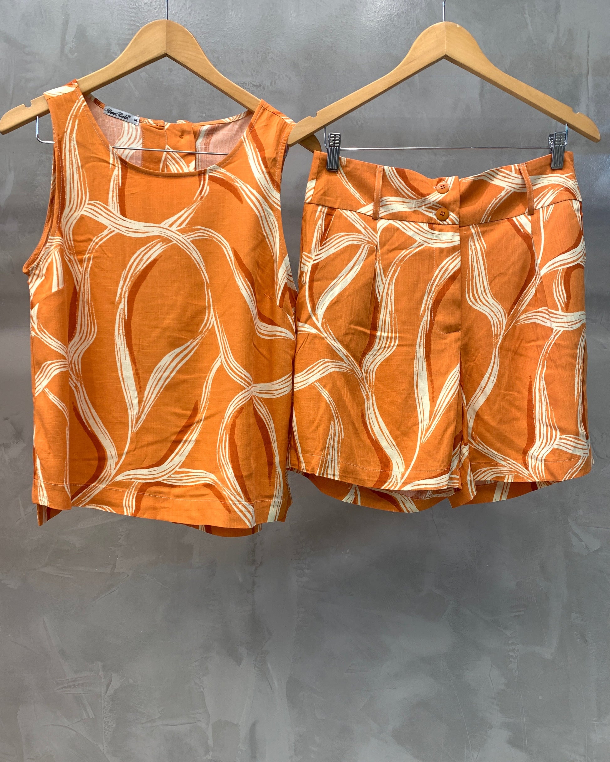 Conjunto estampado composto por regata solta com decote U, alças largas, detalhe de botões traseiros e shorts com comprimento médio e pregas frontais. São confeccionados em viscose dando um frescor nos dias quentes, contem forro no shorts.