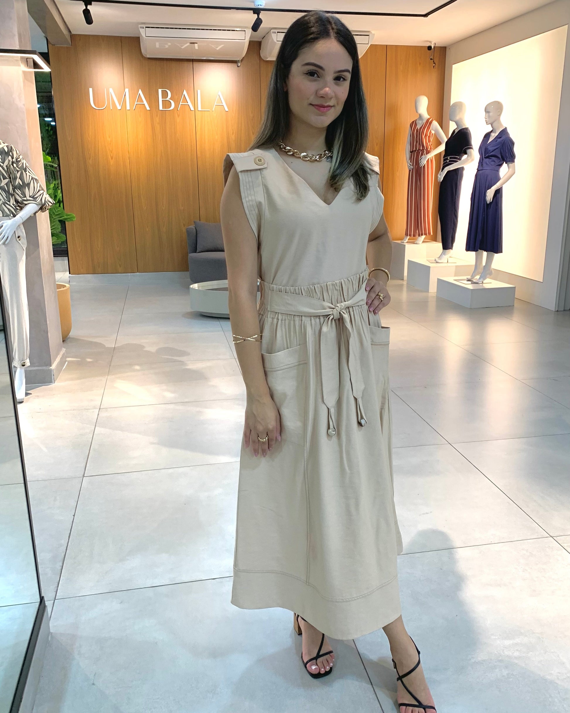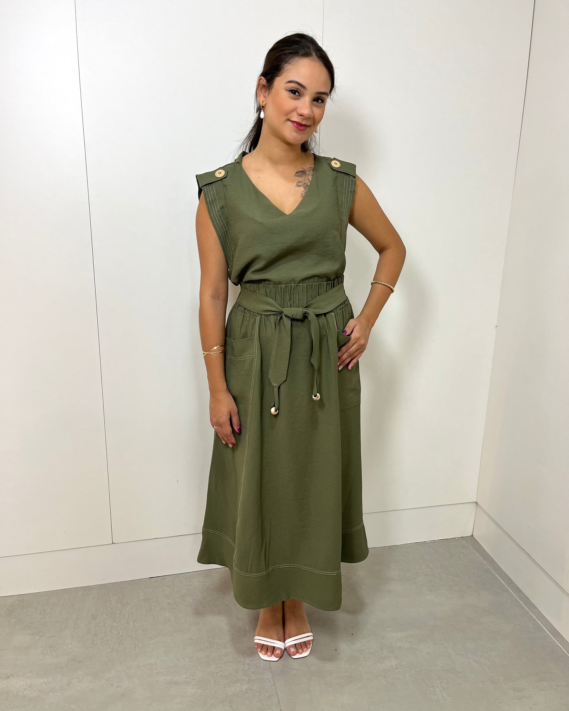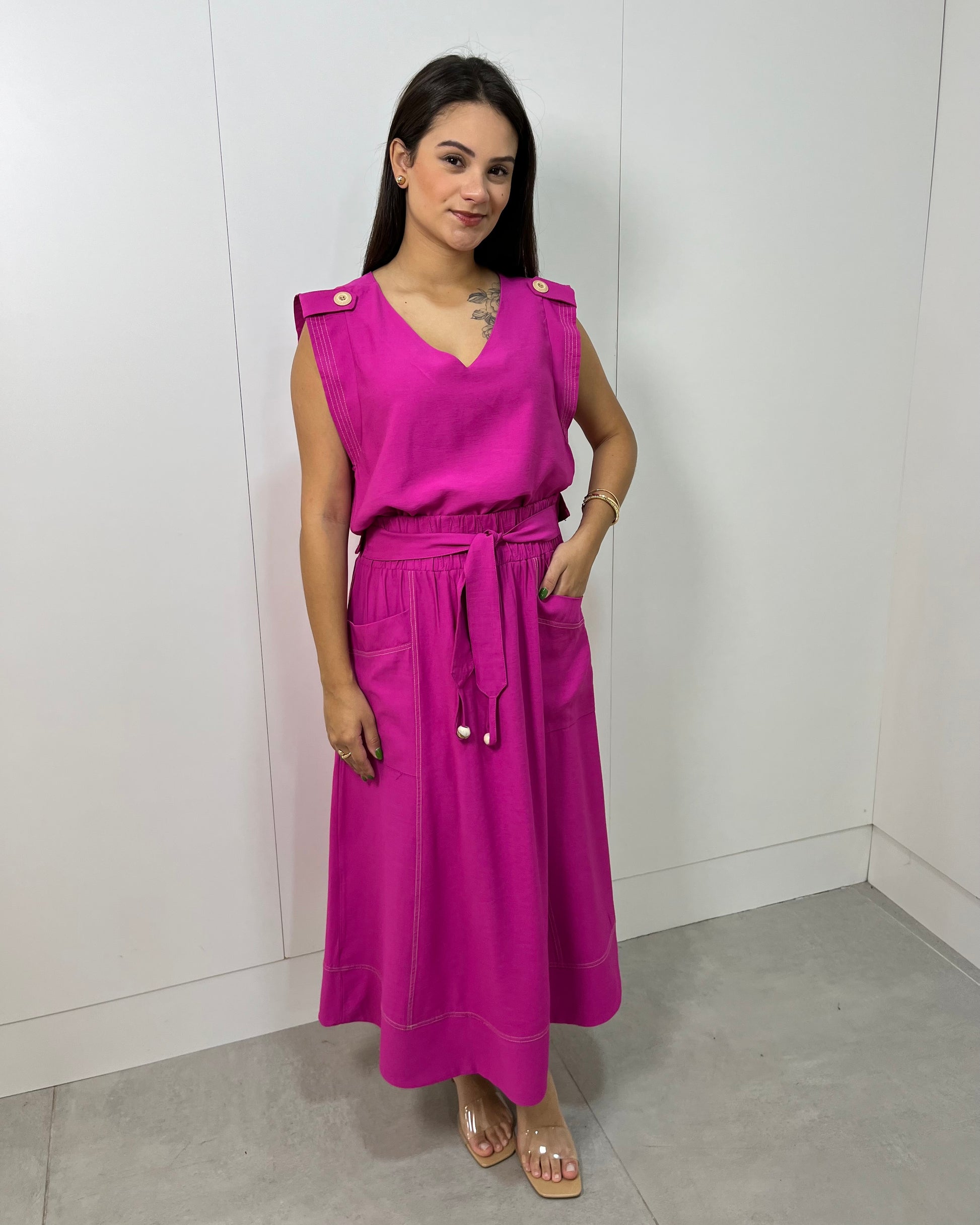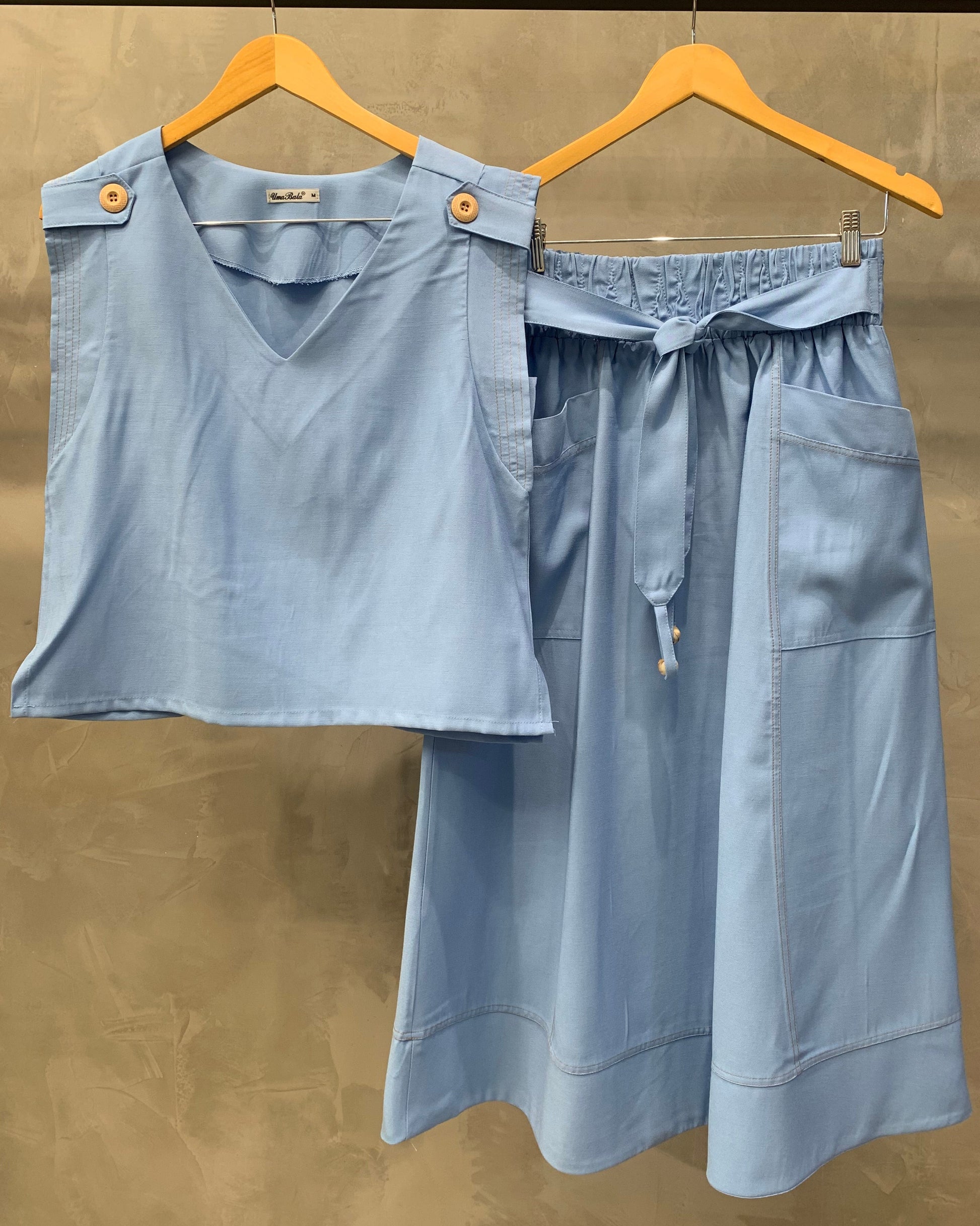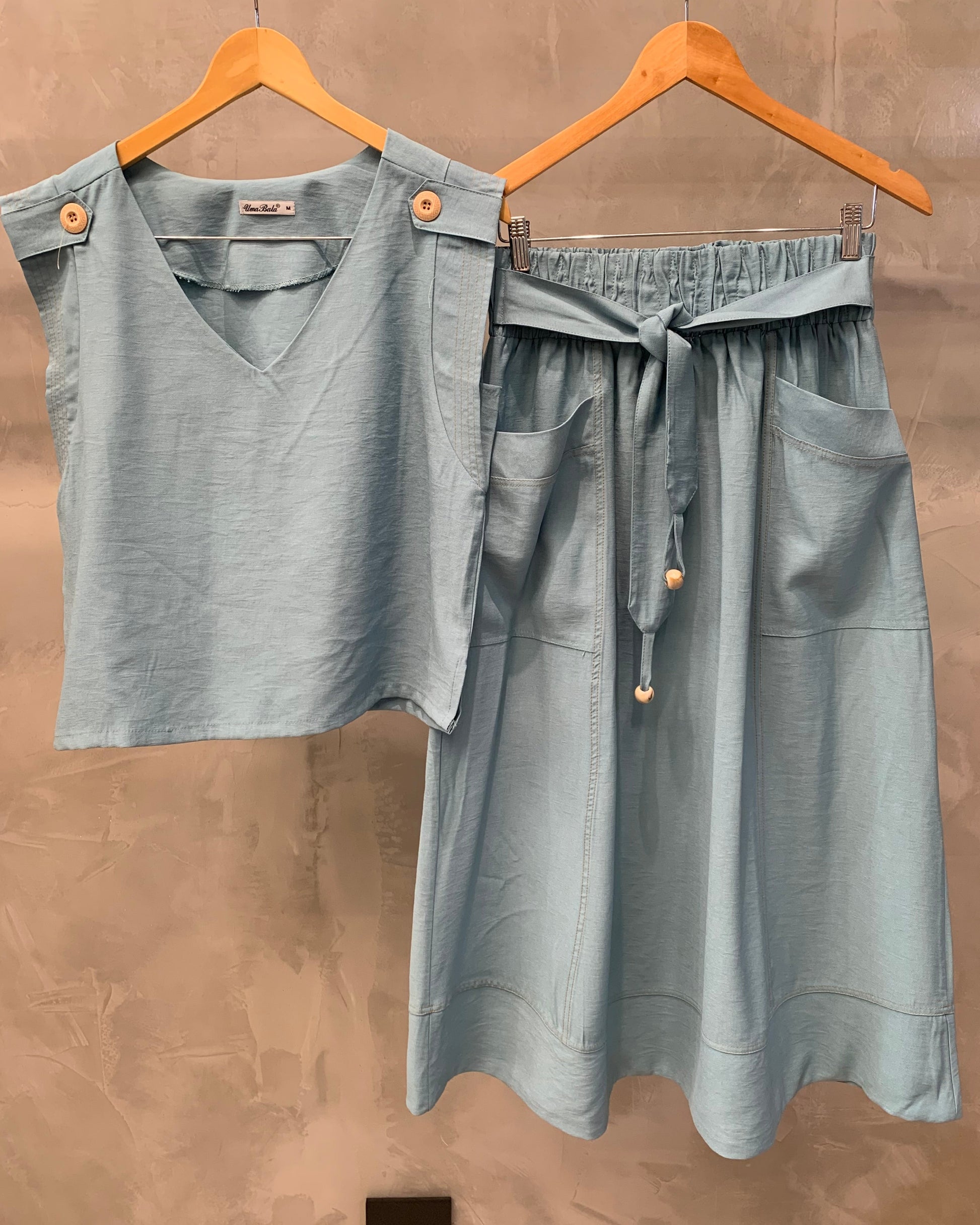 Conjunto de regata alça larga e saia midi, ambos tem detalhes de pespontos que dão todo charme para peça. Na saia tem um cinto de tecido fixo na peça, que é possível amarrar de diversas formas! É confeccionado no tecido Marante.