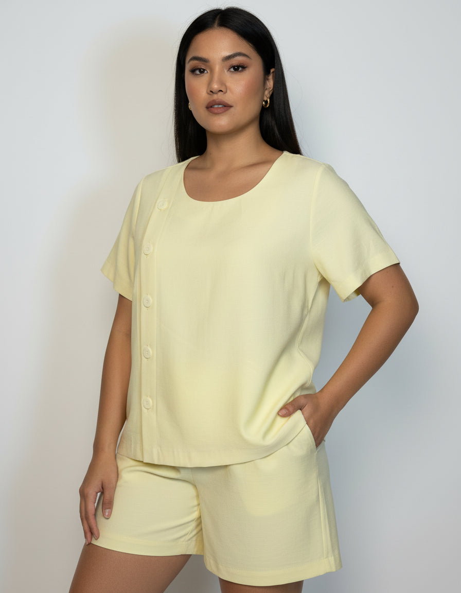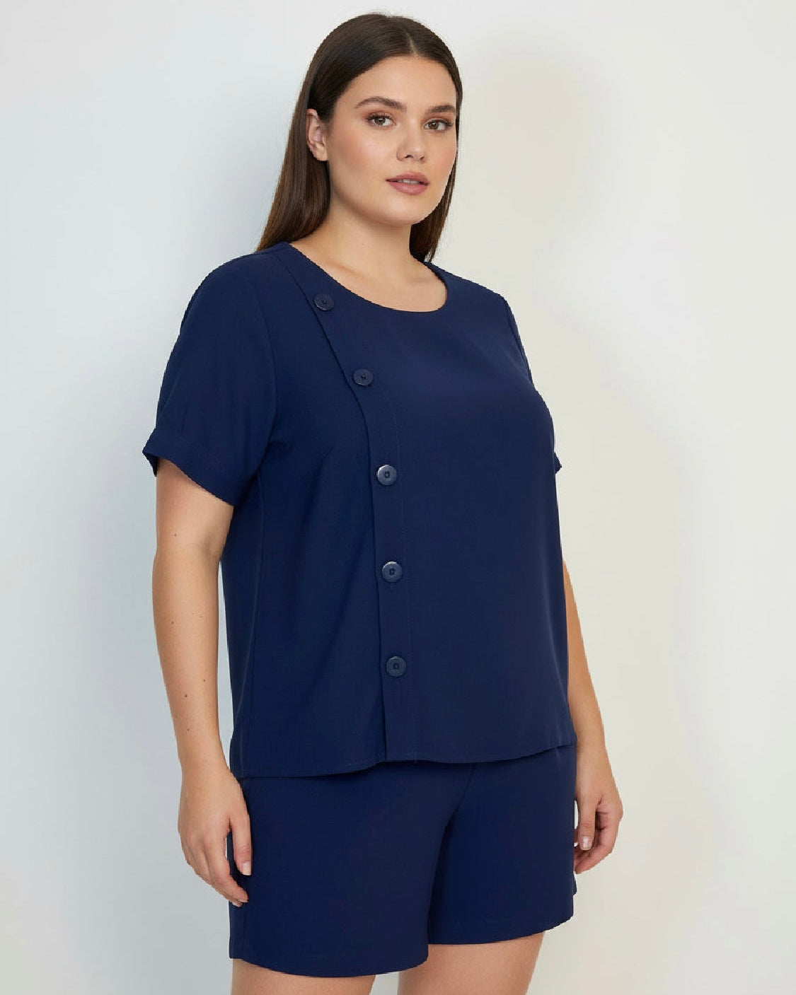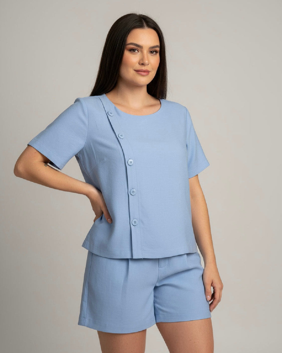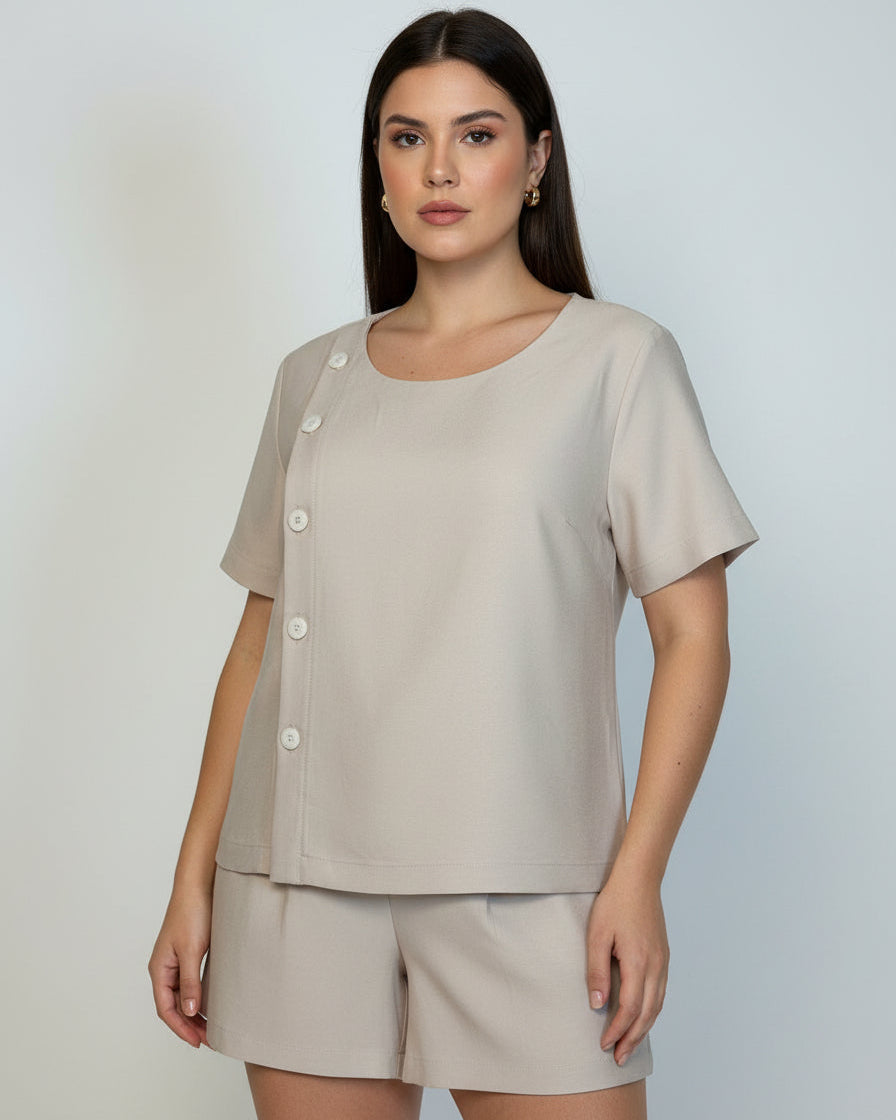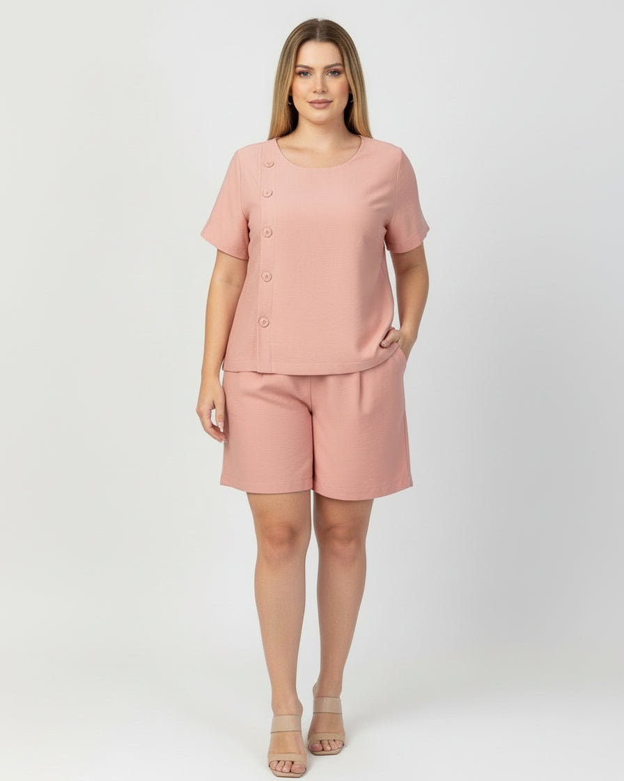 Conjunto Plus Liso de blusa manga curta reta com retalhes de botões que dão o diferencial na peça e o shorts reto curto com bolsos laterais !