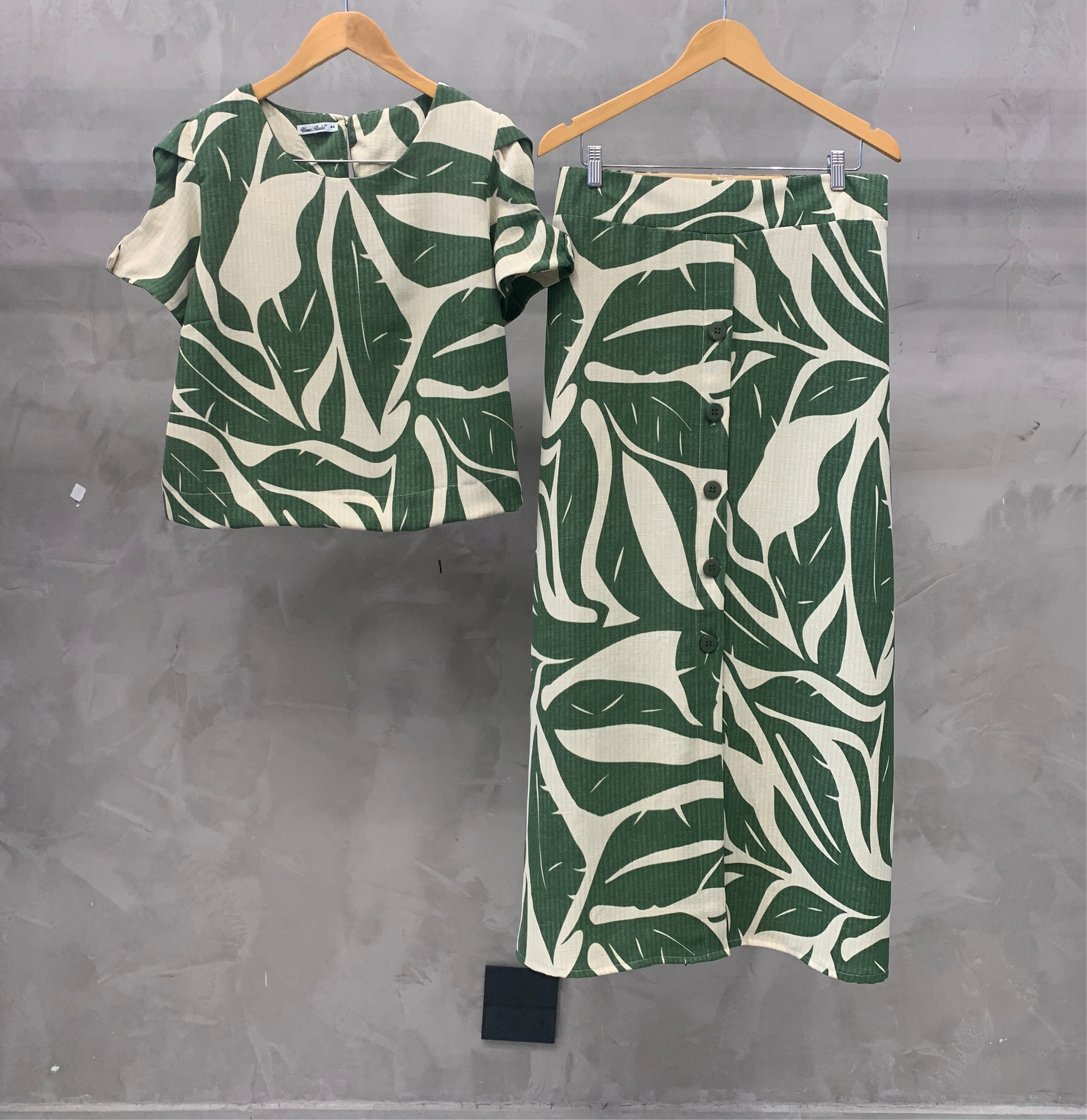 Conjunto Plus Estampado de blusa de manga curta cropped e saia midi, confeccionados no Viscose estampado. Tem detalhes de botões que dão aquele destaque no look! Possui forro na saia.