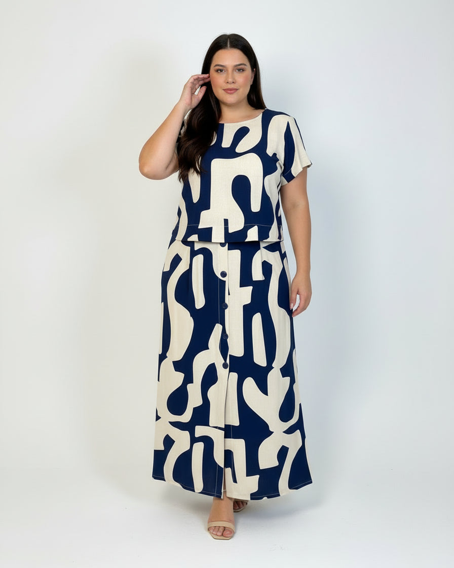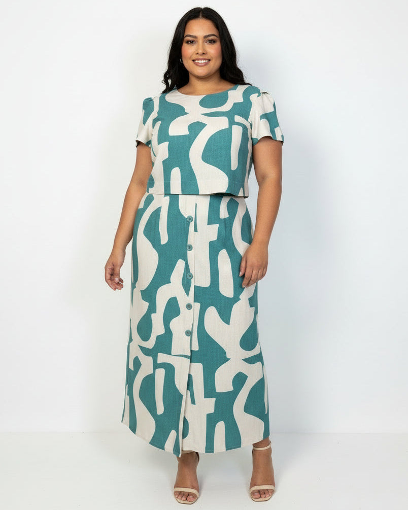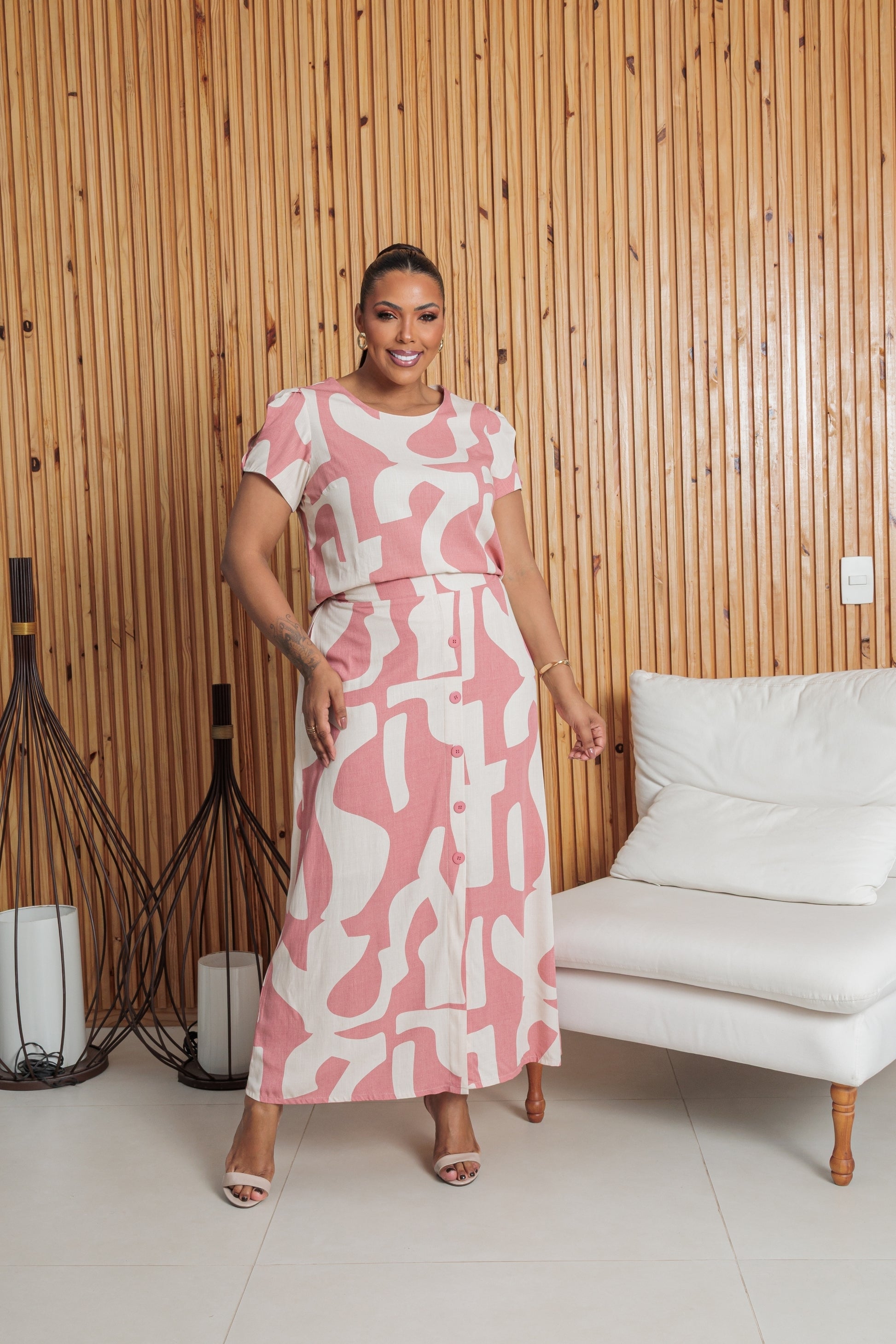 Conjunto Plus Estampado de blusa de manga curta cropped e saia midi, confeccionados no Viscose estampado. Tem detalhes de botões que dão aquele destaque no look! Possui forro na saia.