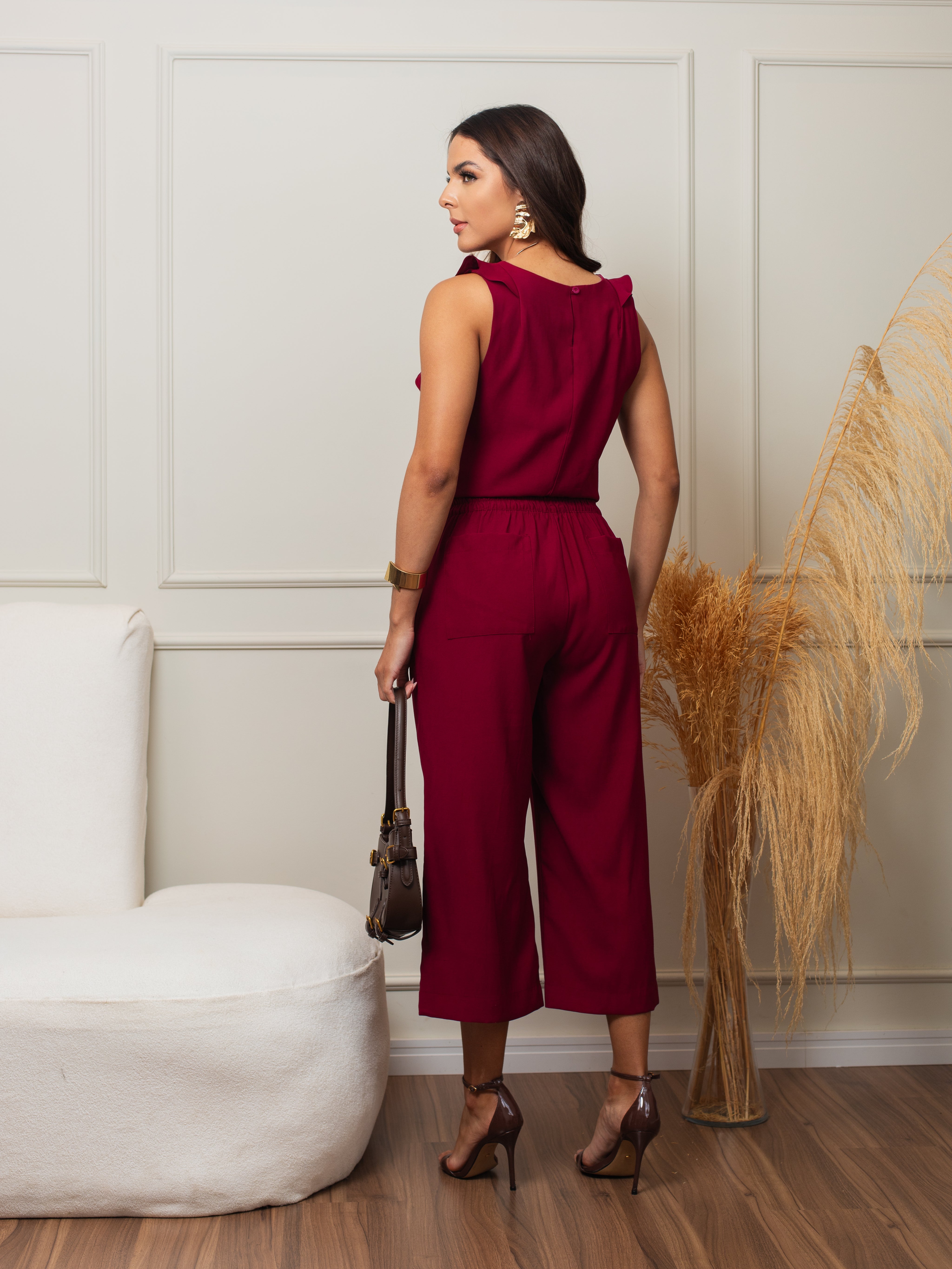 Conjunto de regata e calça, regata com modelagem reta, alça larga e detalhes babados no busto. A calça tem modelagem pantacourt com pregas frontais, bolsos laterais e elástico na cintura dando maior conforto durante o uso. É aquele conjunto estiloso e confortável que você estava procurando!