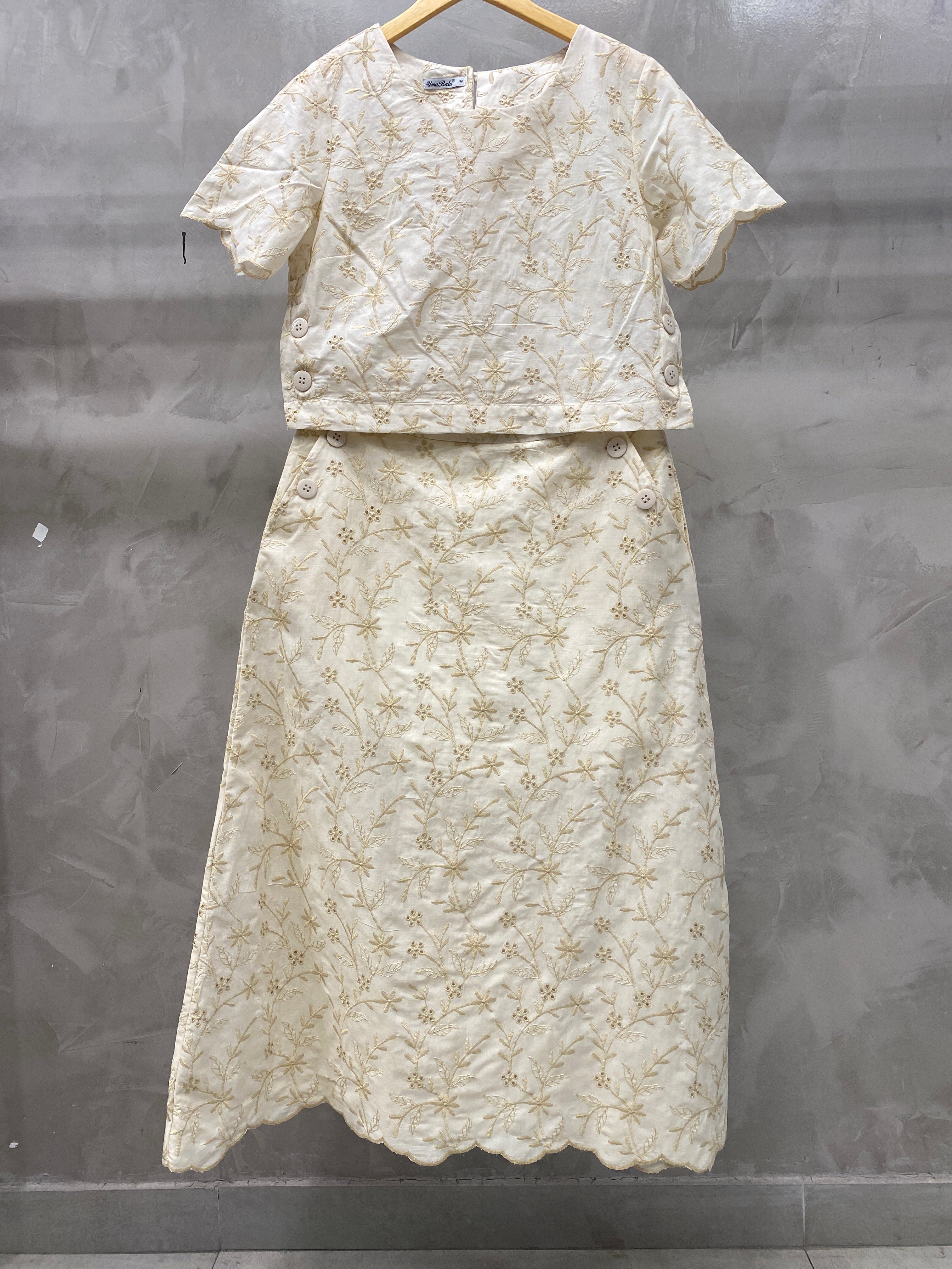 Conjunto Laise de blusa de manga curta cropped e saia midi, confeccionados no laise bordado. Tem detalhes de botões que dão aquele destaque no look! Possui forro na saia.