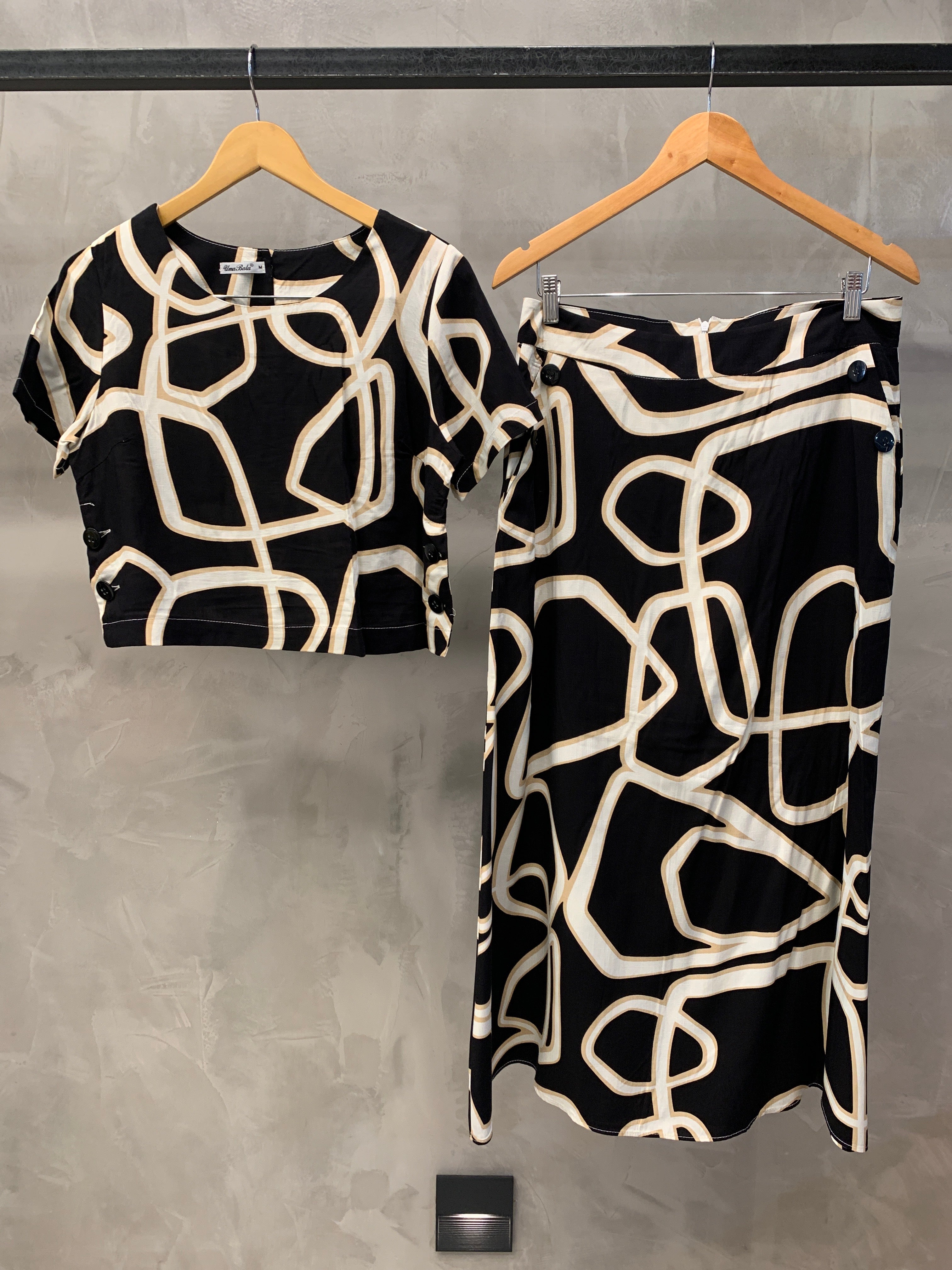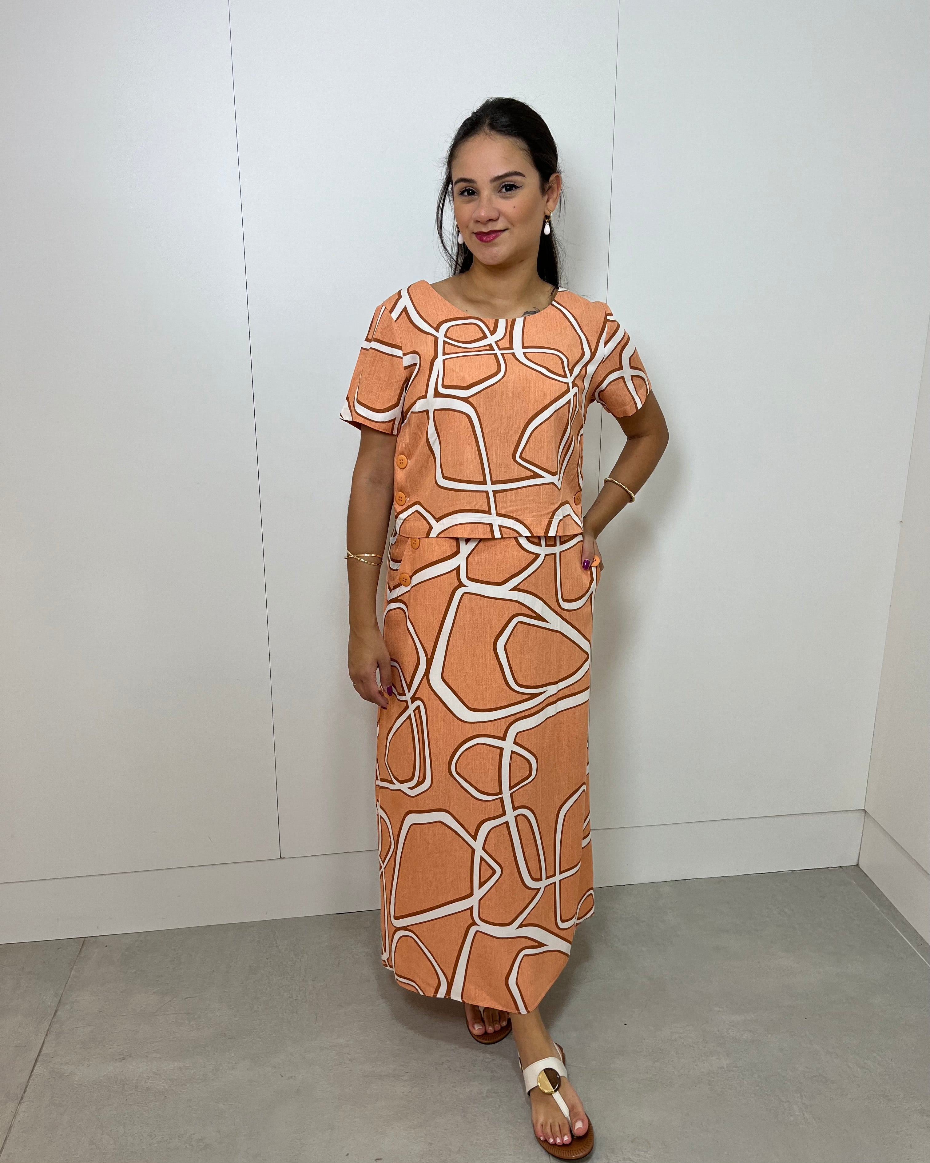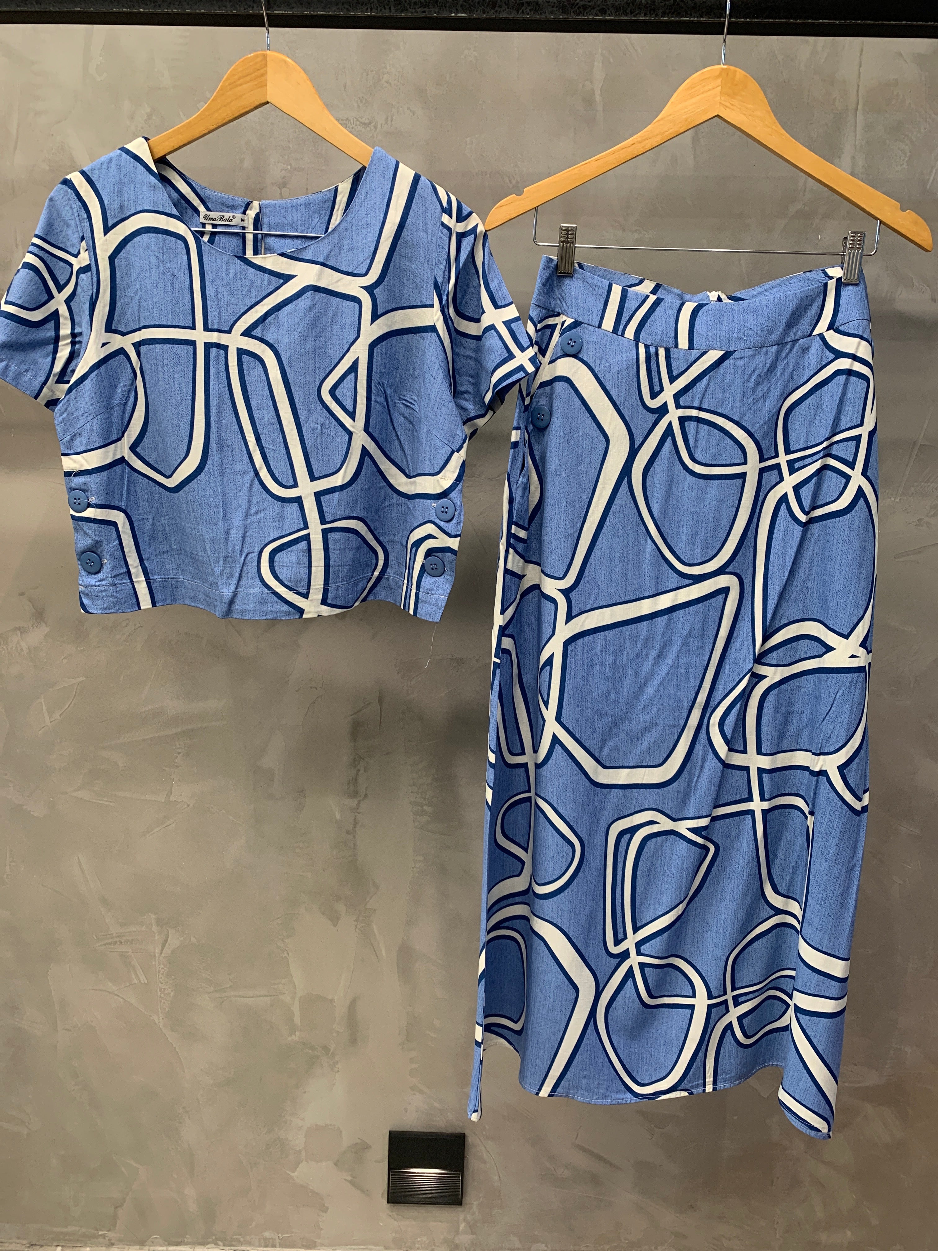 Conjunto de blusa de manga curta cropped e saia mídi, confeccionados no Viscose estampado. Tem detalhes de botões que dão aquele destaque no look! Possui forro na saia.