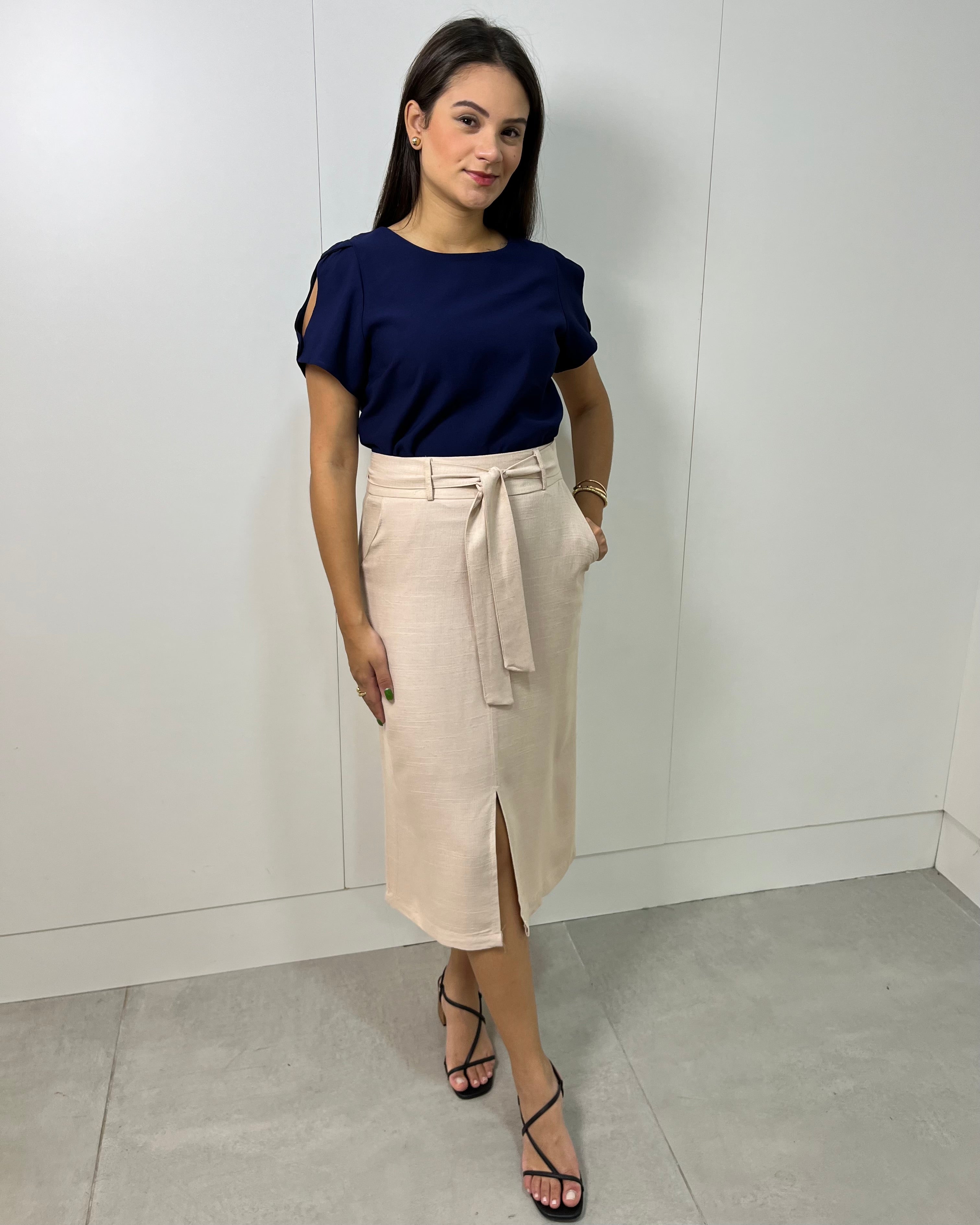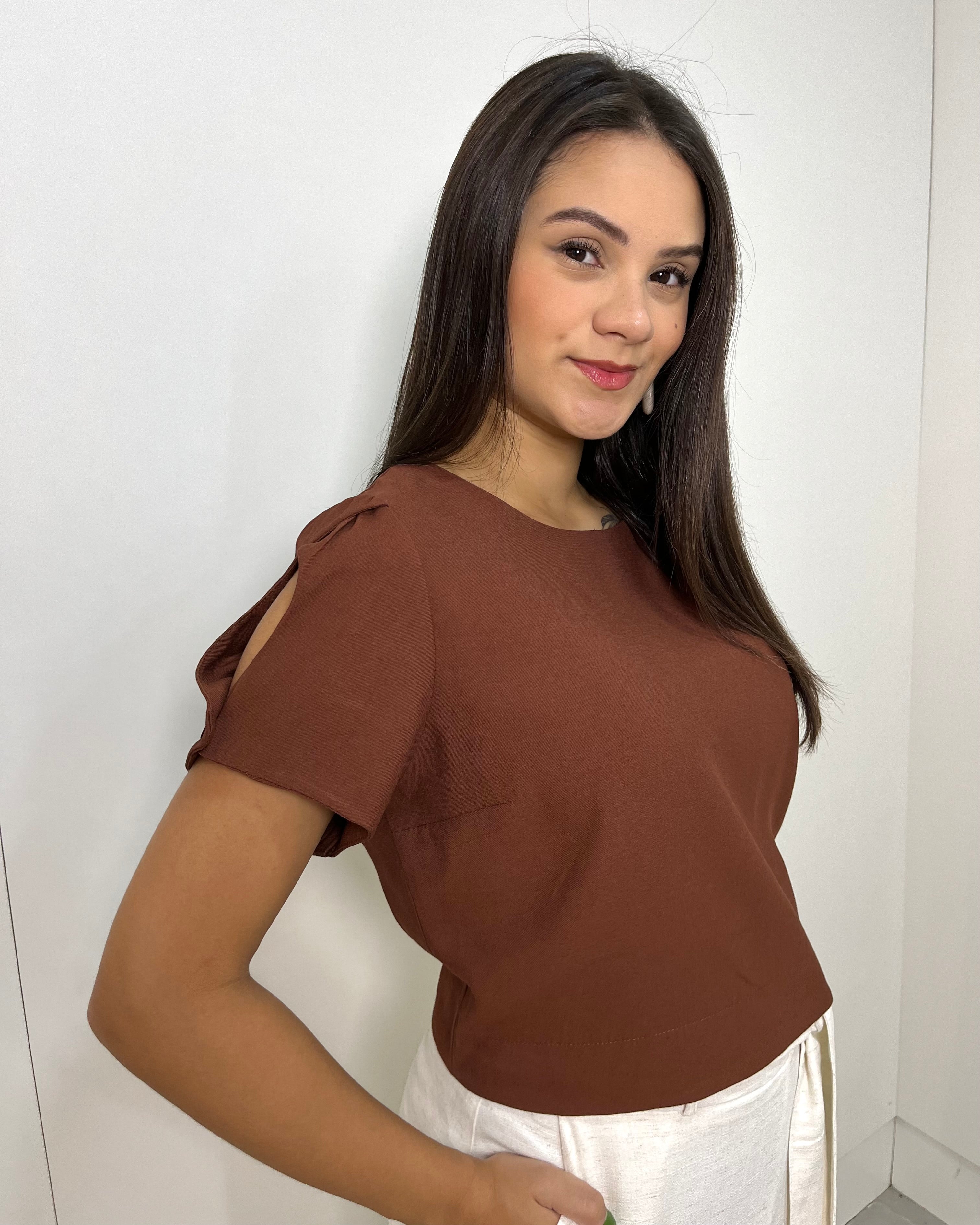 Blusa manga curta lisa com detalhe de abertura na manga que dá um toque sofisticado à peça. Tem um botão de fechamento da mesma cor do tecido. É confeccionada no Viscolinho.
