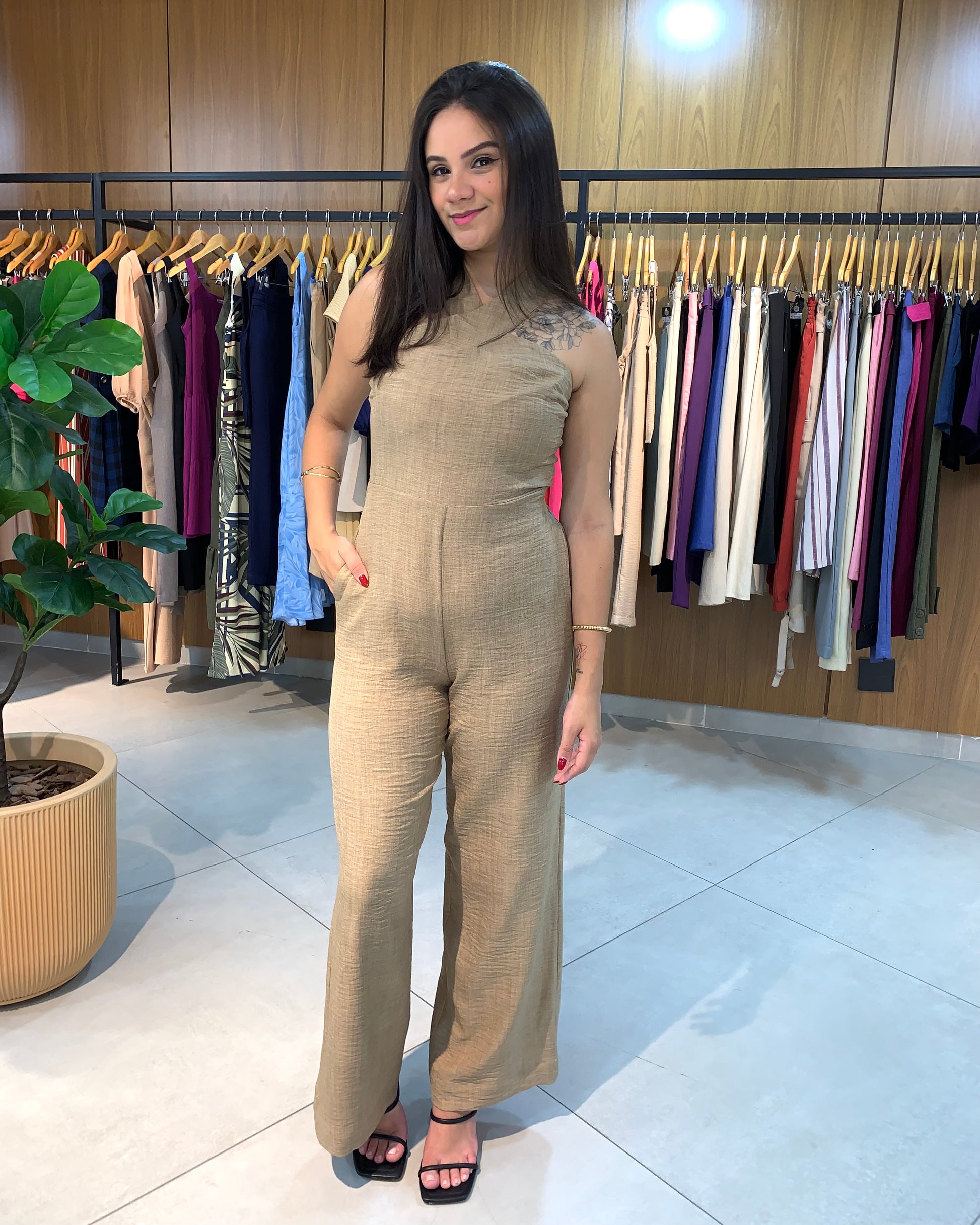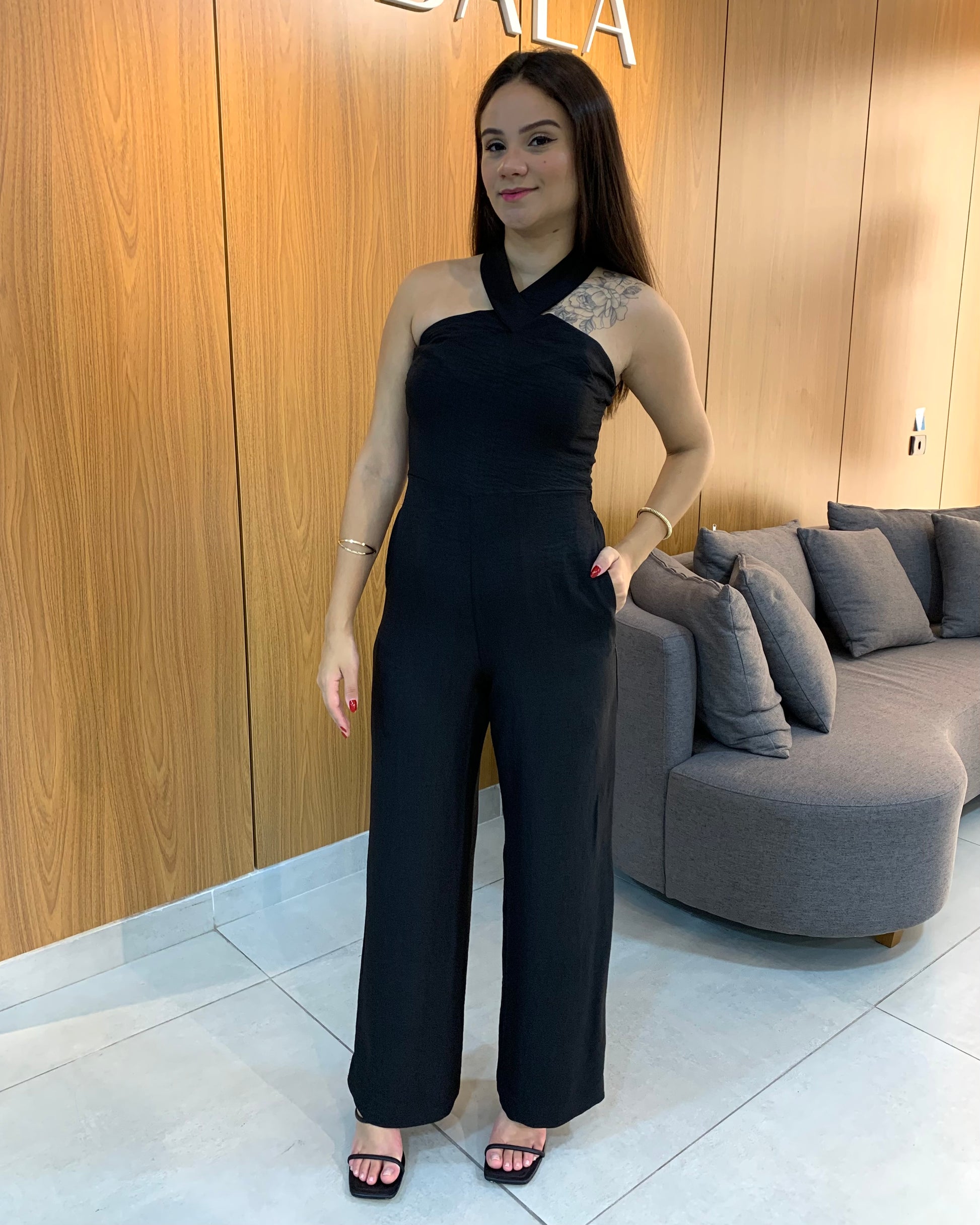 Macacão com decote em X finalizado no pescoço, zíper traseiro, bolsos laterais e elástico na cintura. Com uma única peça você fica chique e dentro das tendências! Confeccionado no tecido Poly Melange.