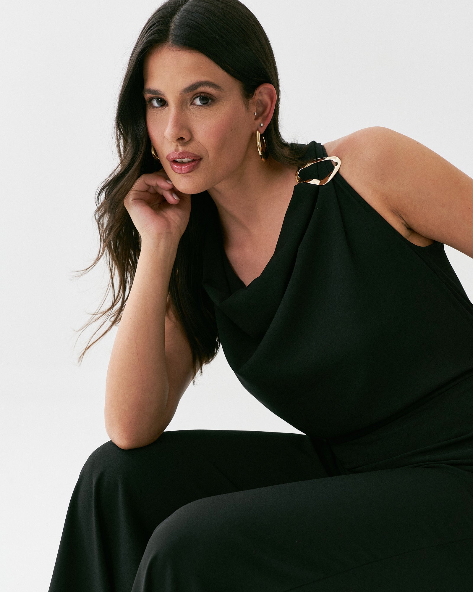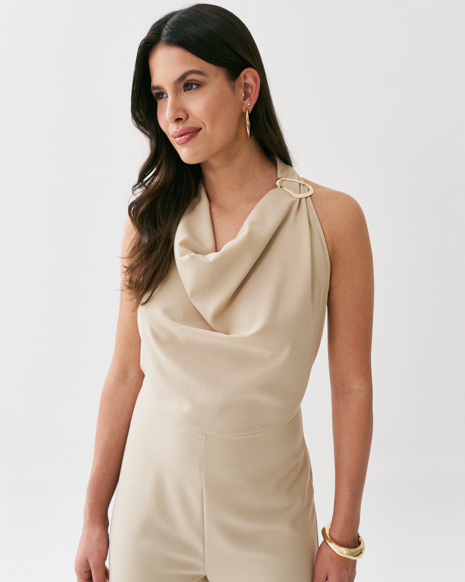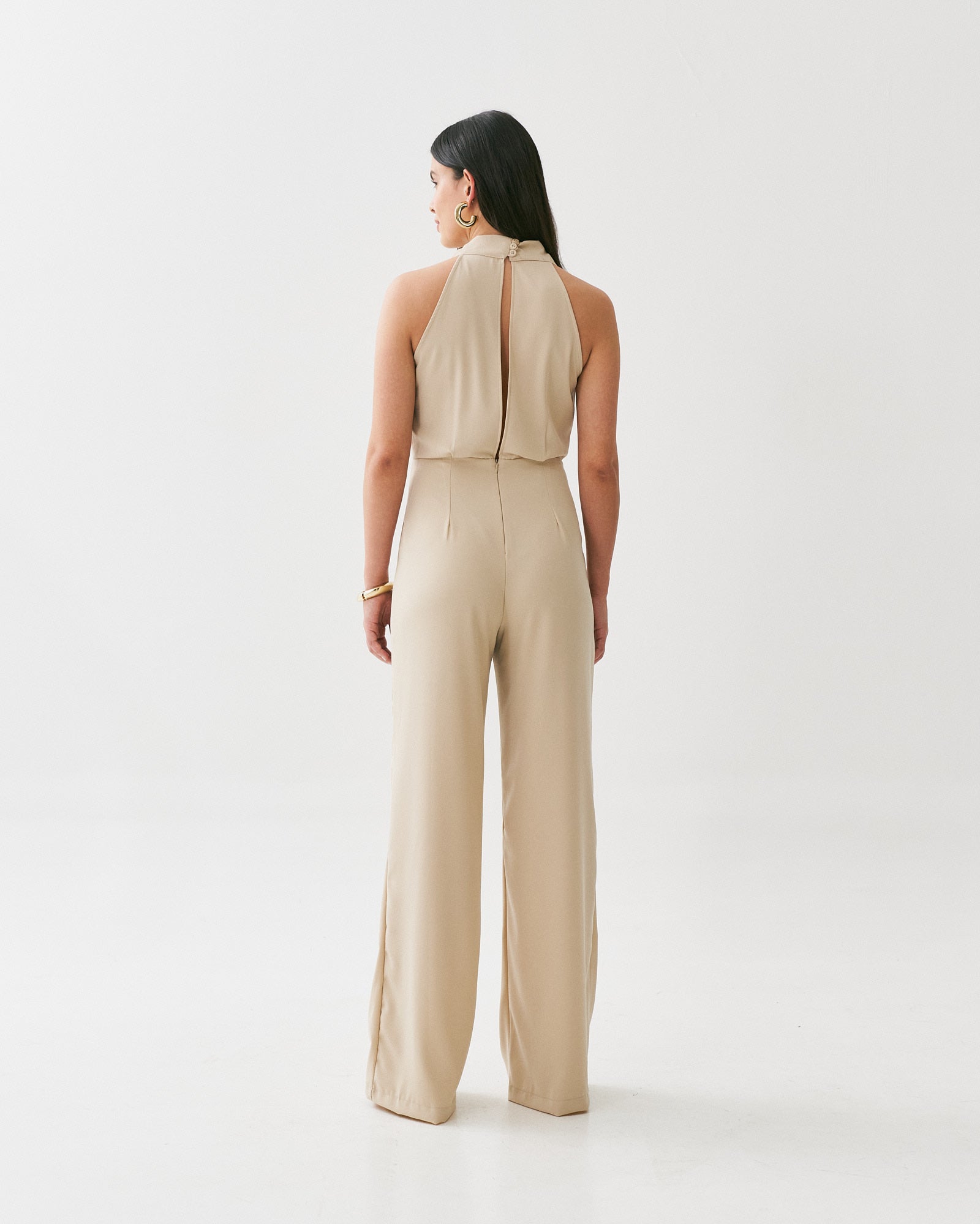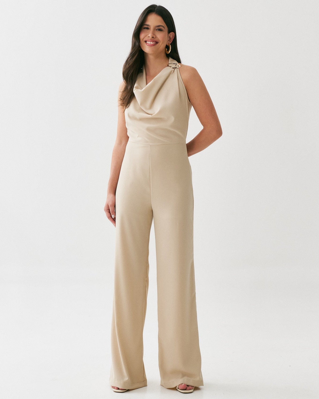 Macacão Decote Gola Boba, modelagem pantacourt e detalhe de ferragem no busto. É uma peça que brilha por si só, confeccionado num tecido mais encorpado deixando a peça ainda mais especial. Possui forro.