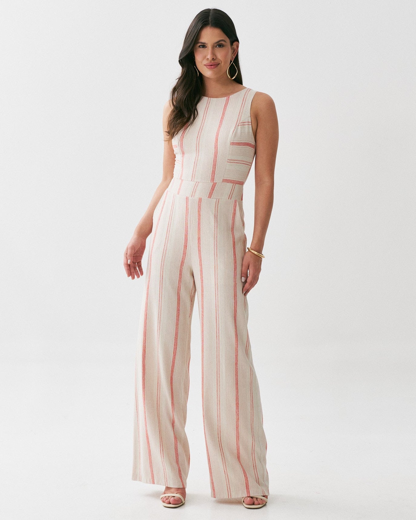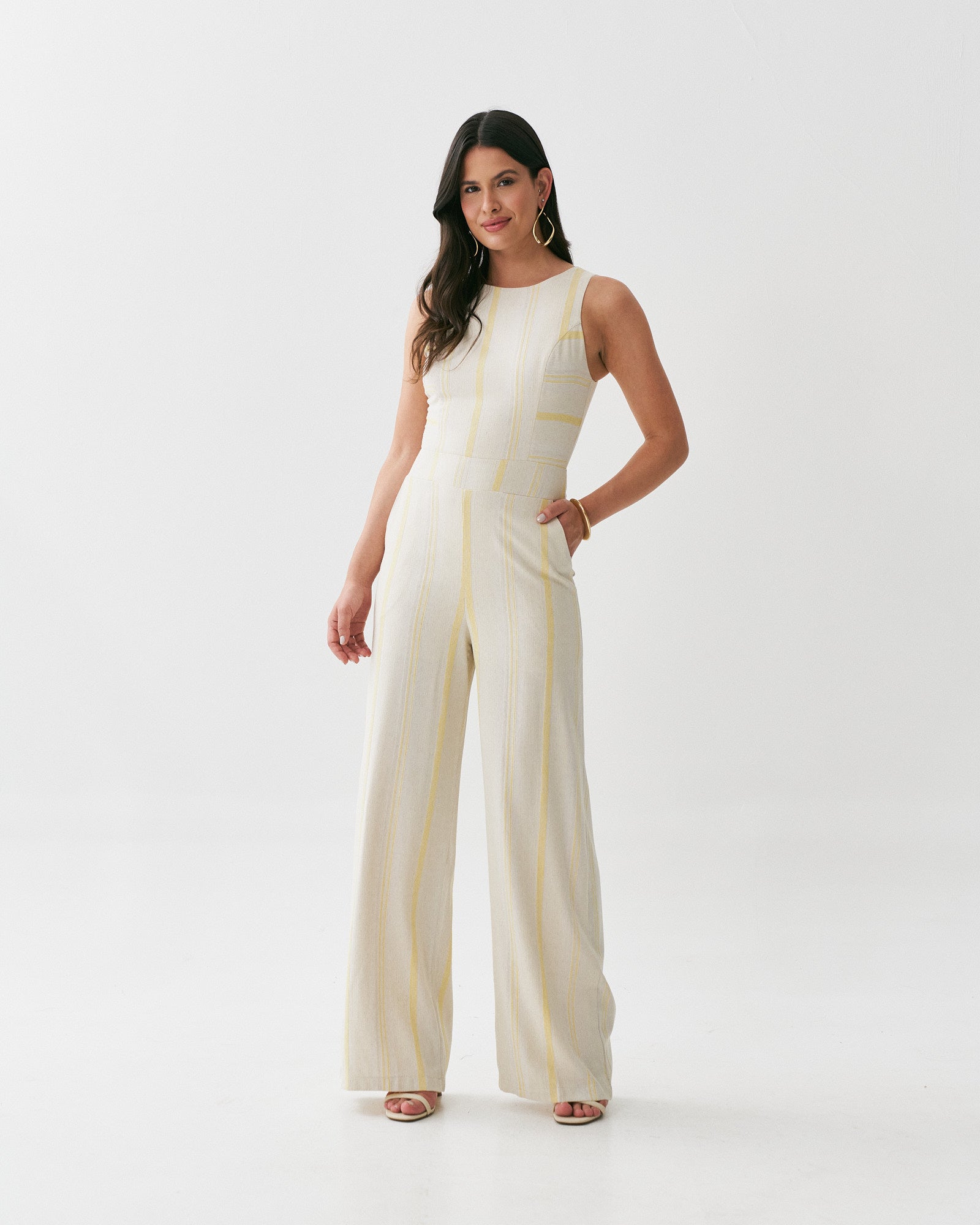 Macacão Pantalona Listrado no Linho com modelagem justa alça larga , bolsos laterais e zíper traseiro. Possui forro.