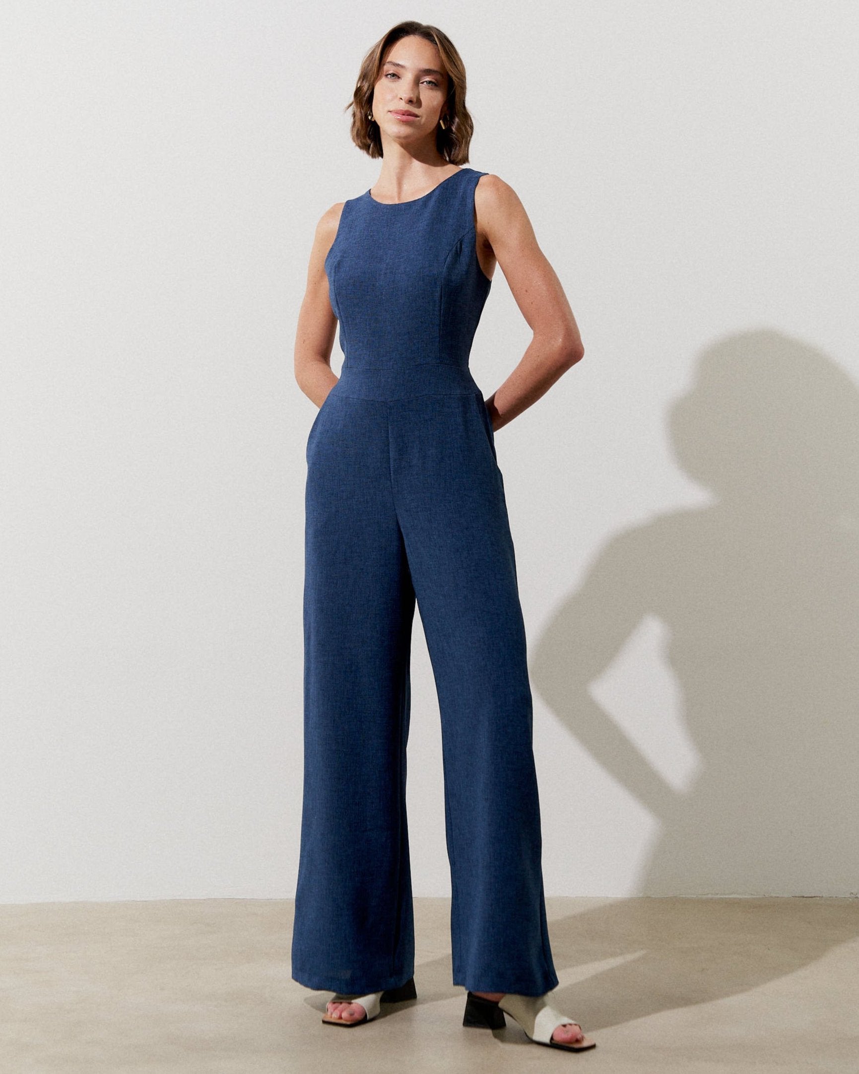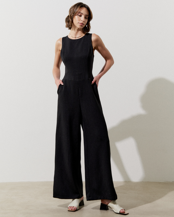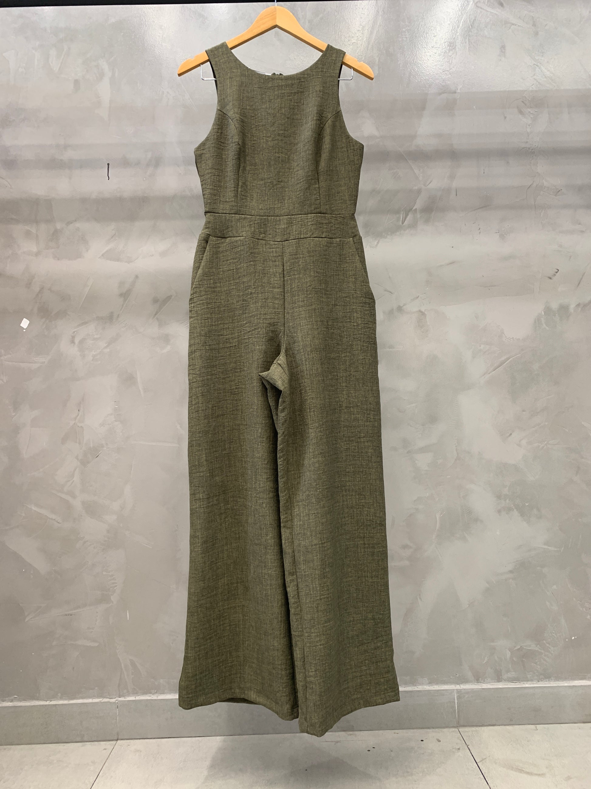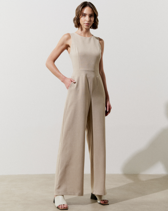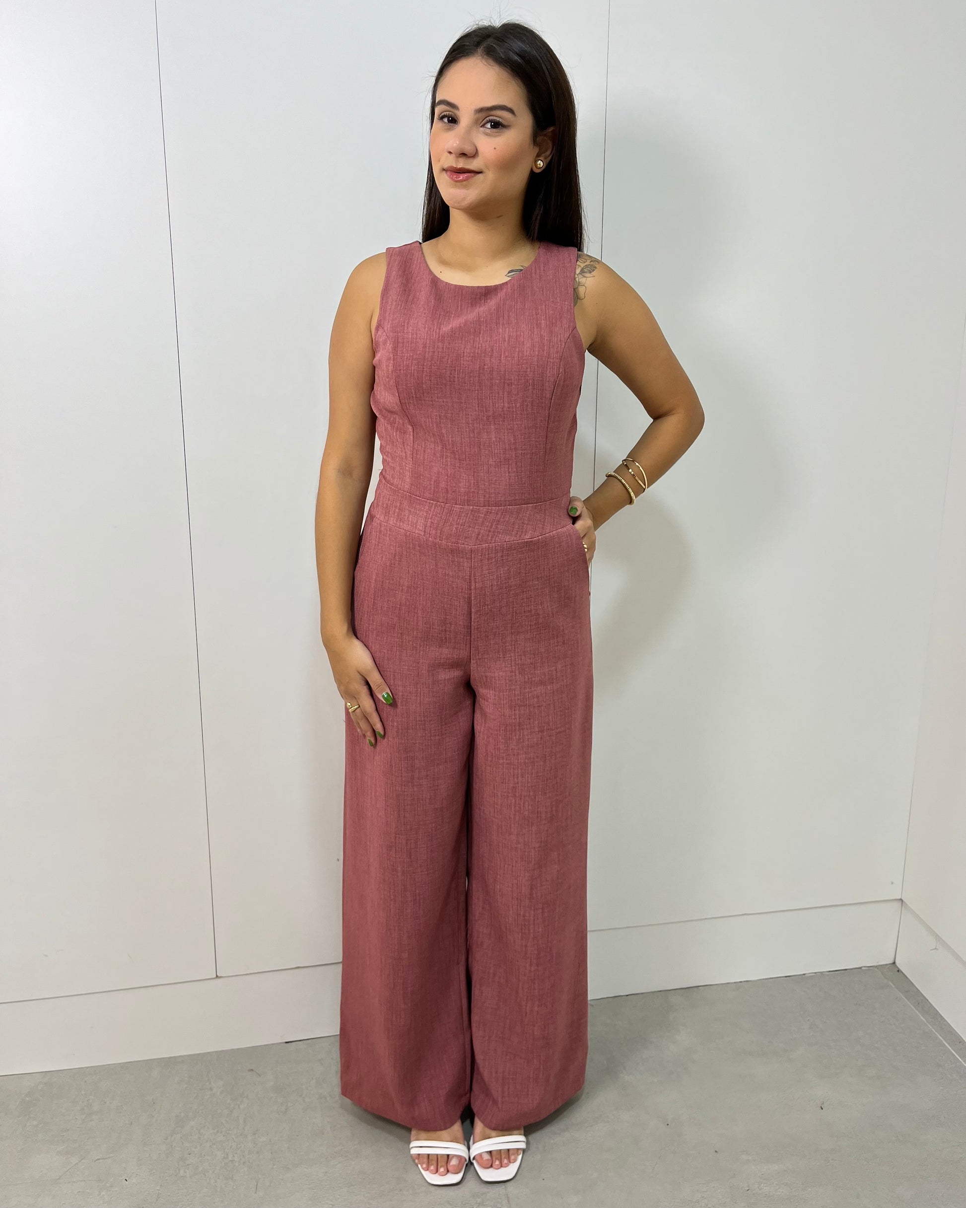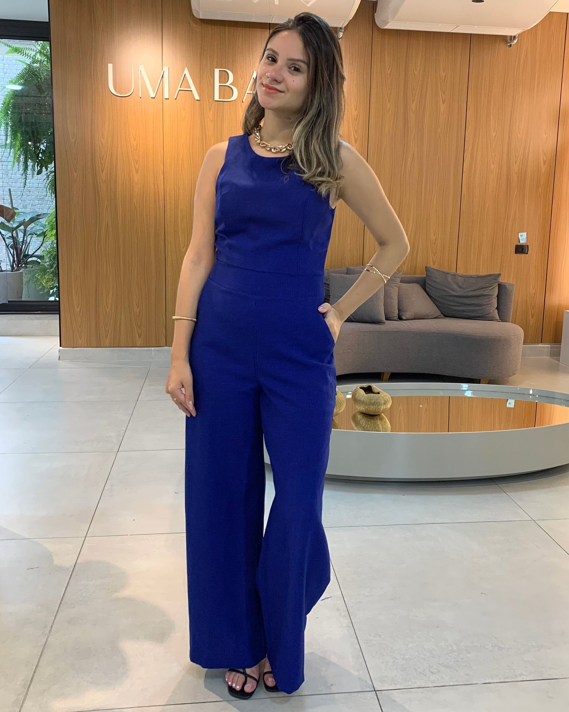 Macacão Pantalona com modelagem justa alça larga e bolsos laterais.