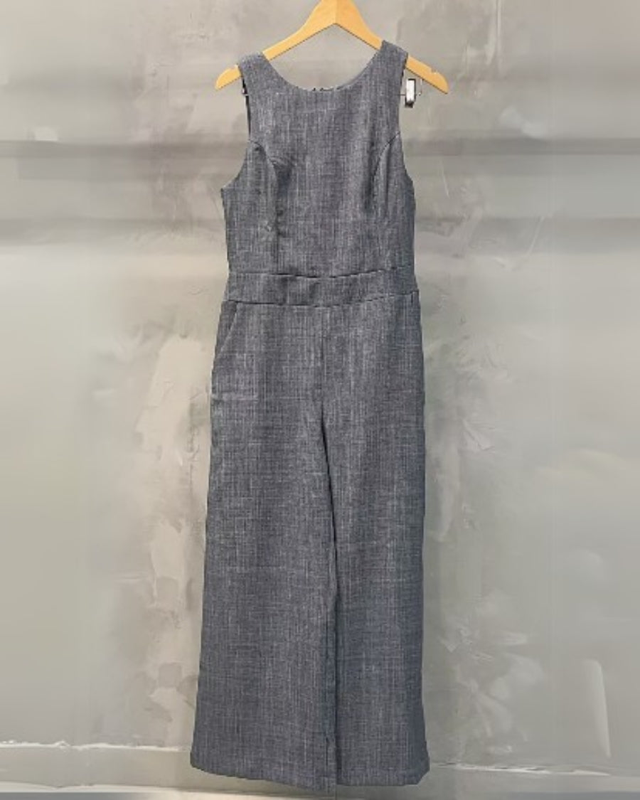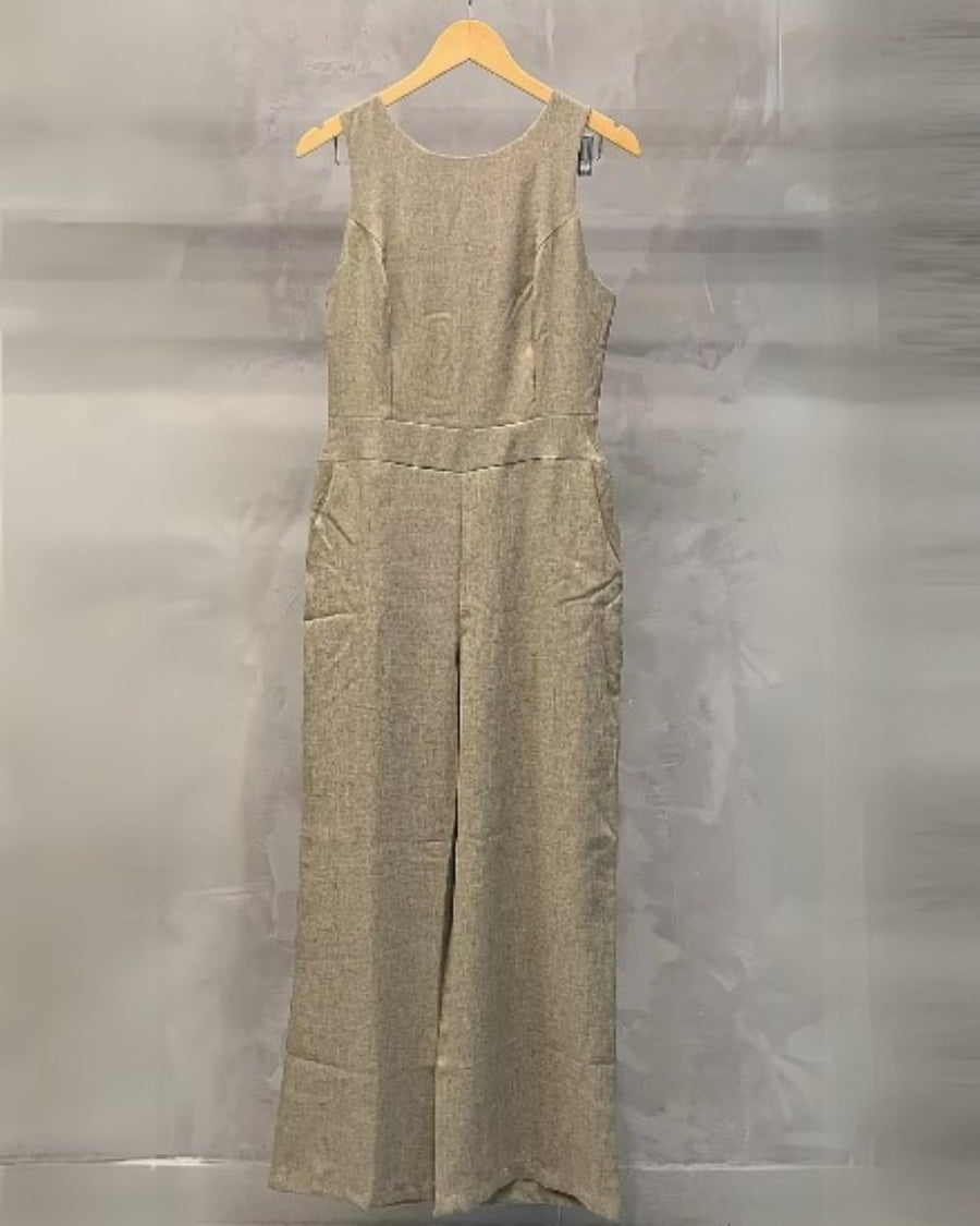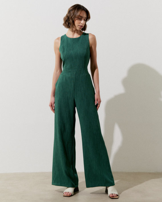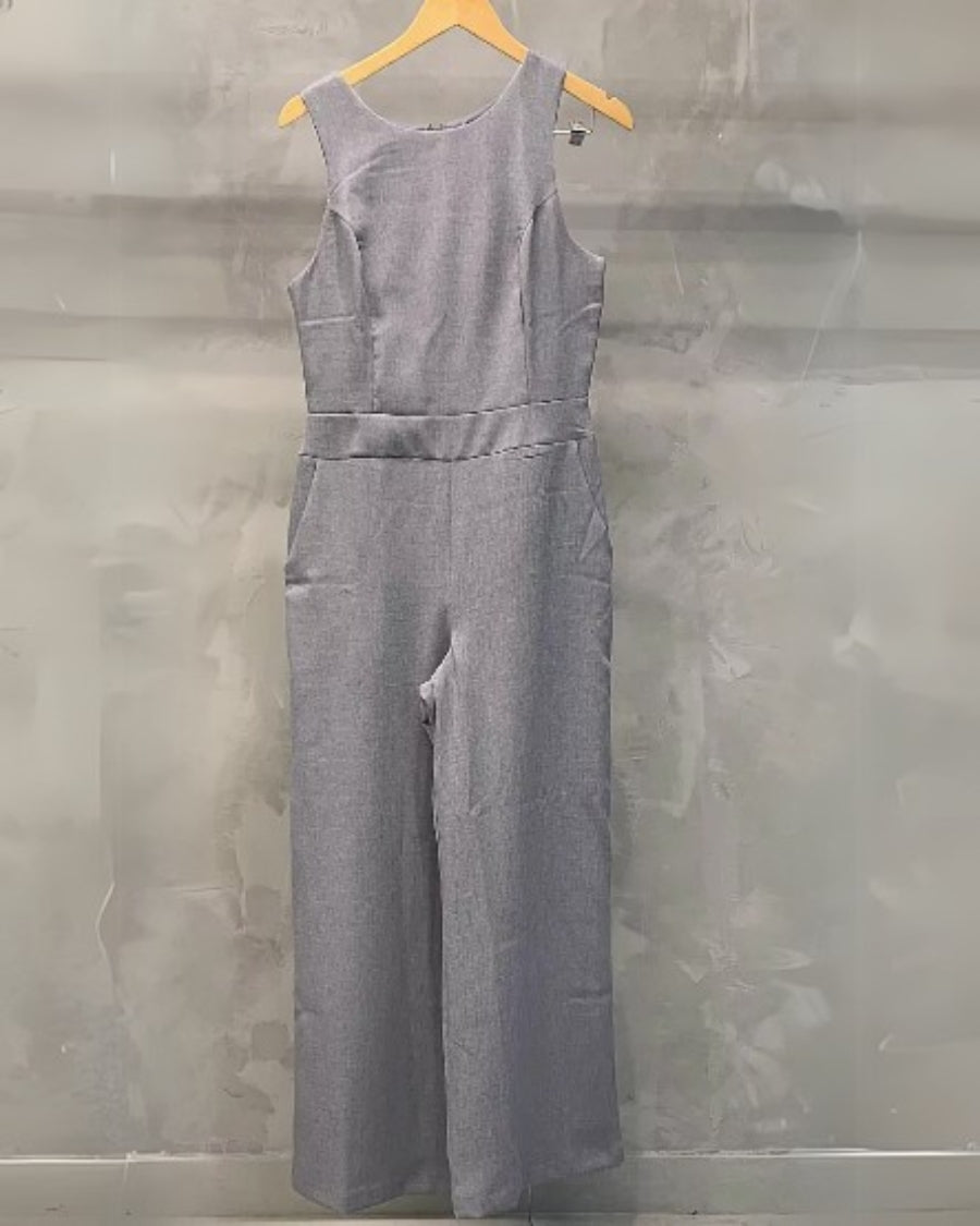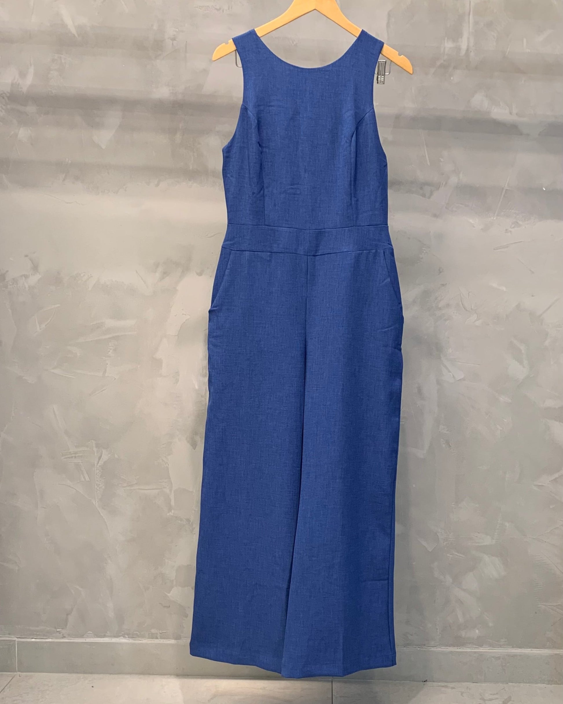 Macacão Pantalona com modelagem justa alça larga e bolsos laterais.