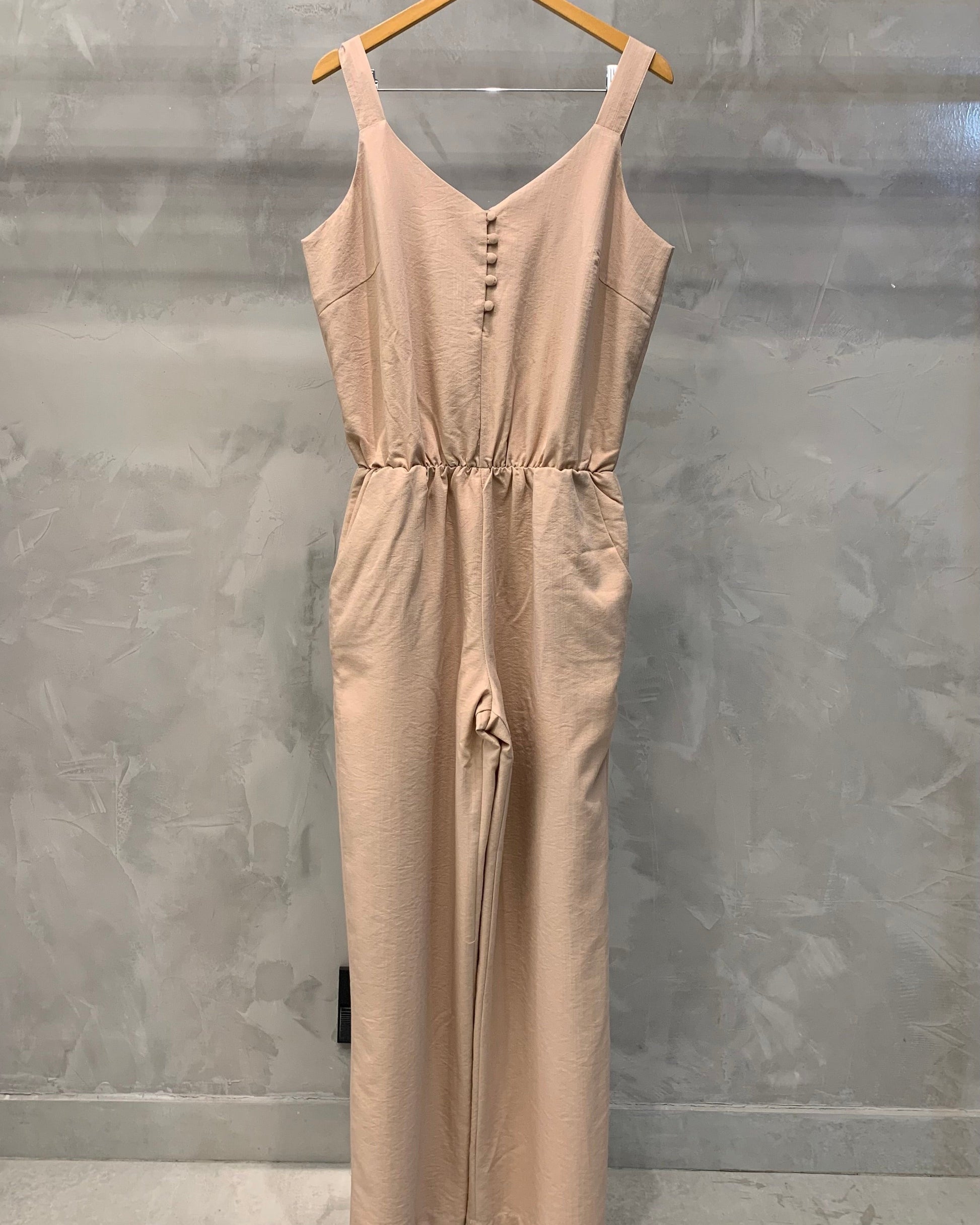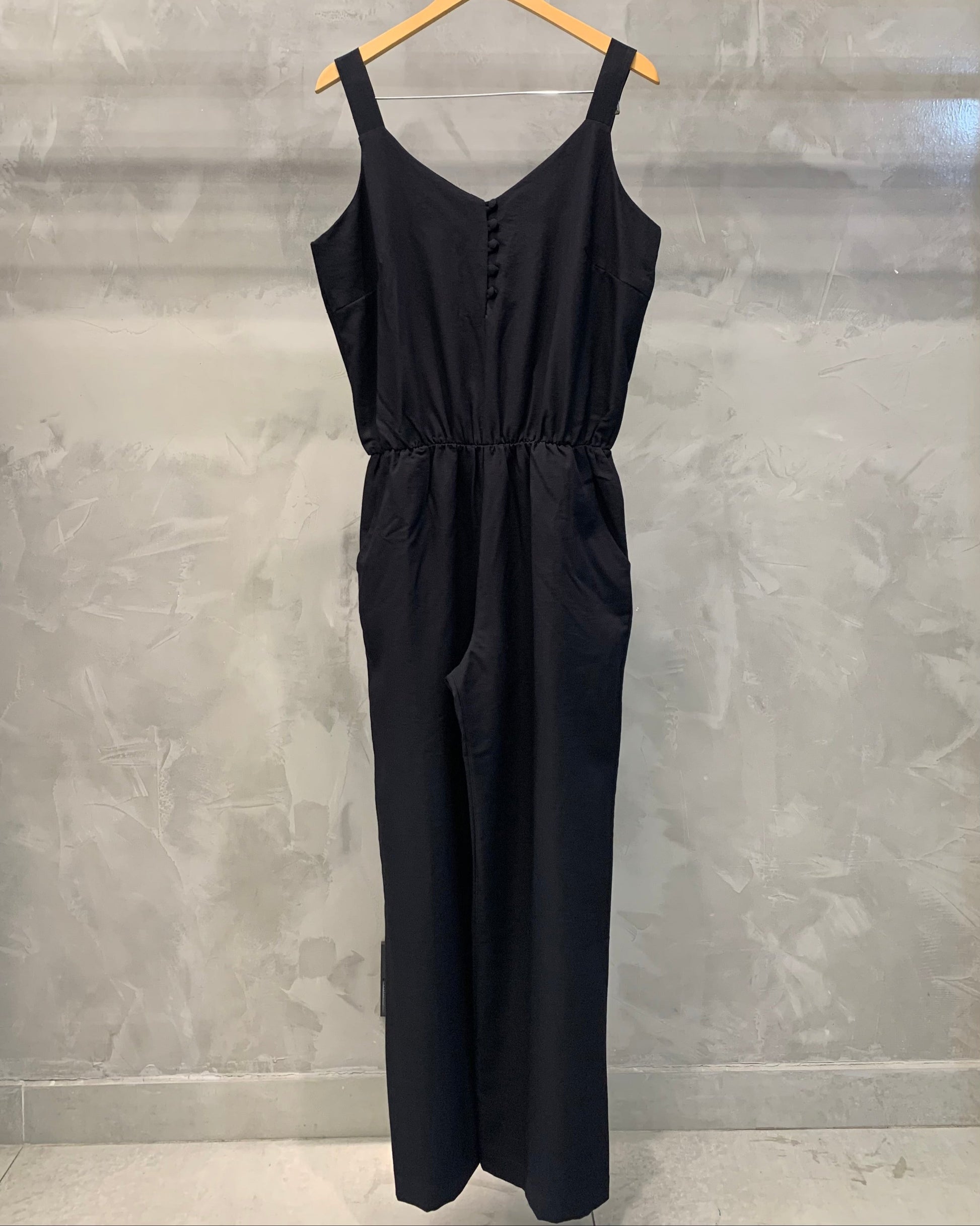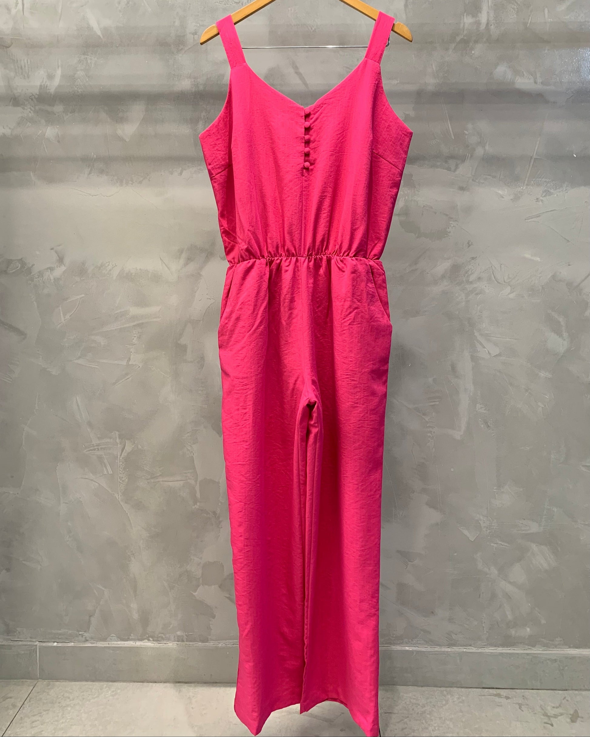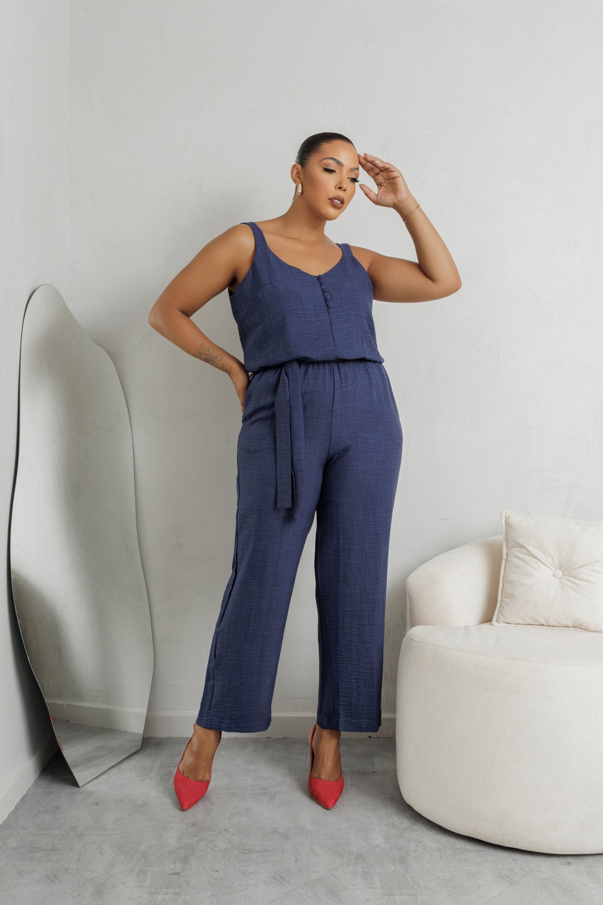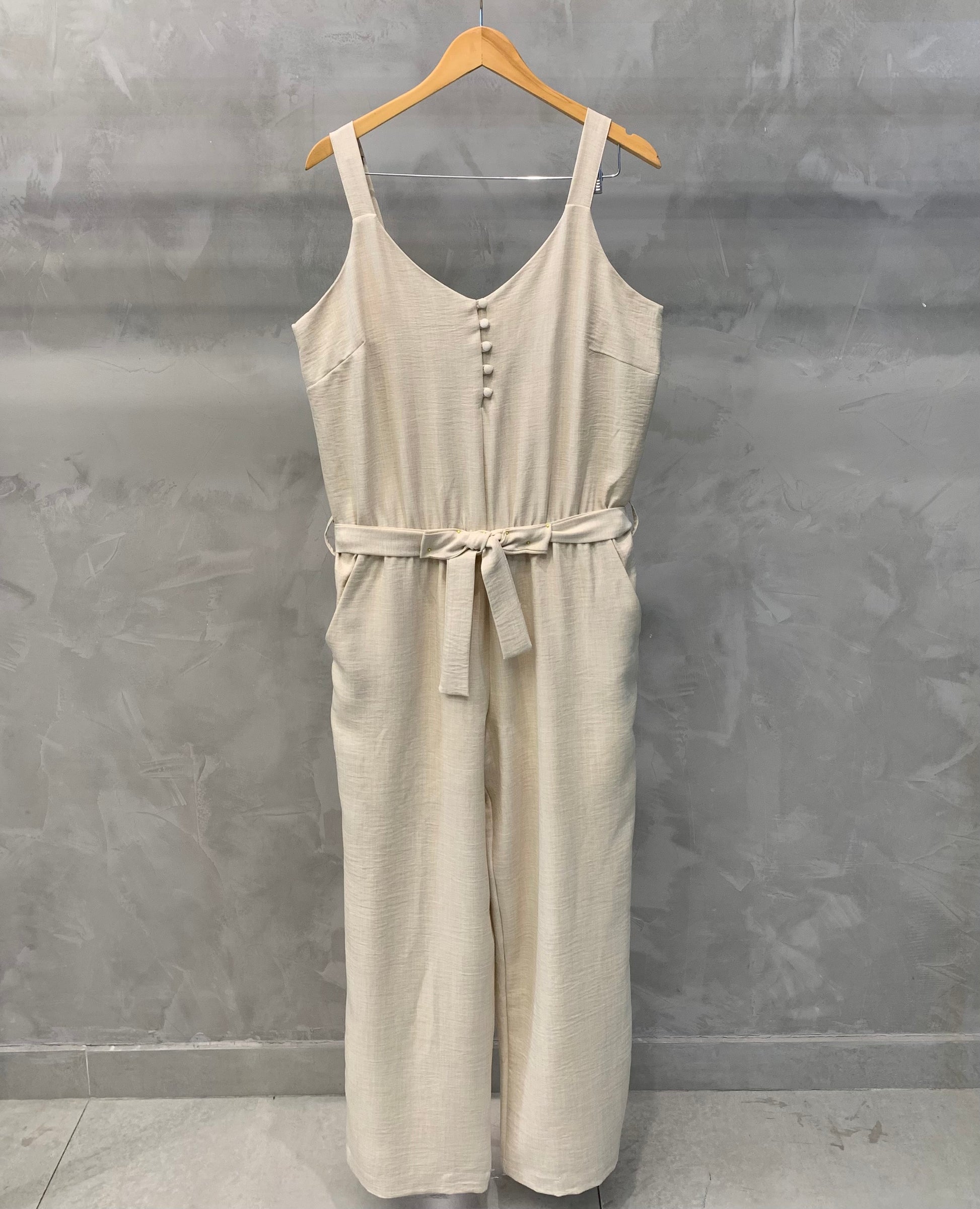 Macacão plus size alça larga com faixa na cintura e decote com botões forrados.